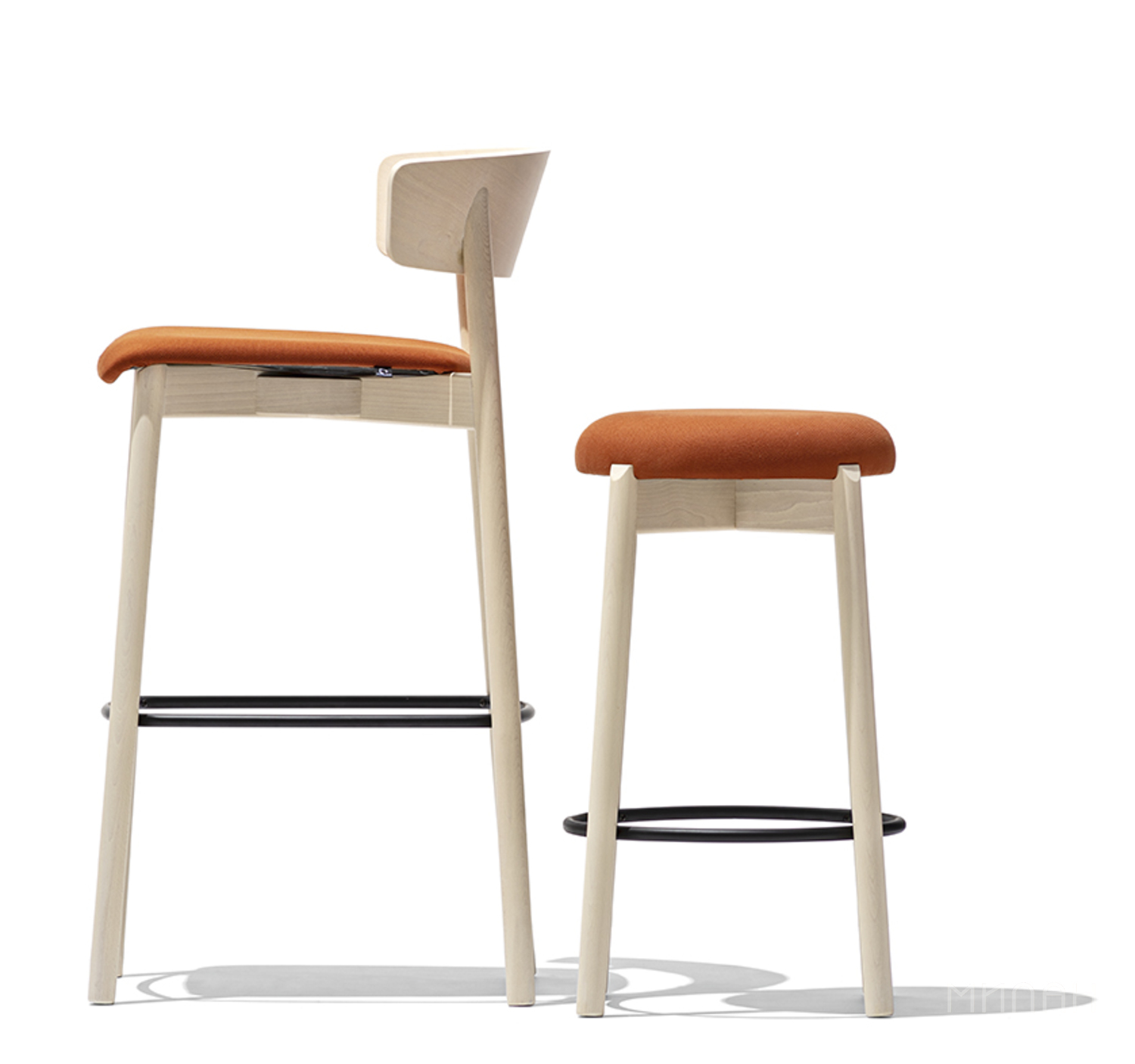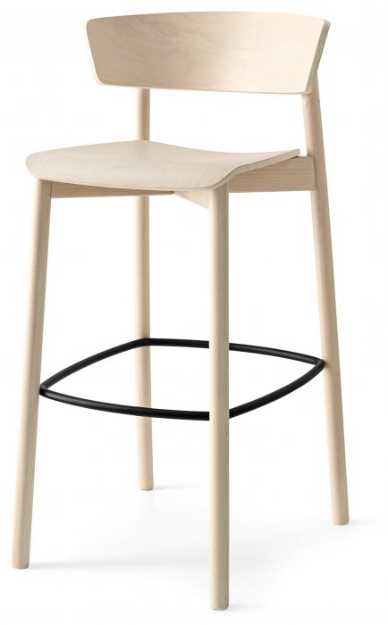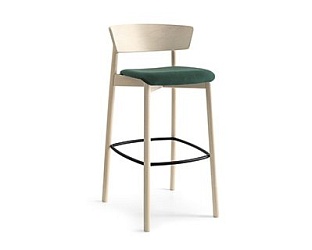 Сидение мягкое. Цилиндрические ножки и спинка сделаны в тон основанию. Металлическая подставка для ног.