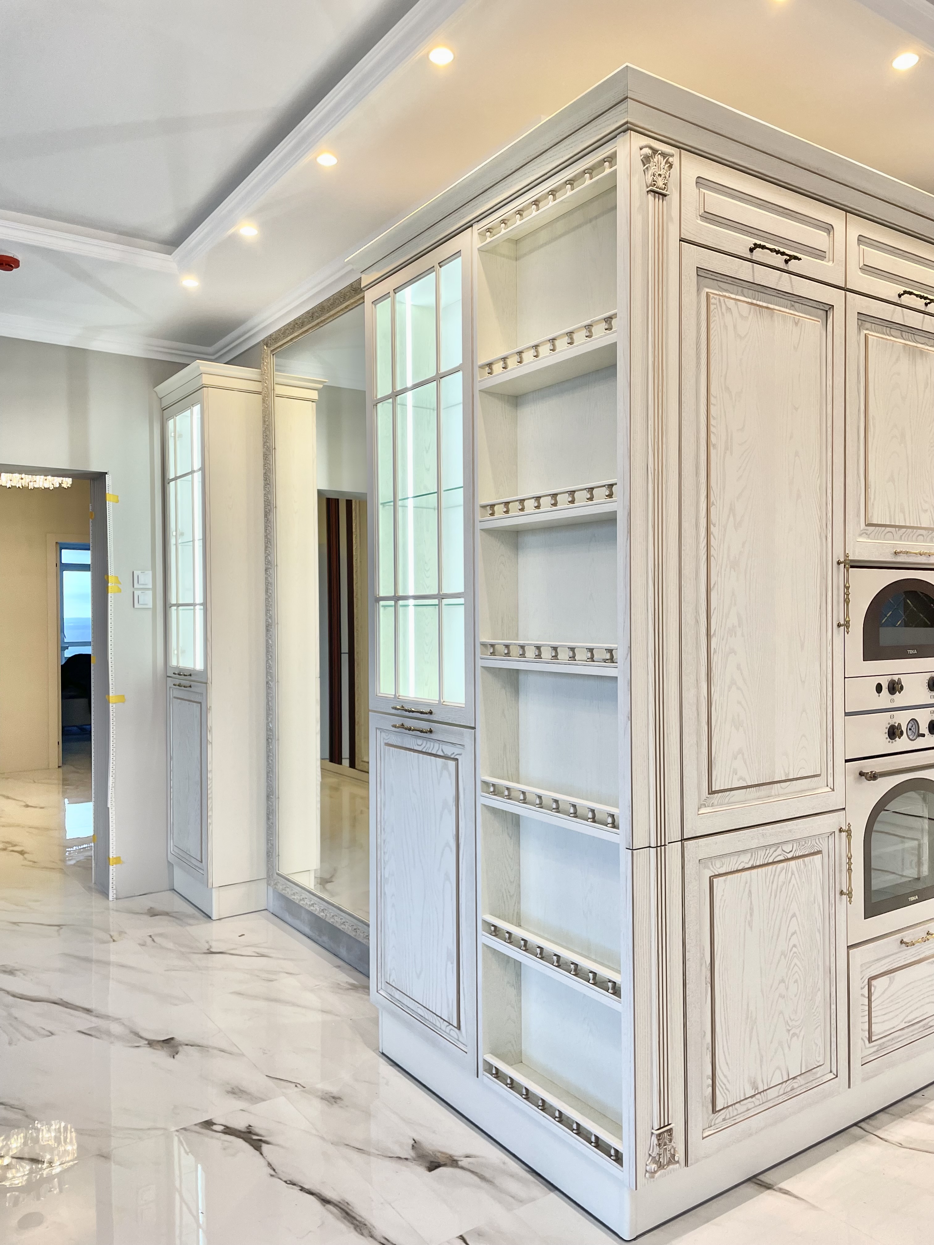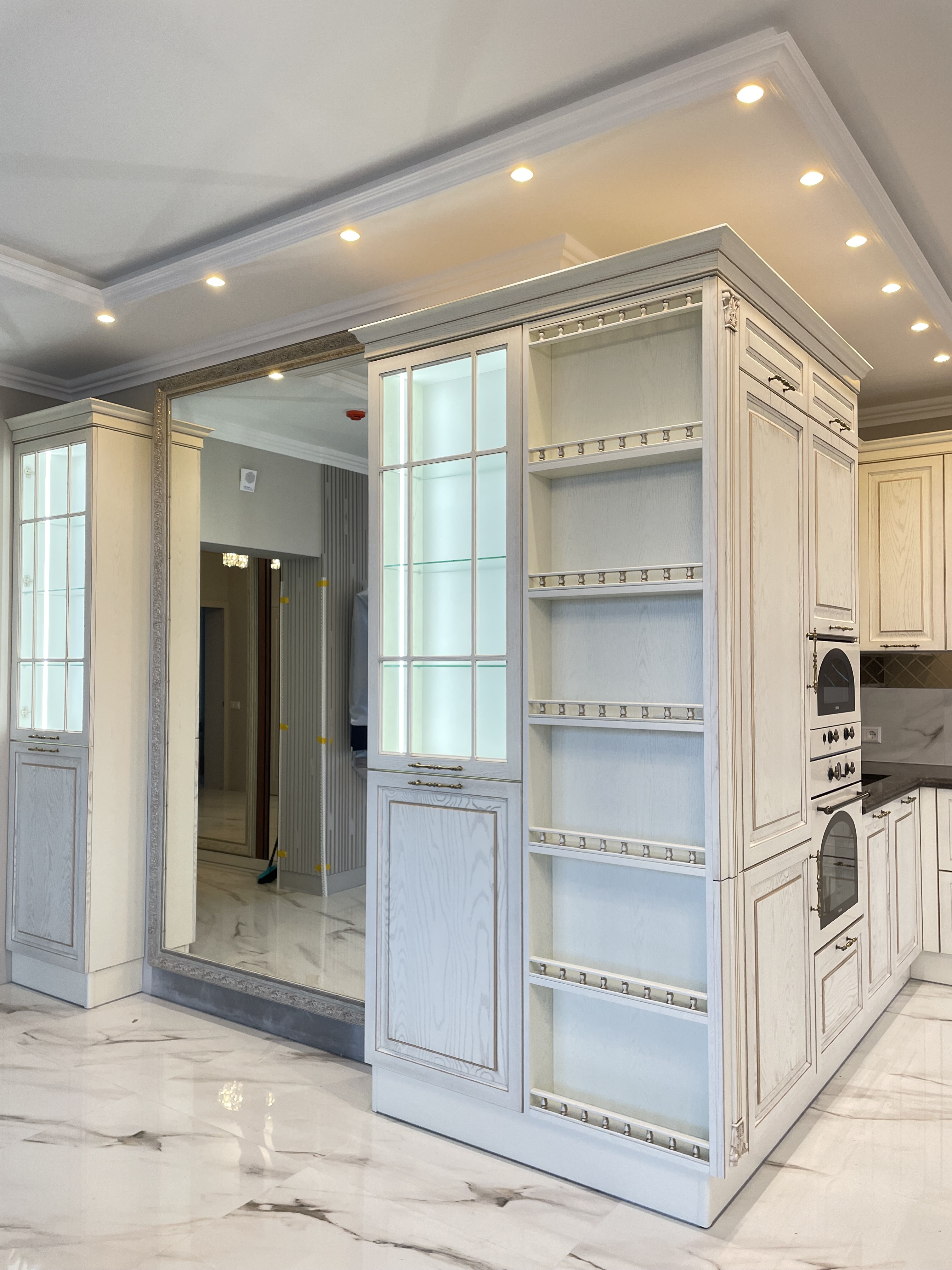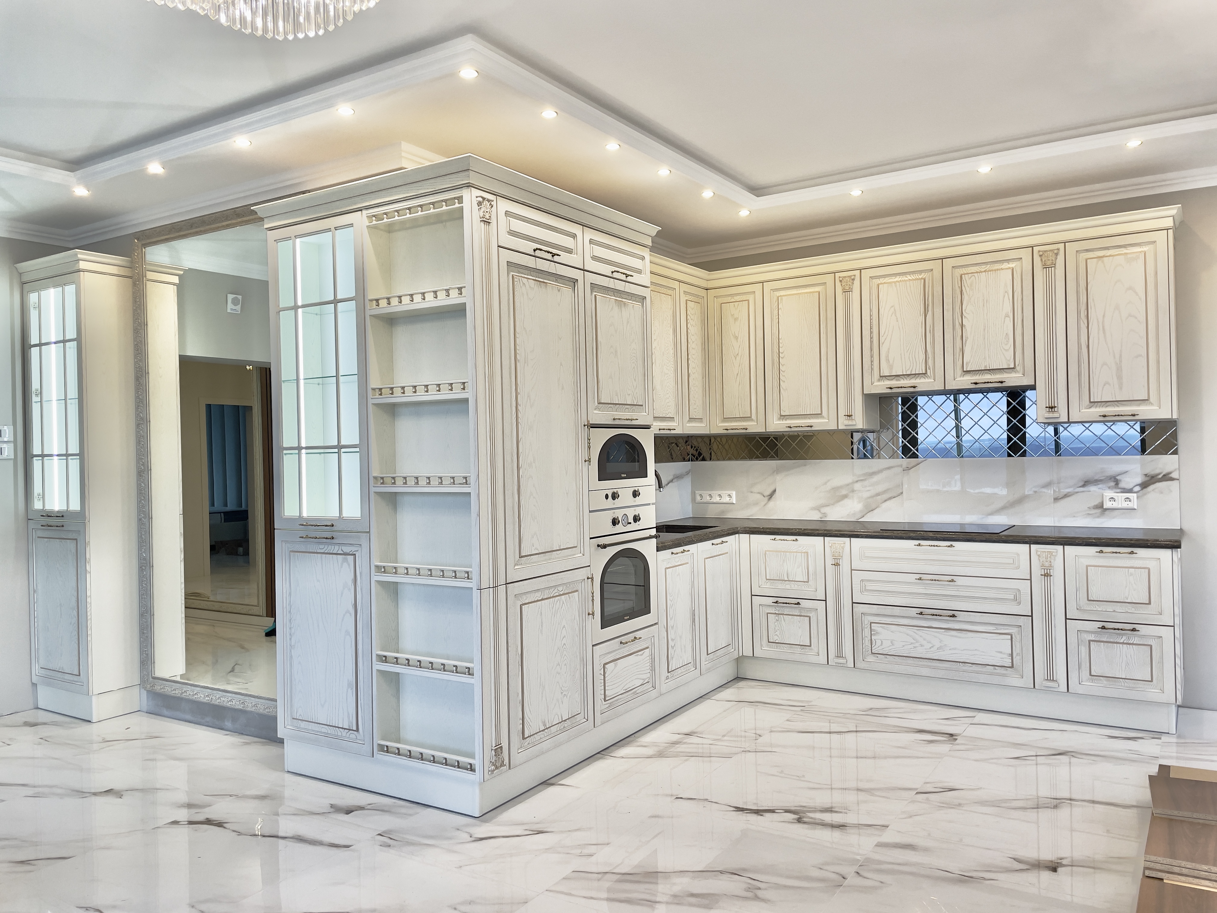 Нестандартная планировка кухни, переходящая в гостиную, где расположились две ажурные витрины с подсветкой, раскрыла пространство и объем большого помещения.