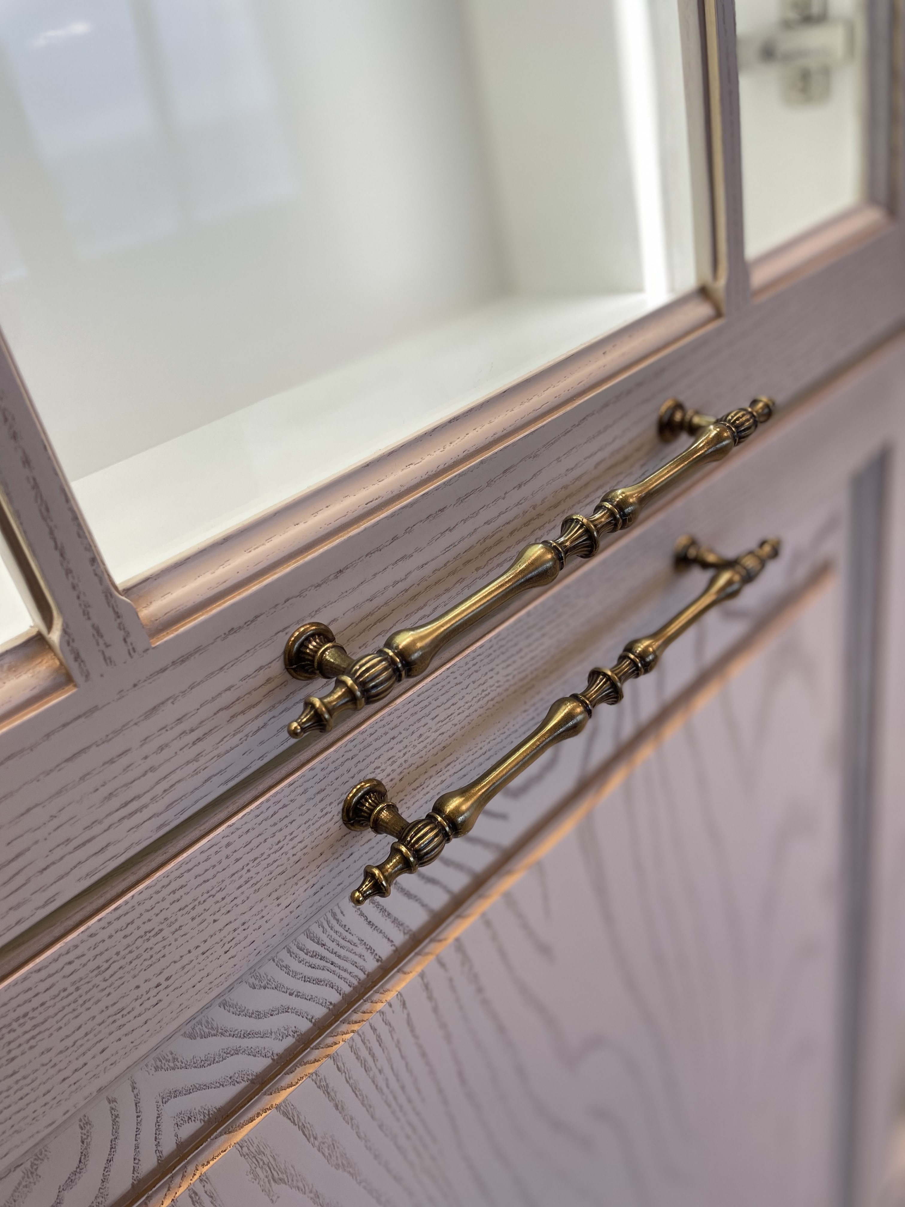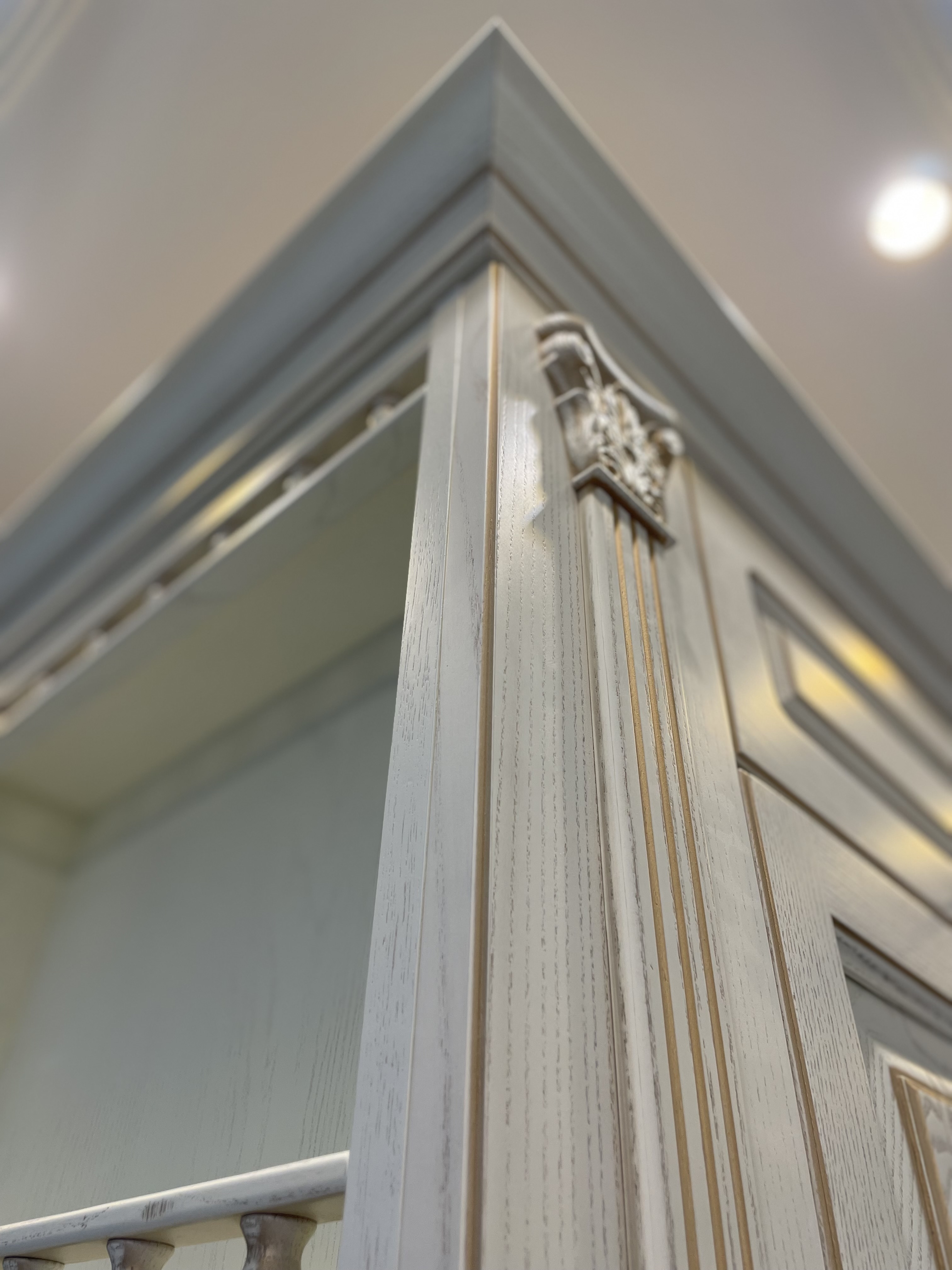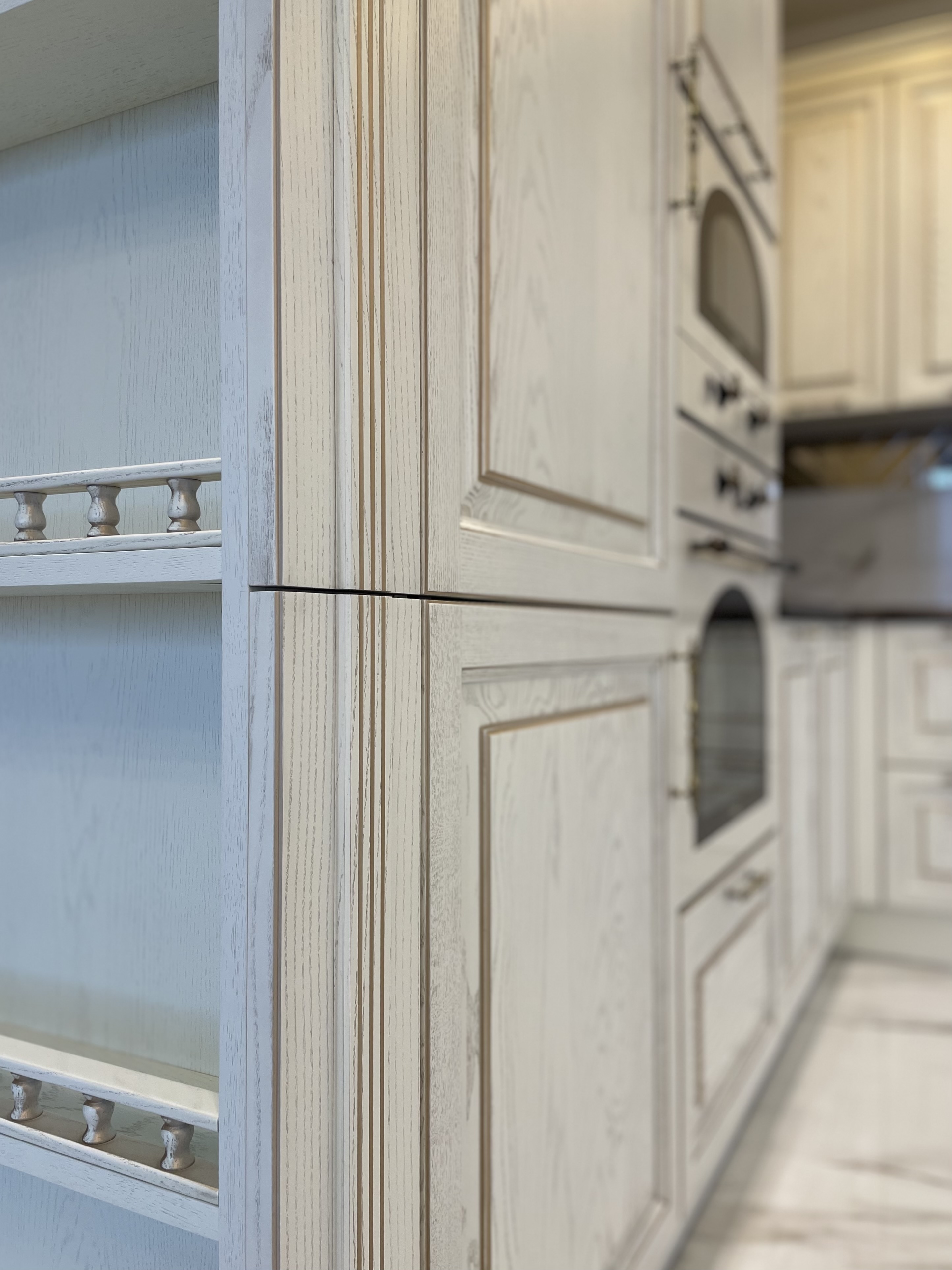 В проекте использованы декоративные пилястры, красивая балюстрада на шпонированных полках, так же высокий карниз с классическим профилем, который завершает образ кухни.