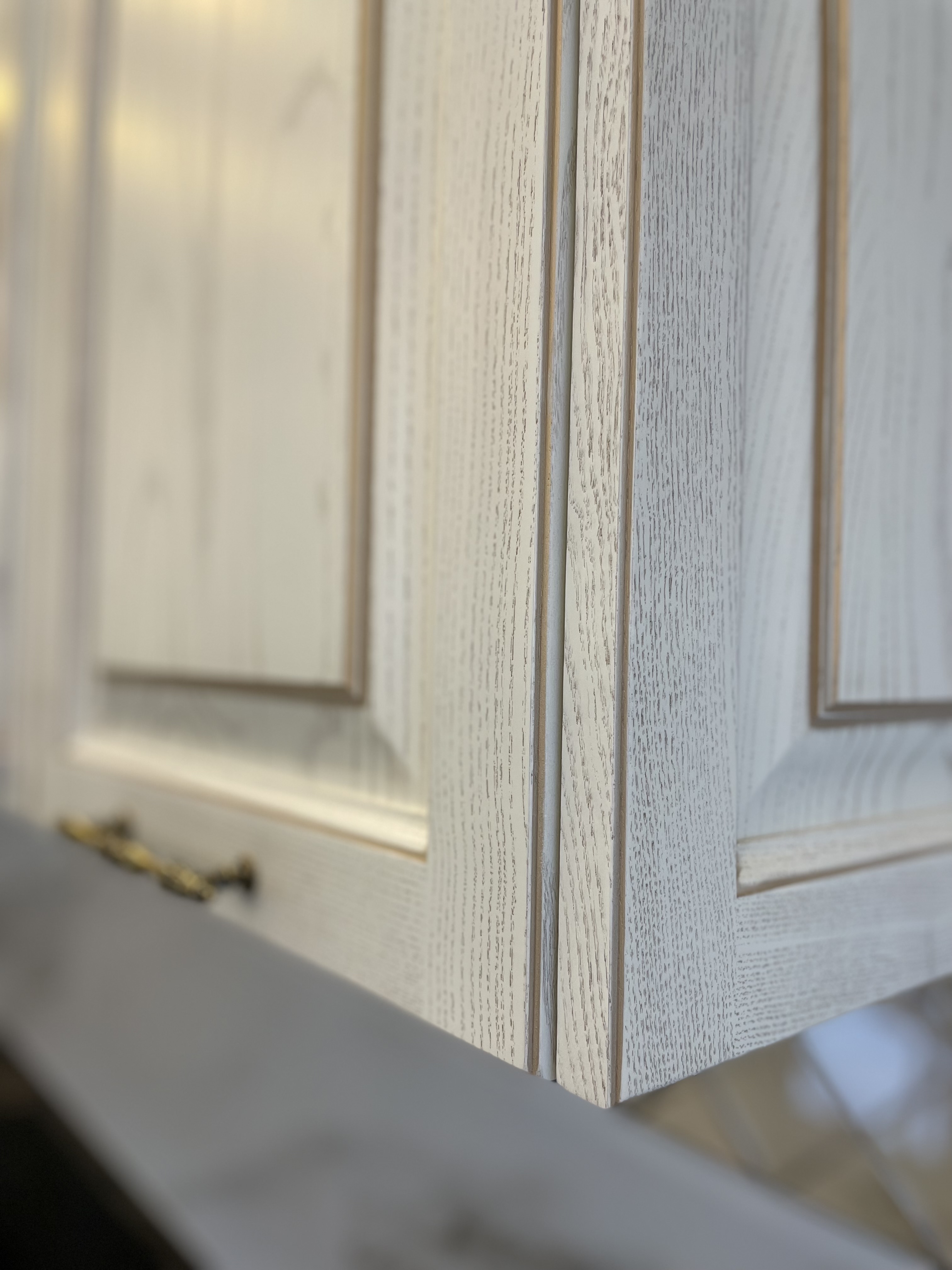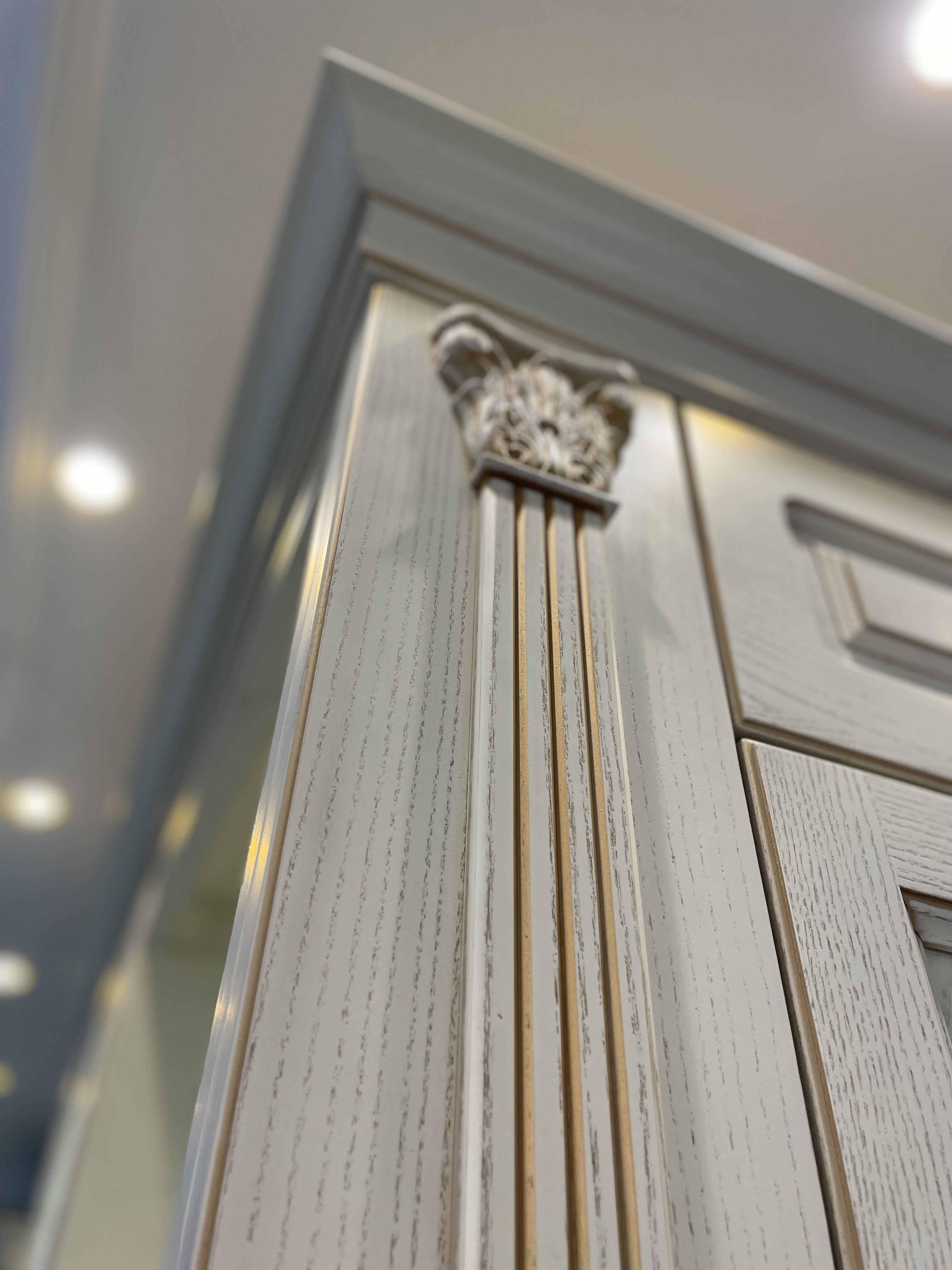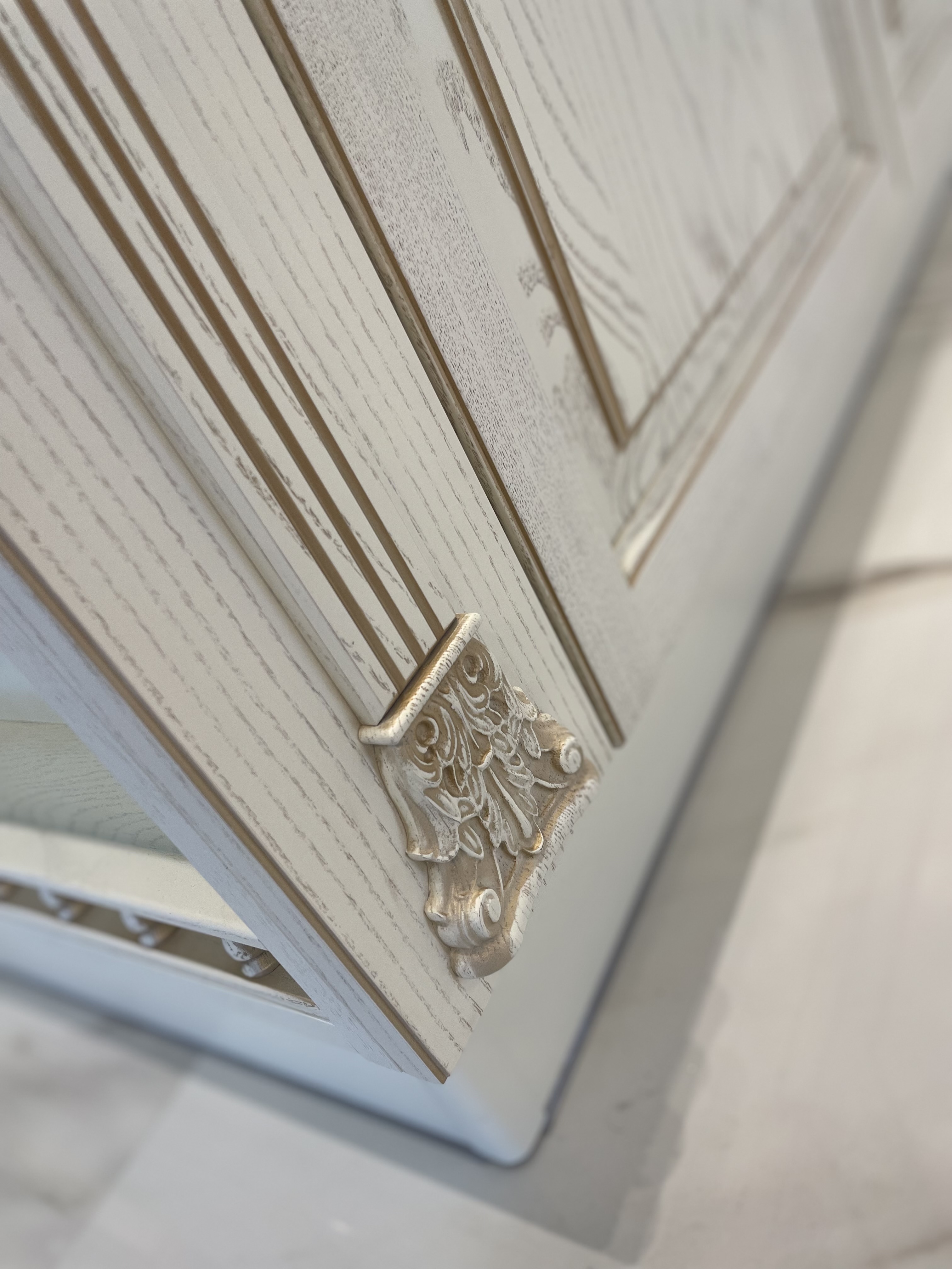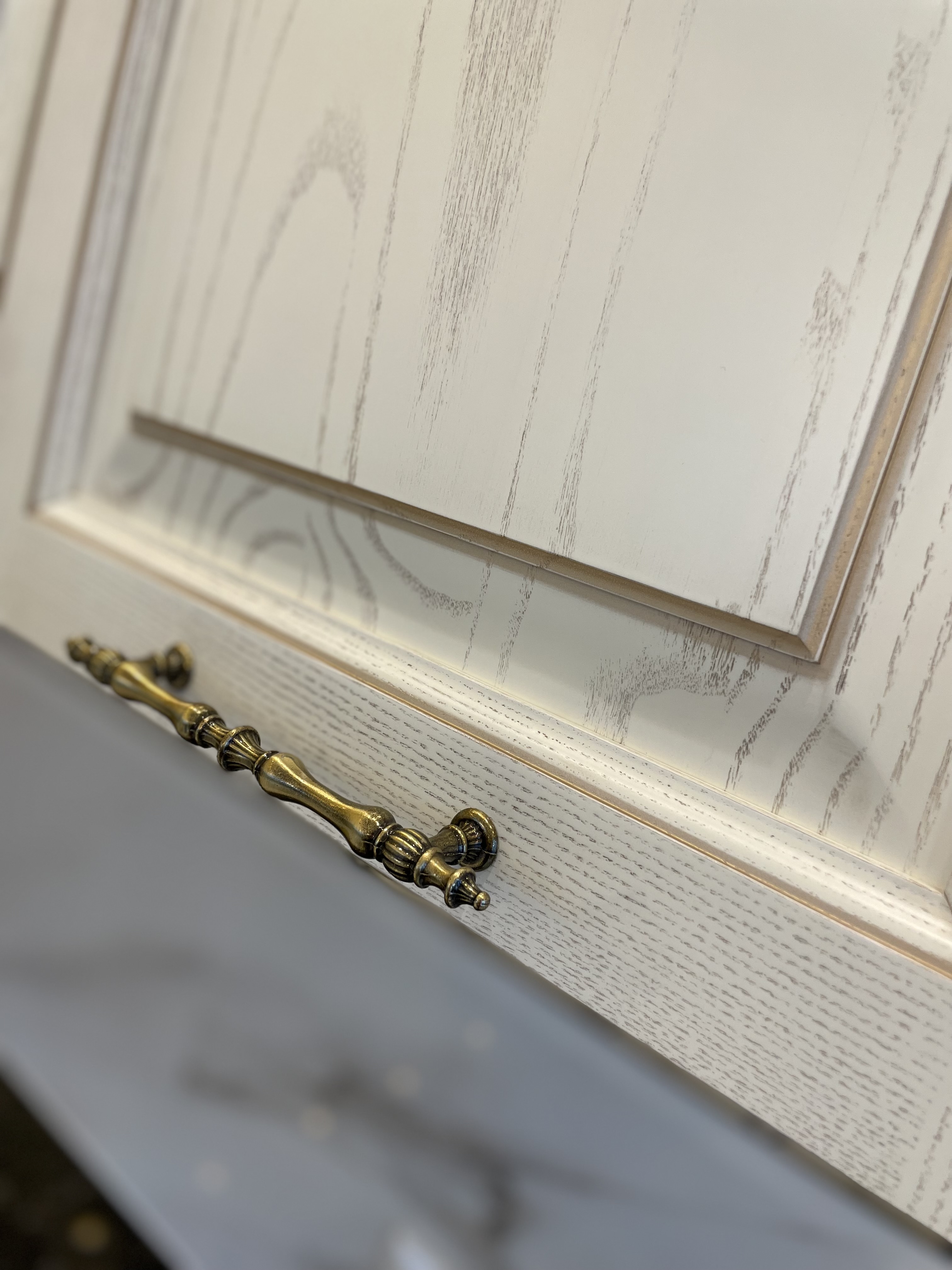 В проекте использованы декоративные пилястры, красивая балюстрада на шпонированных полках, так же высокий карниз с классическим профилем, который завершает образ кухни.