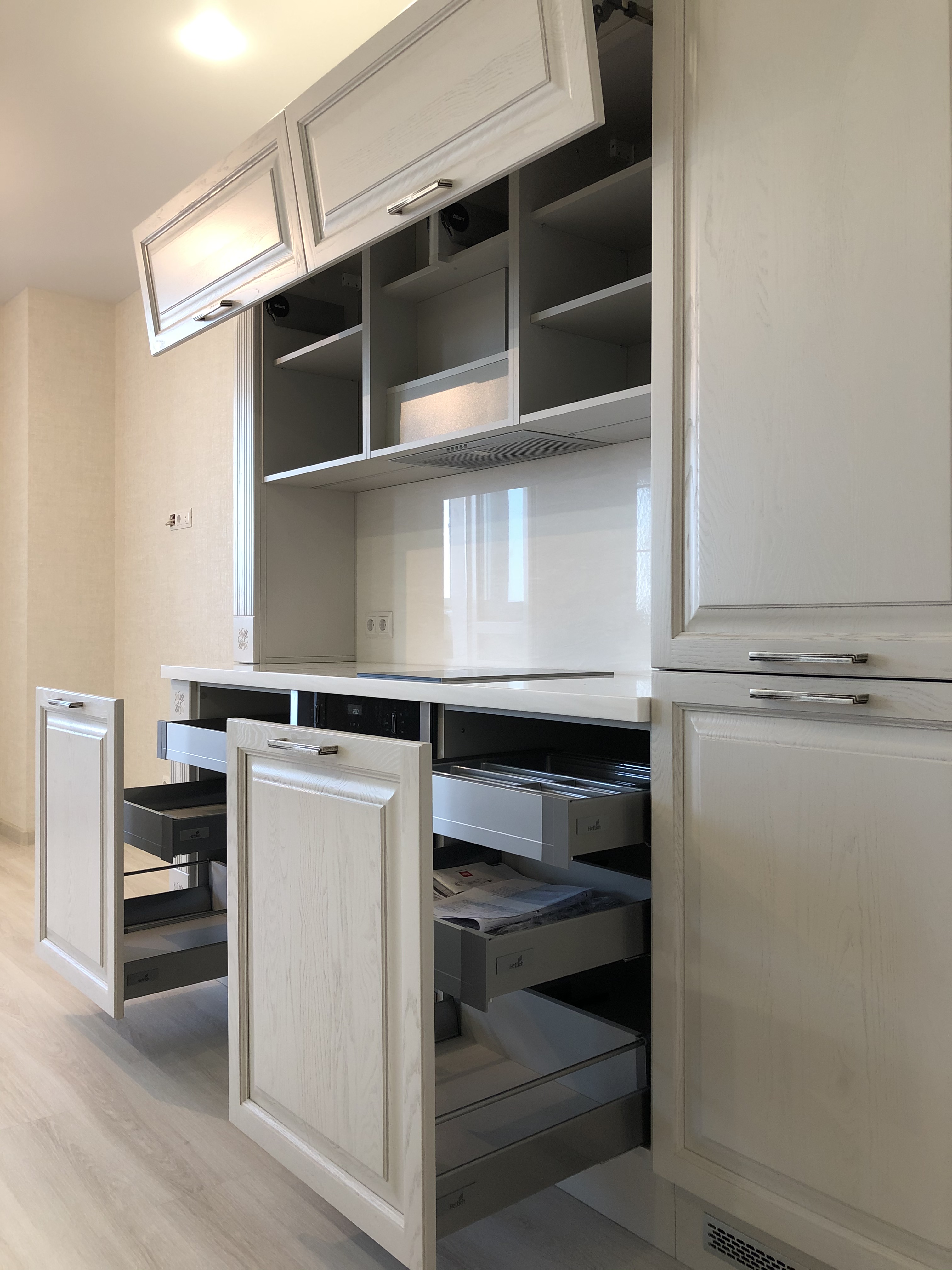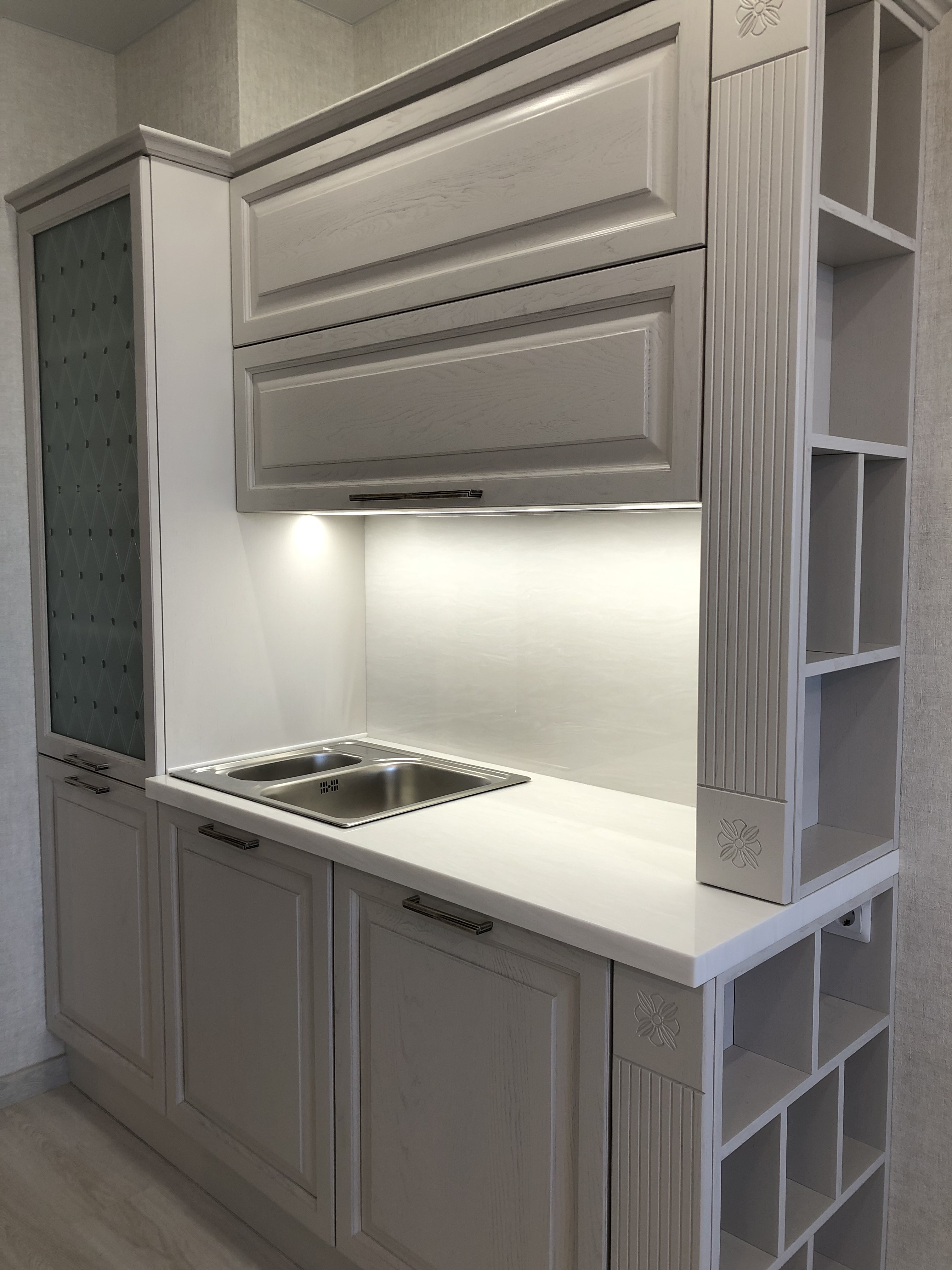 Сложная и красивая кухня Милана с параллельной планировкой напоминает камбузную кухню, где разделена зона воды и зона огня. Интересный и практичный ход при проектировании кухни