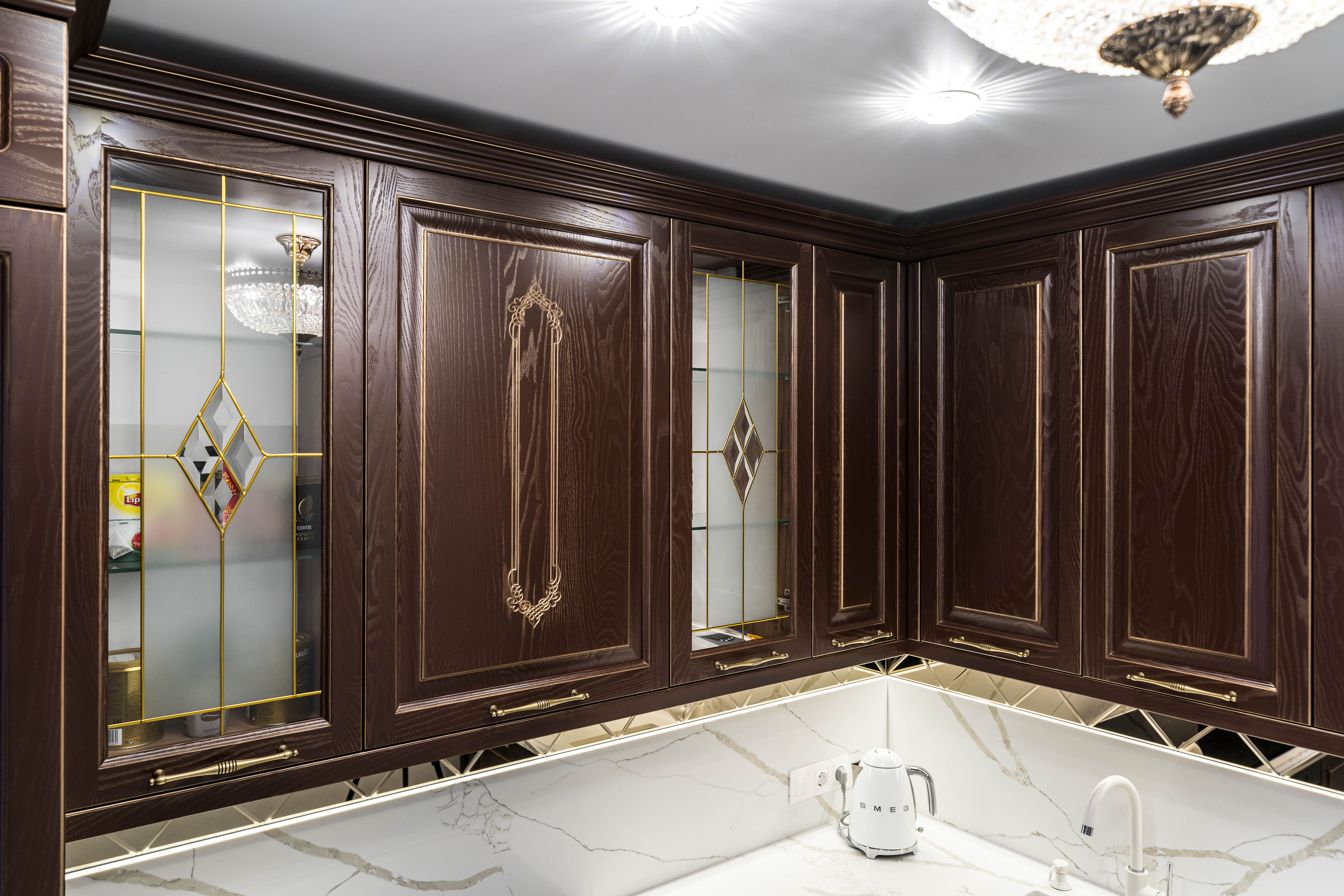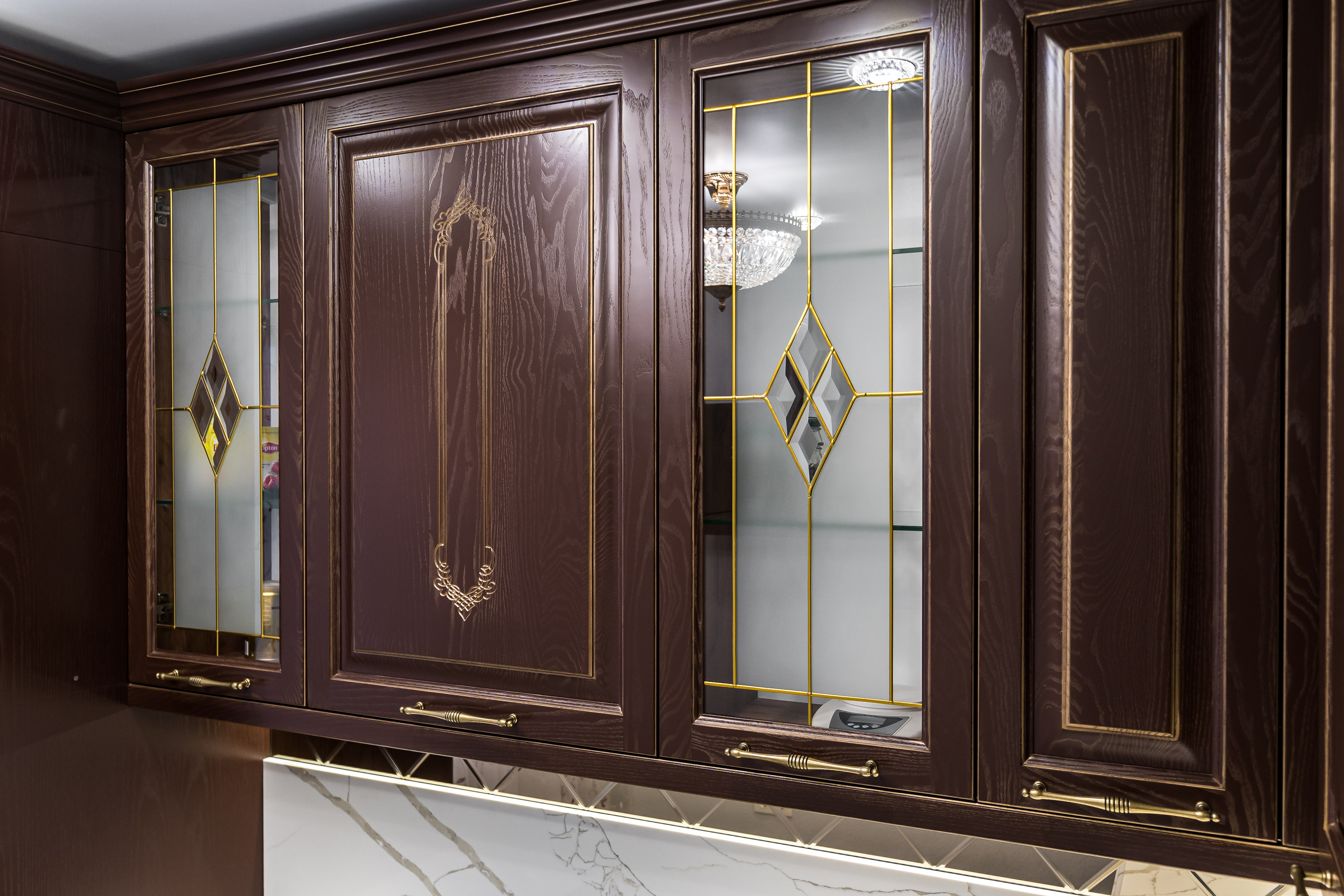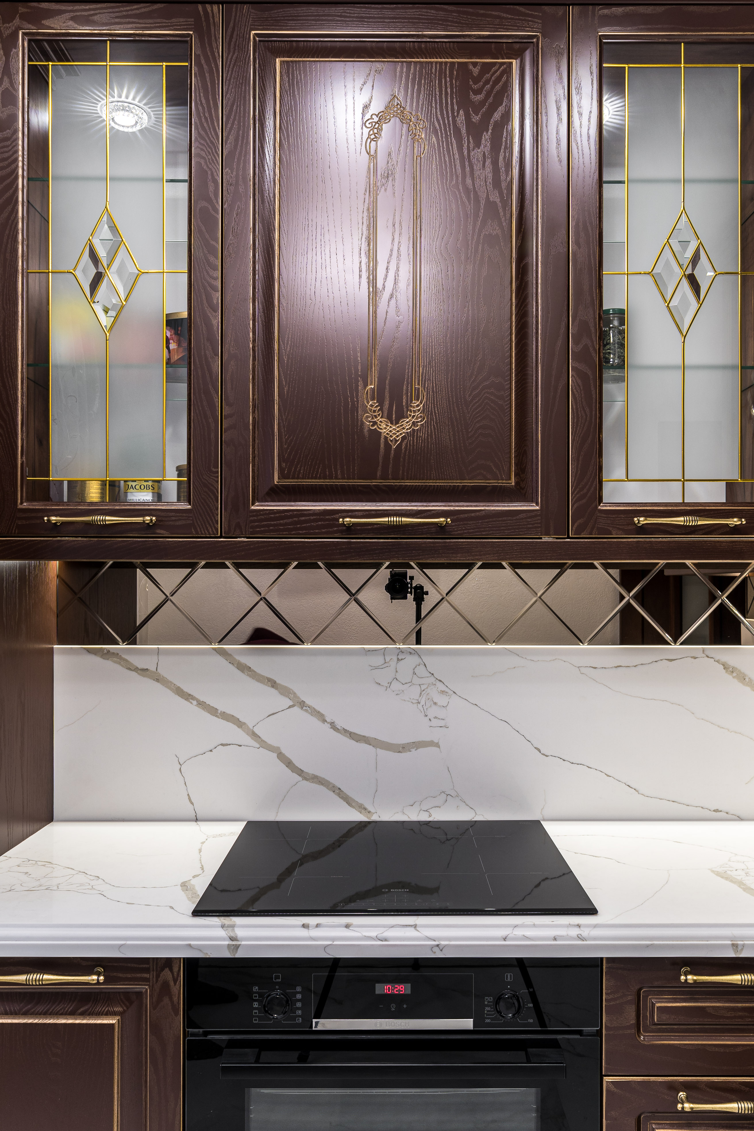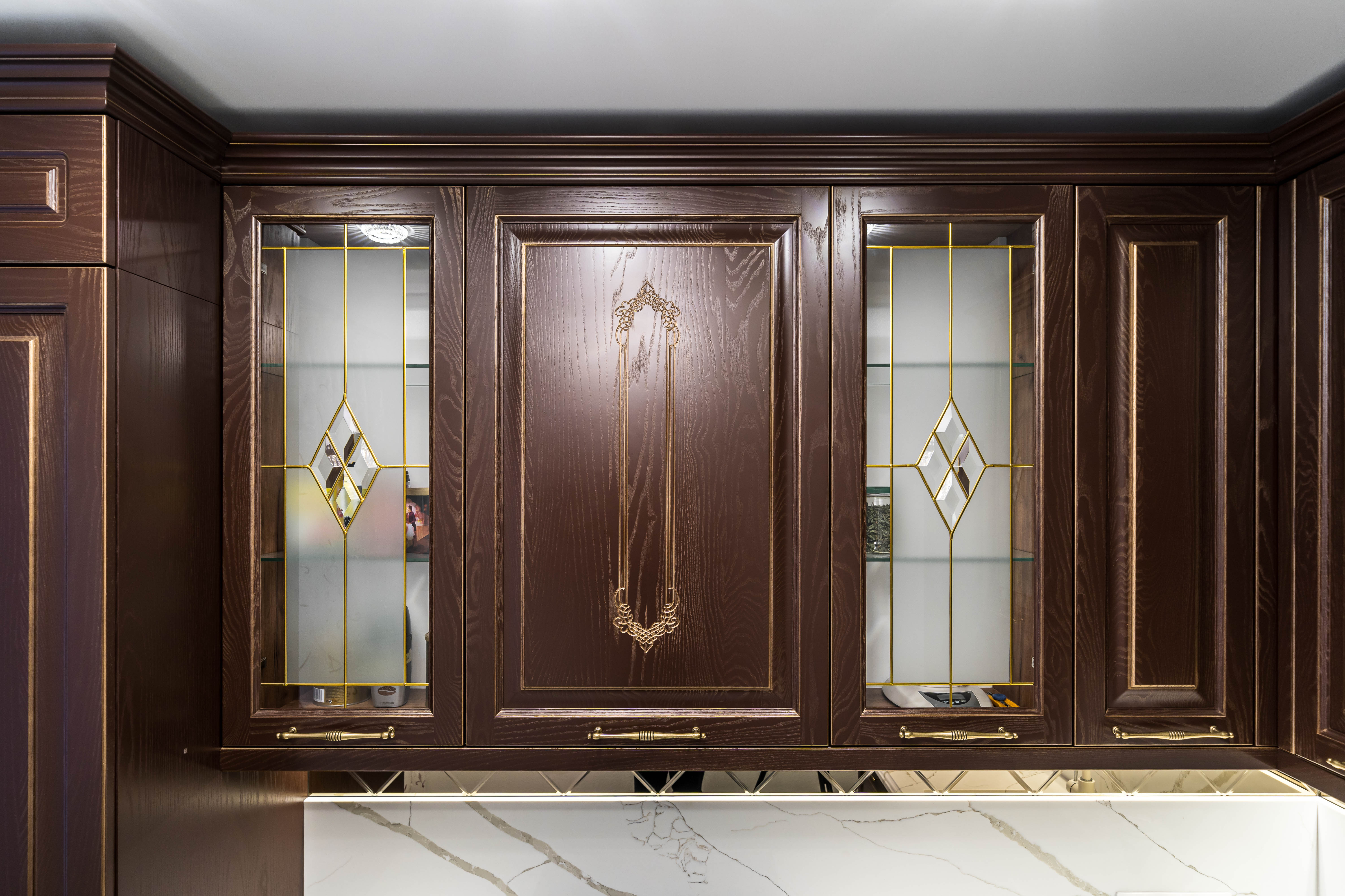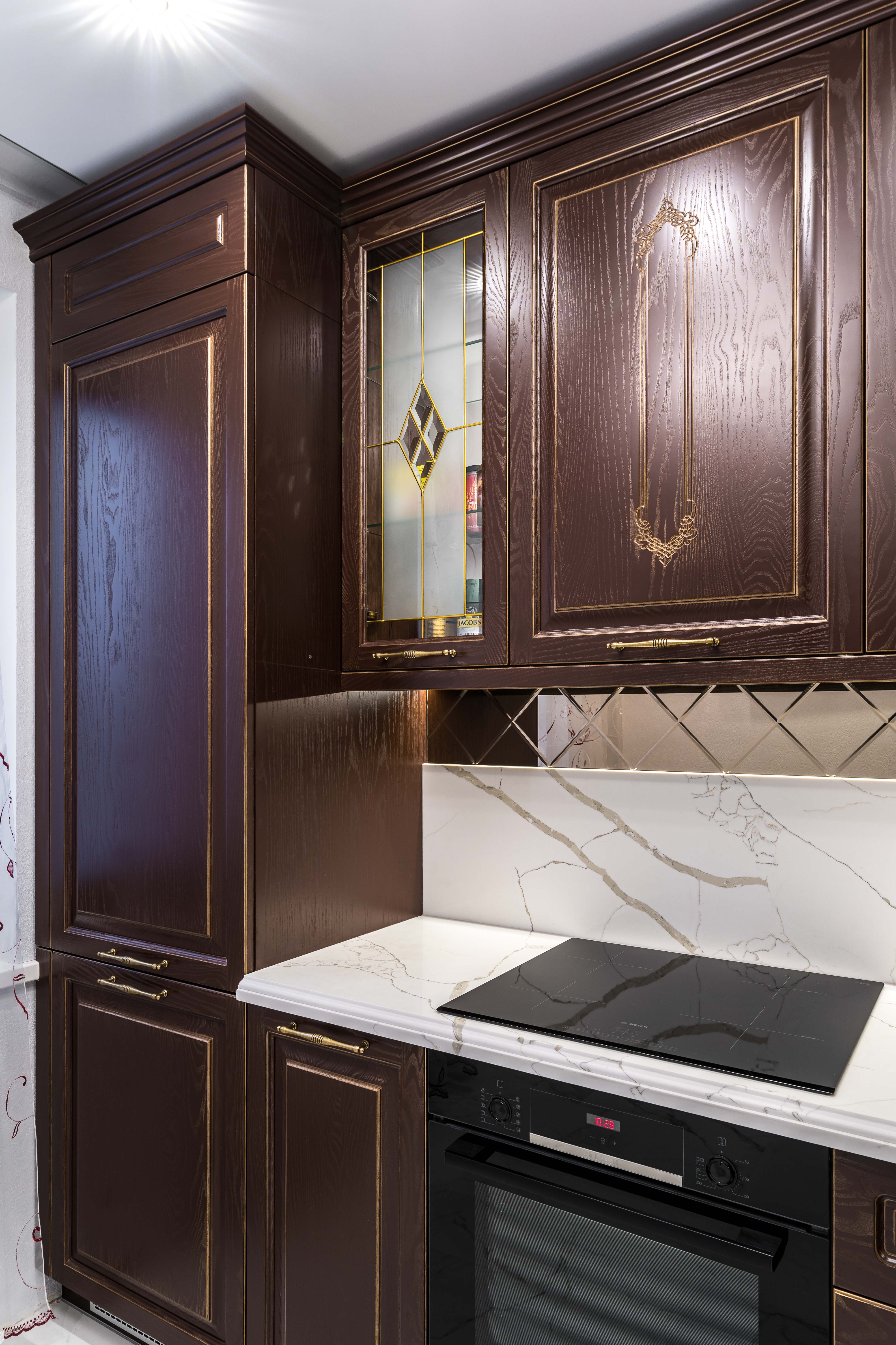 Фасад кухни выполнен из крашенного массива ясеня с нанесением золотой патины. Столешница из композита кварца Avant, скинали -композит кварца+фацетированное зеркало.