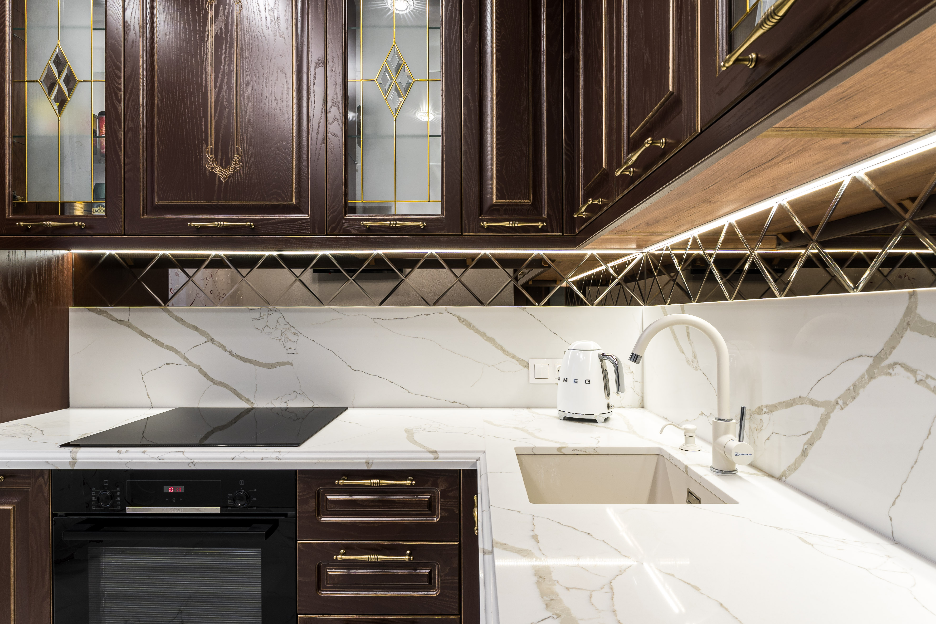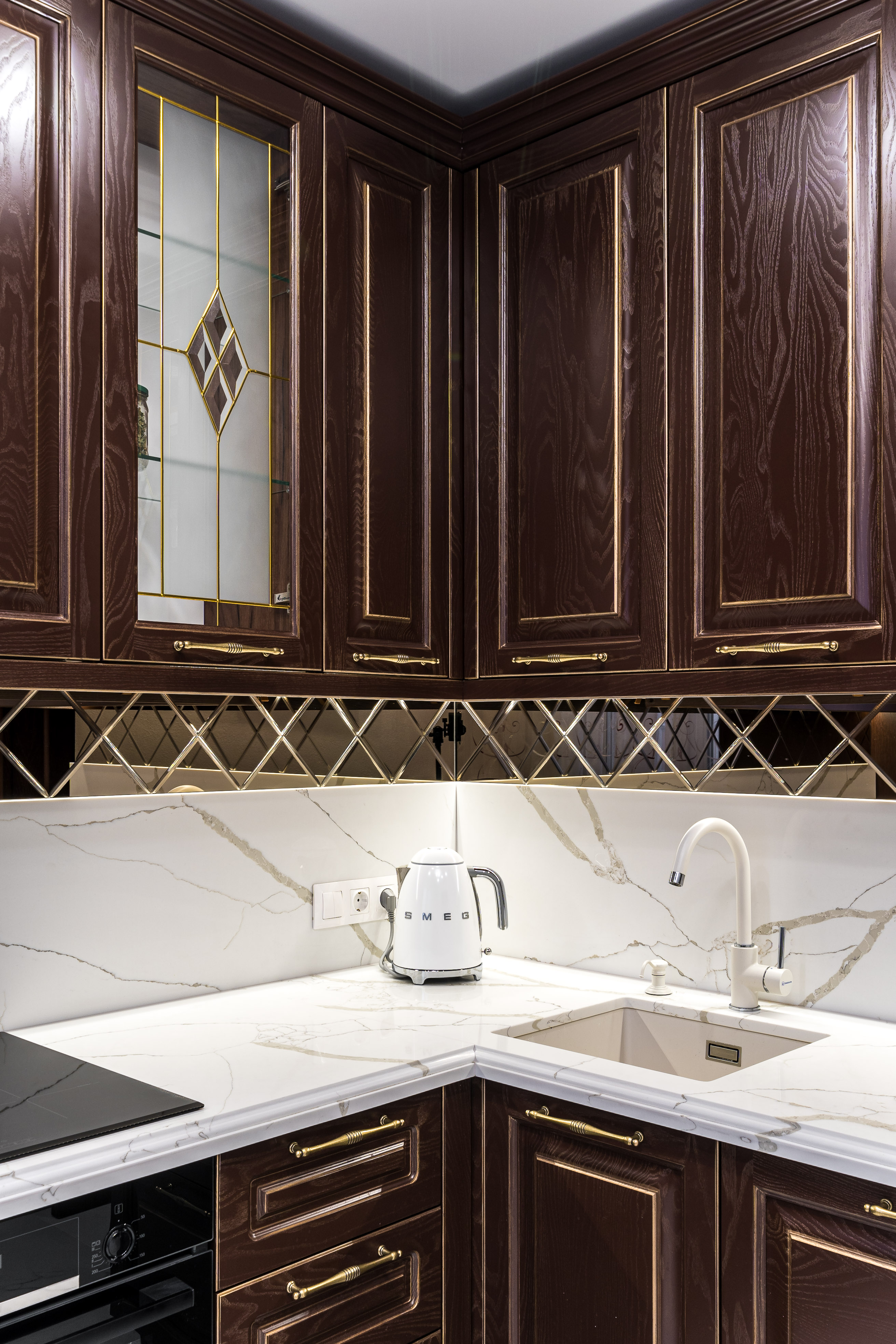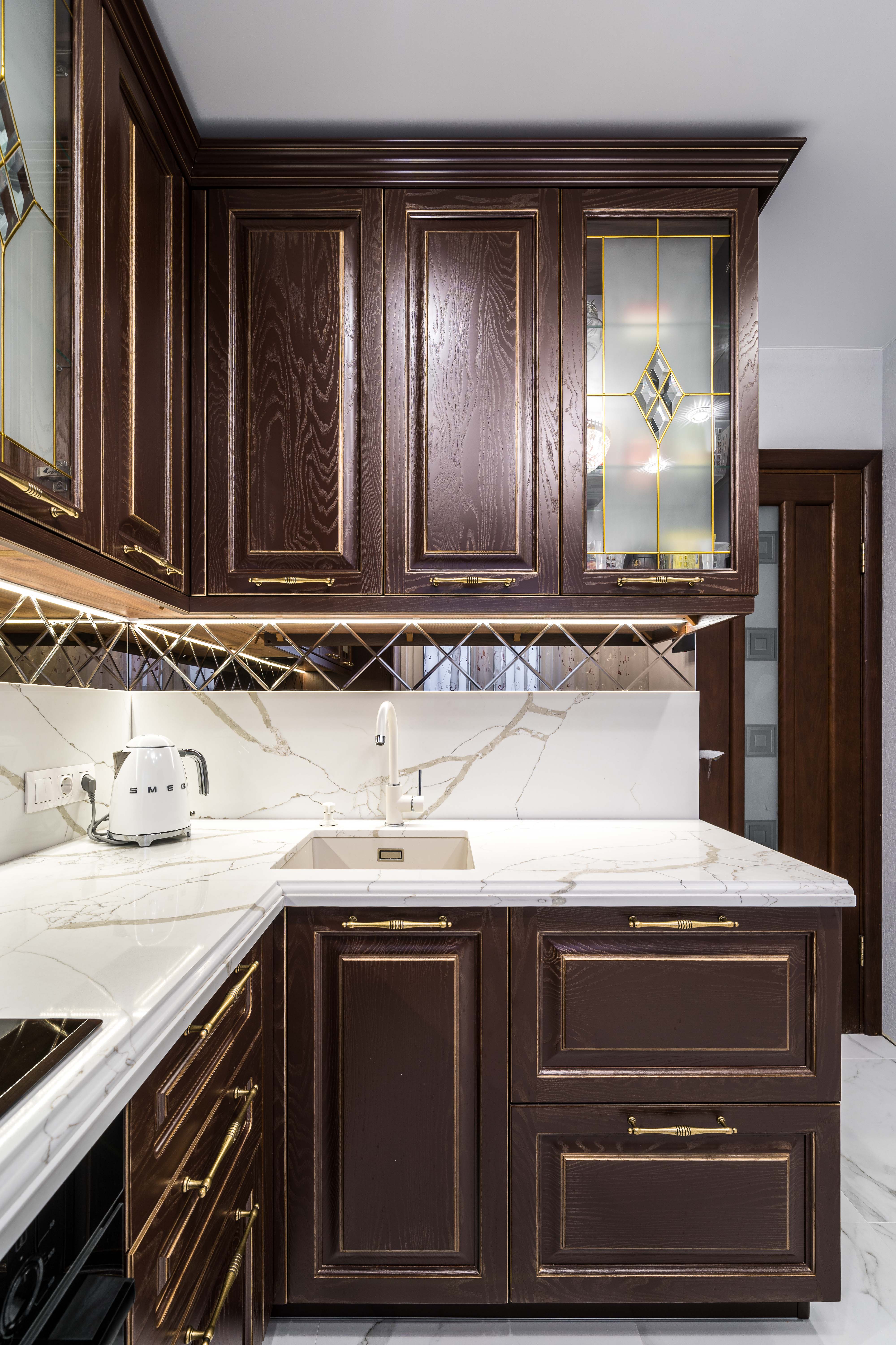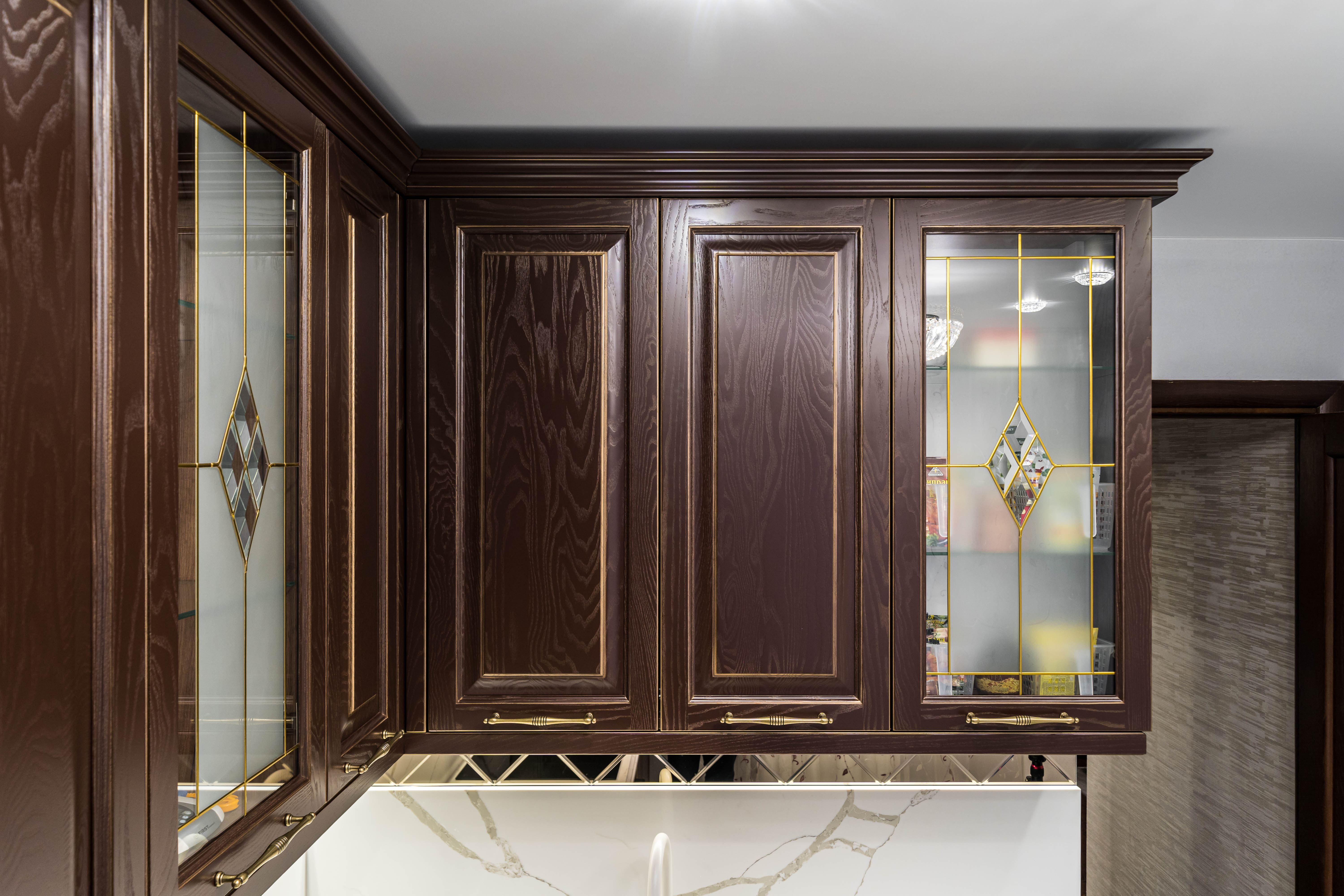 Фасад кухни выполнен из крашенного массива ясеня с нанесением золотой патины. Столешница из композита кварца Avant, скинали -композит кварца+фацетированное зеркало.