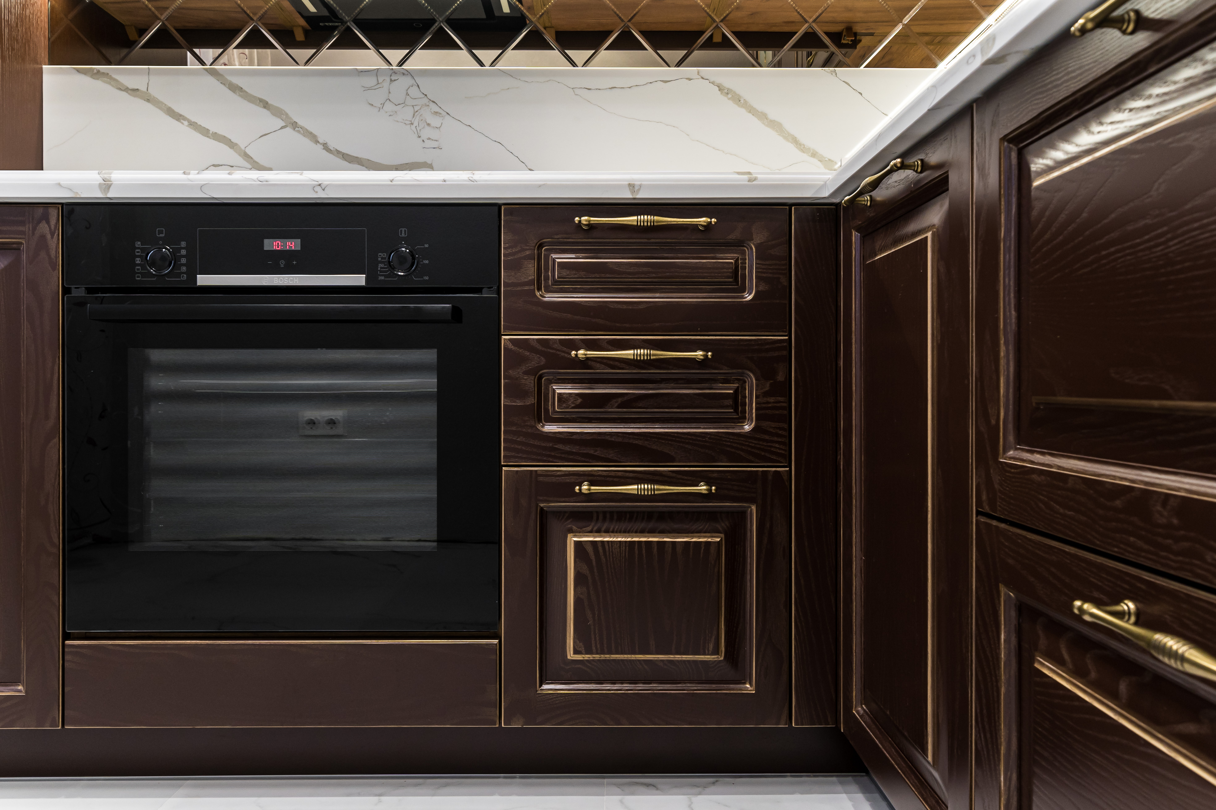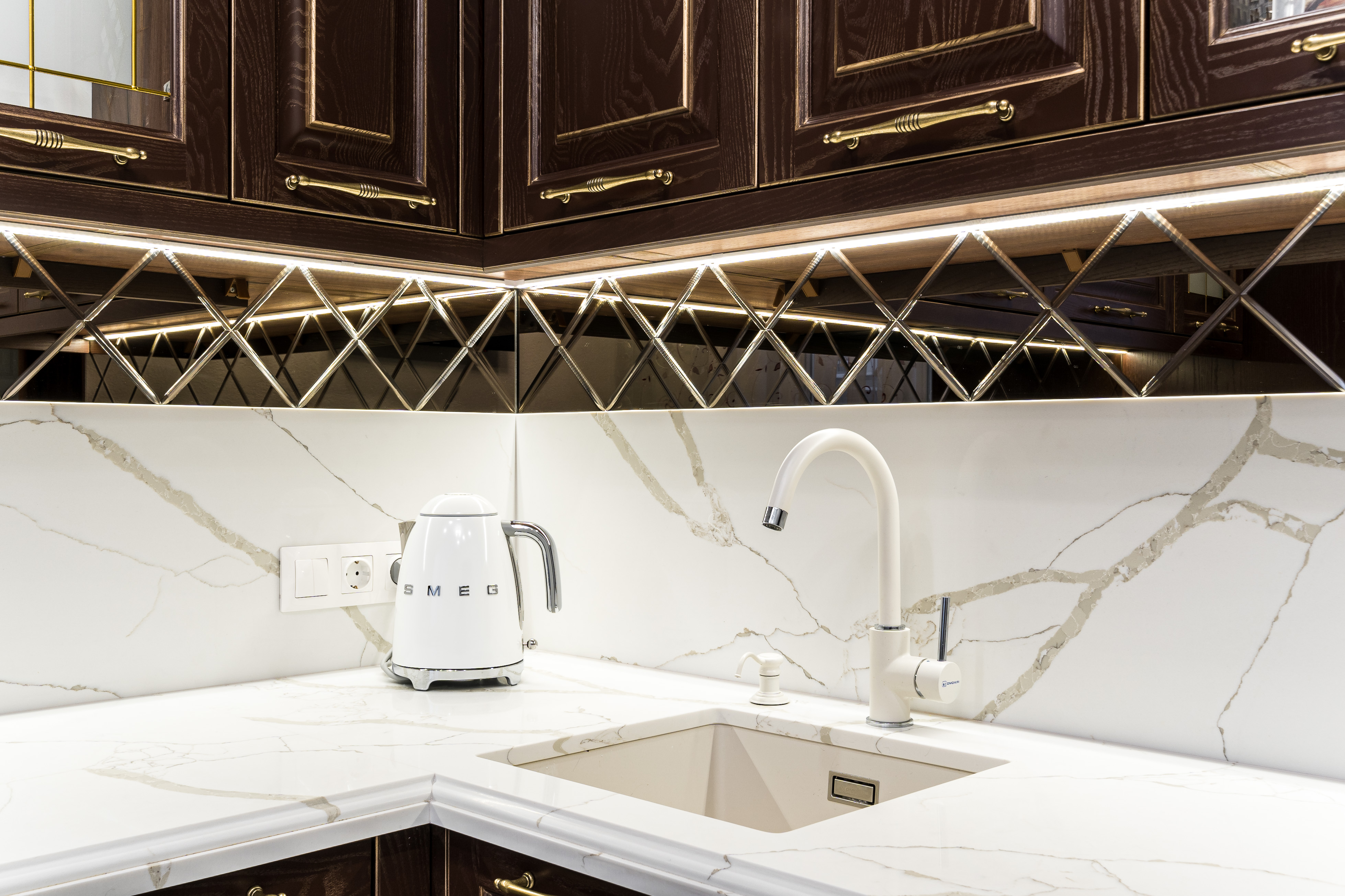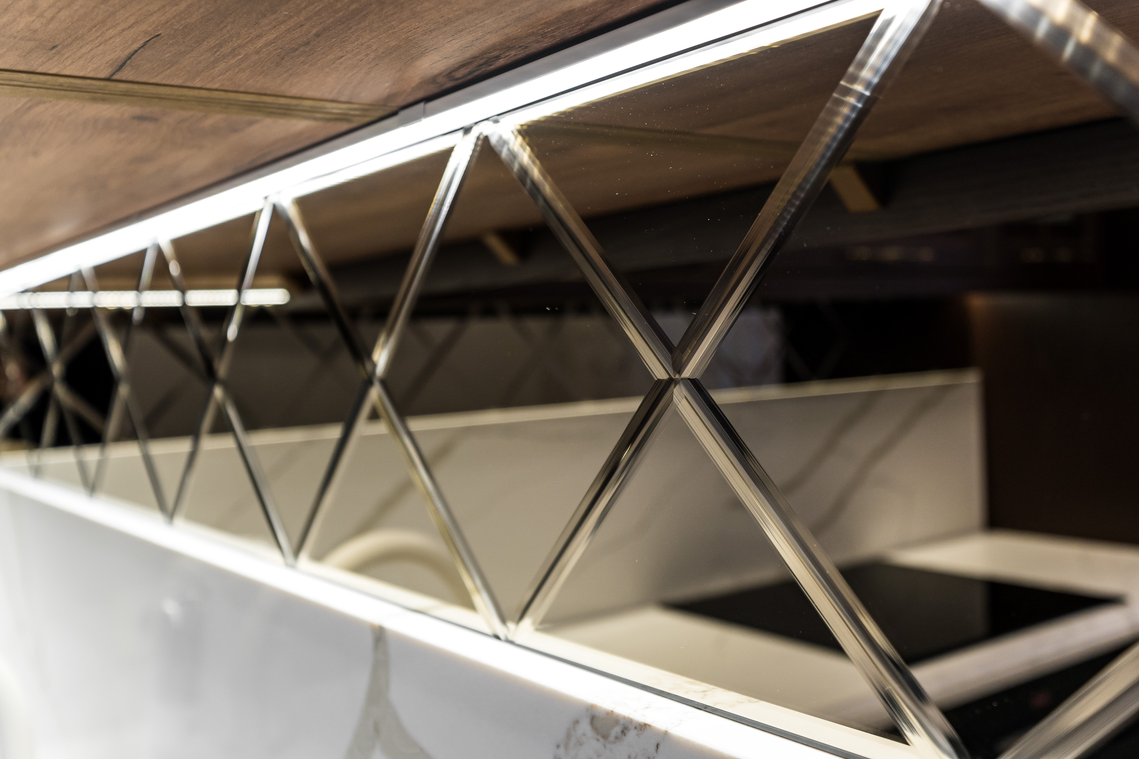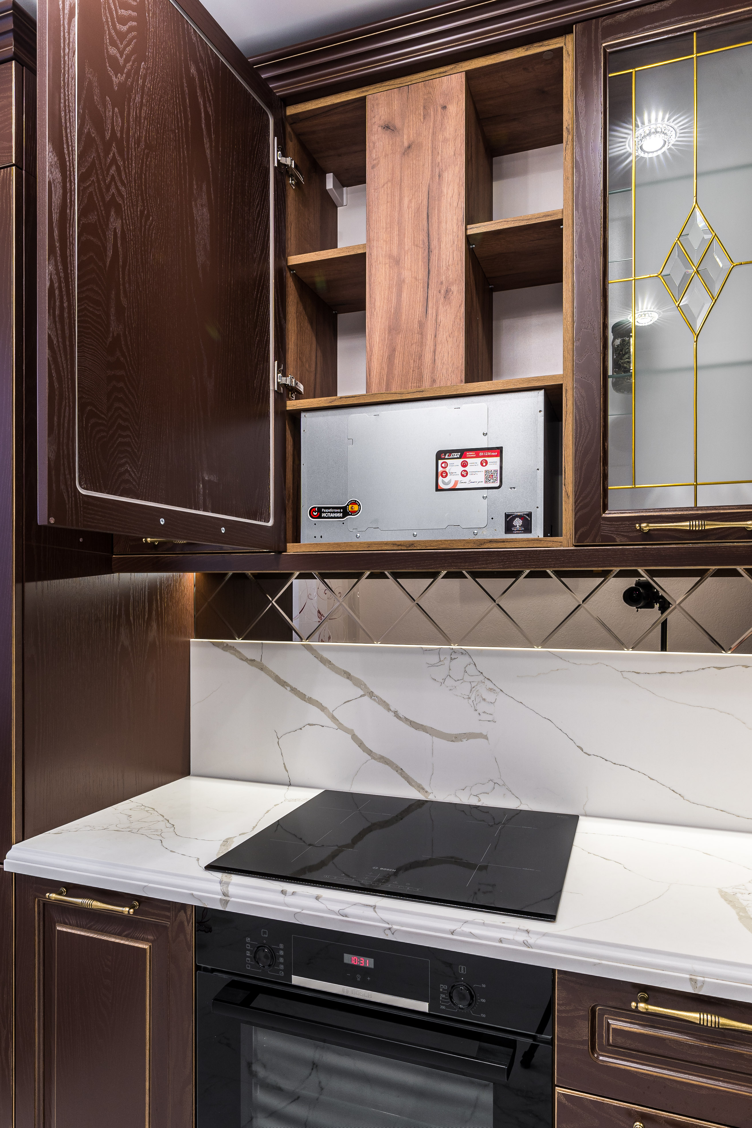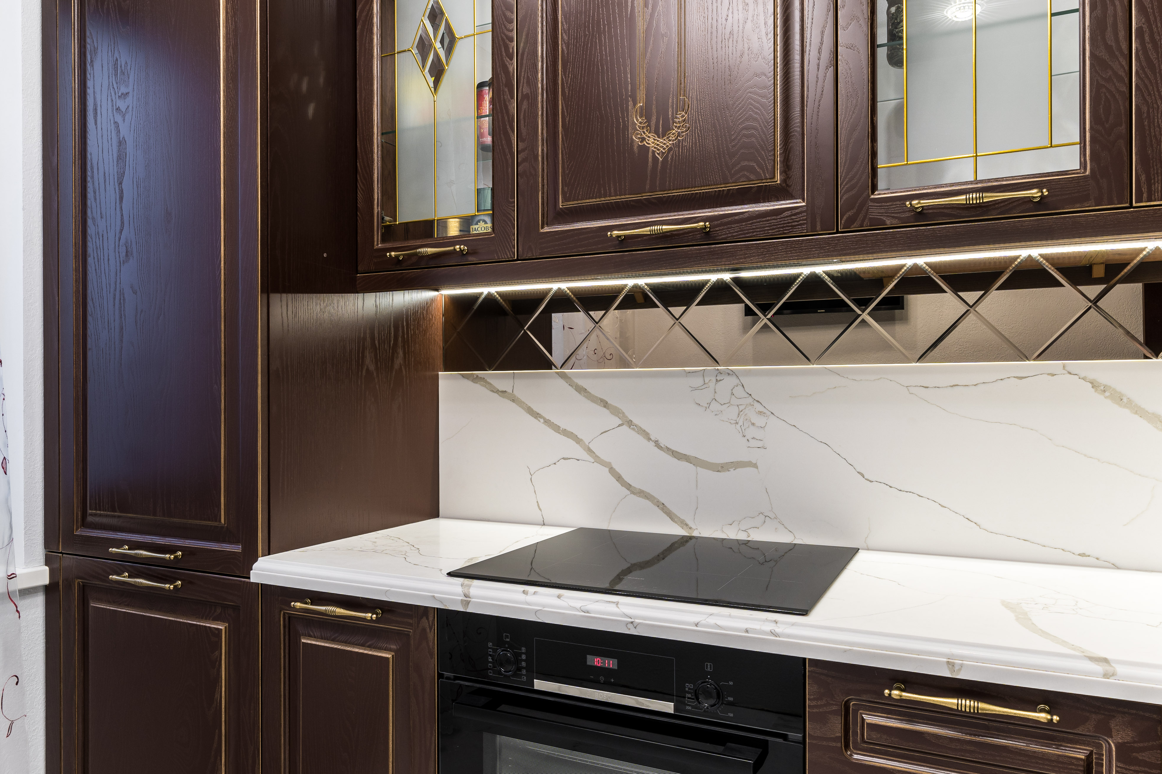 Фасад кухни выполнен из крашенного массива ясеня с нанесением золотой патины. Столешница из композита кварца Avant, скинали -композит кварца+фацетированное зеркало.
