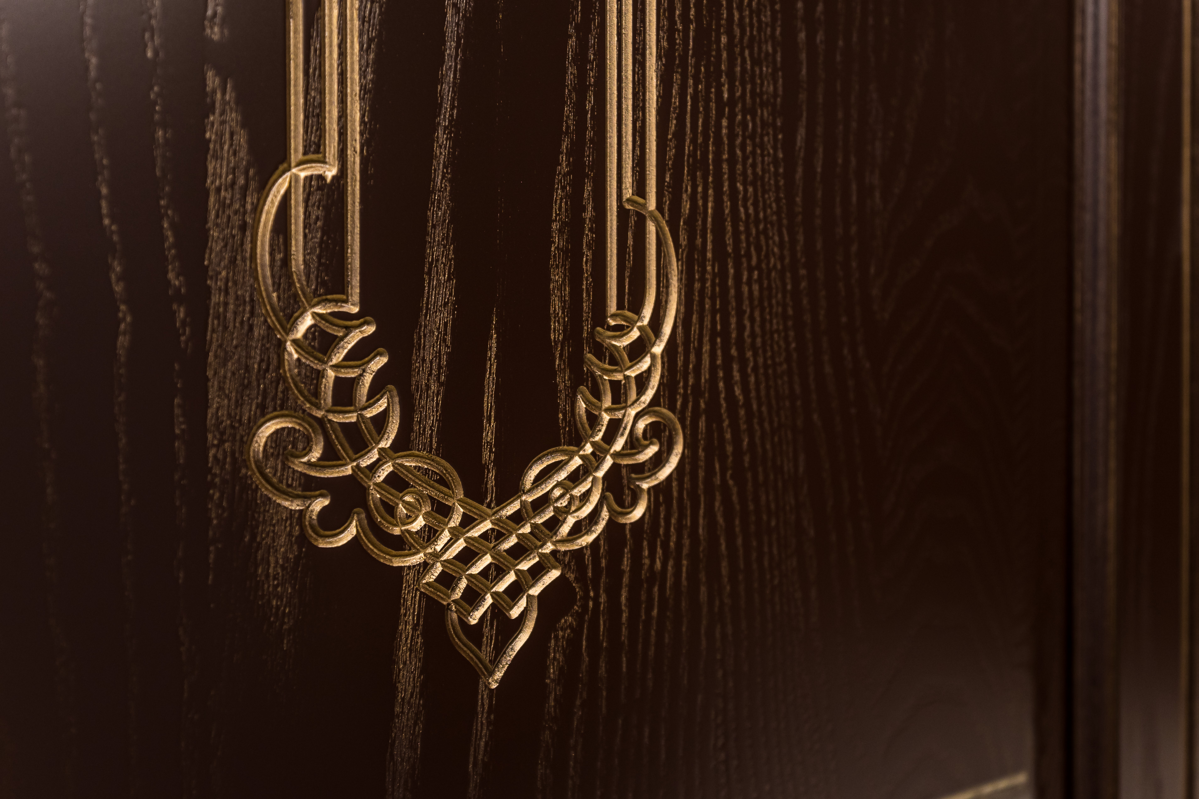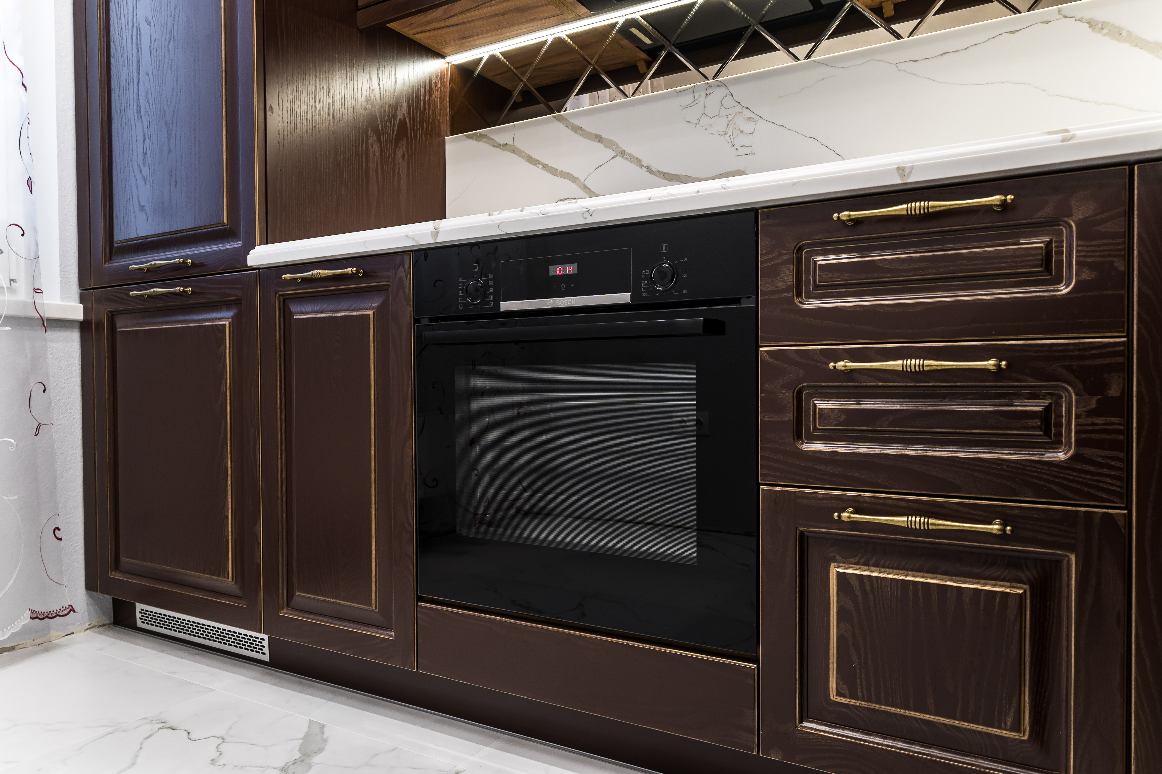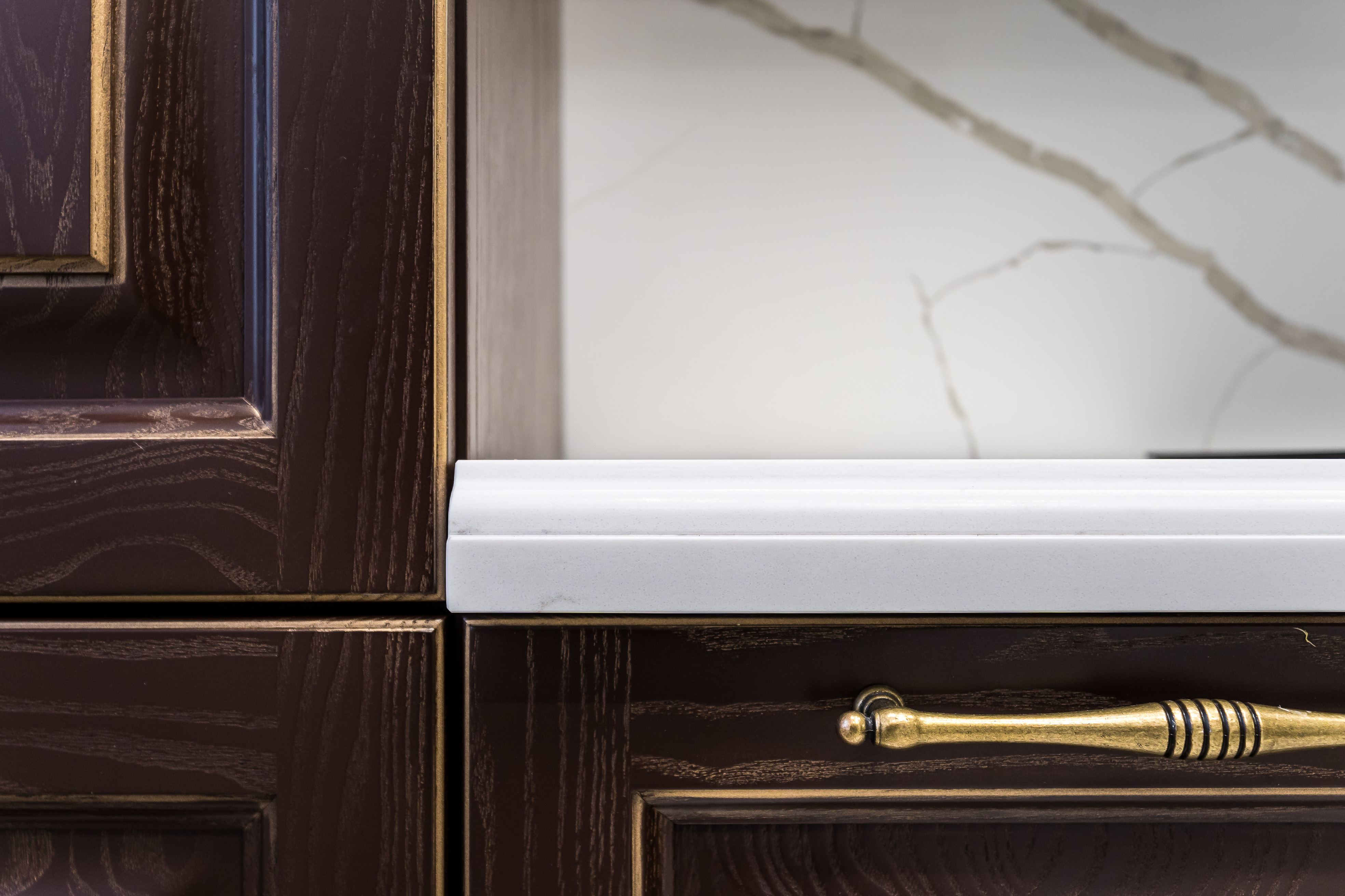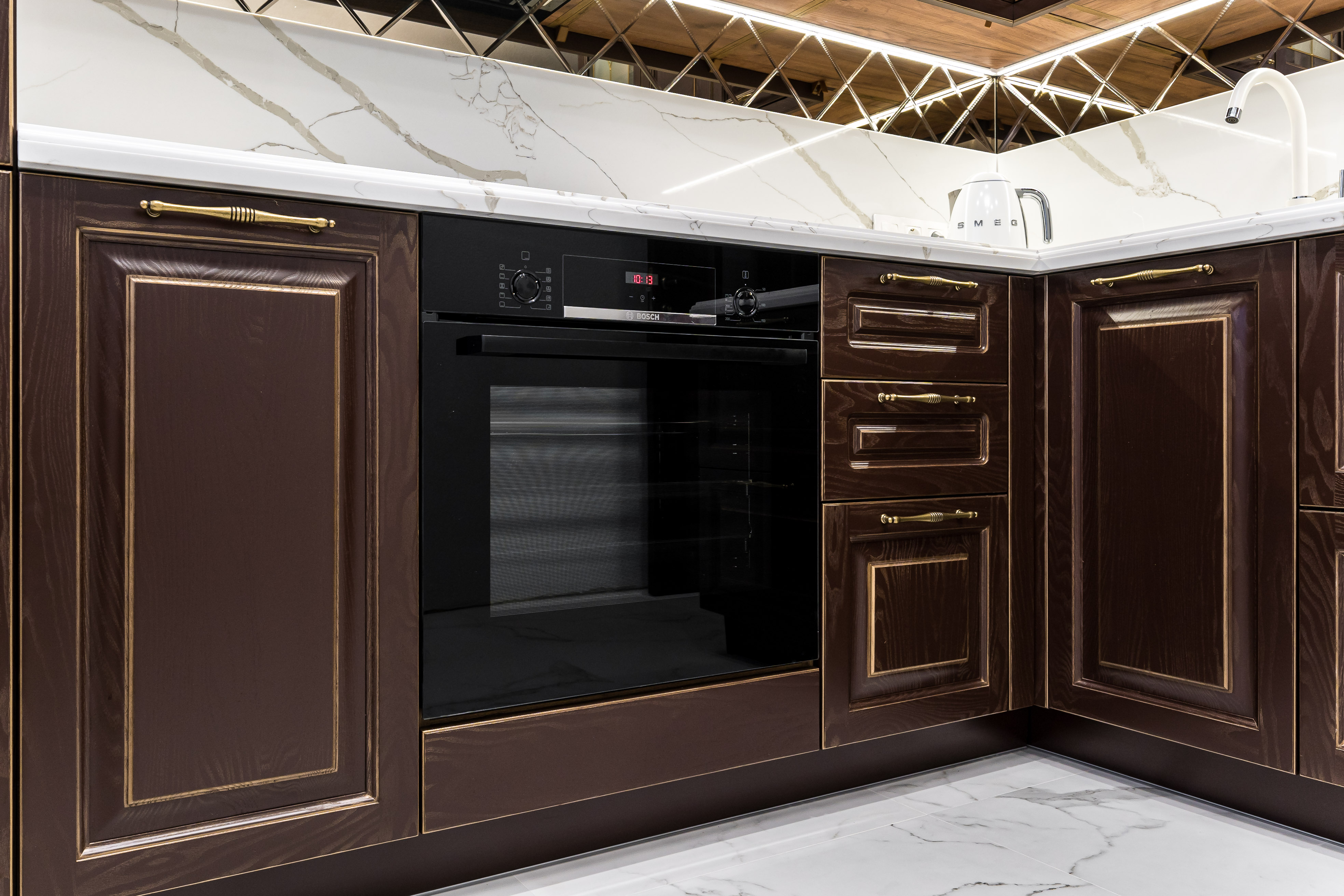 Фасад кухни выполнен из крашенного массива ясеня с нанесением золотой патины. Столешница из композита кварца Avant, скинали -композит кварца+фацетированное зеркало.