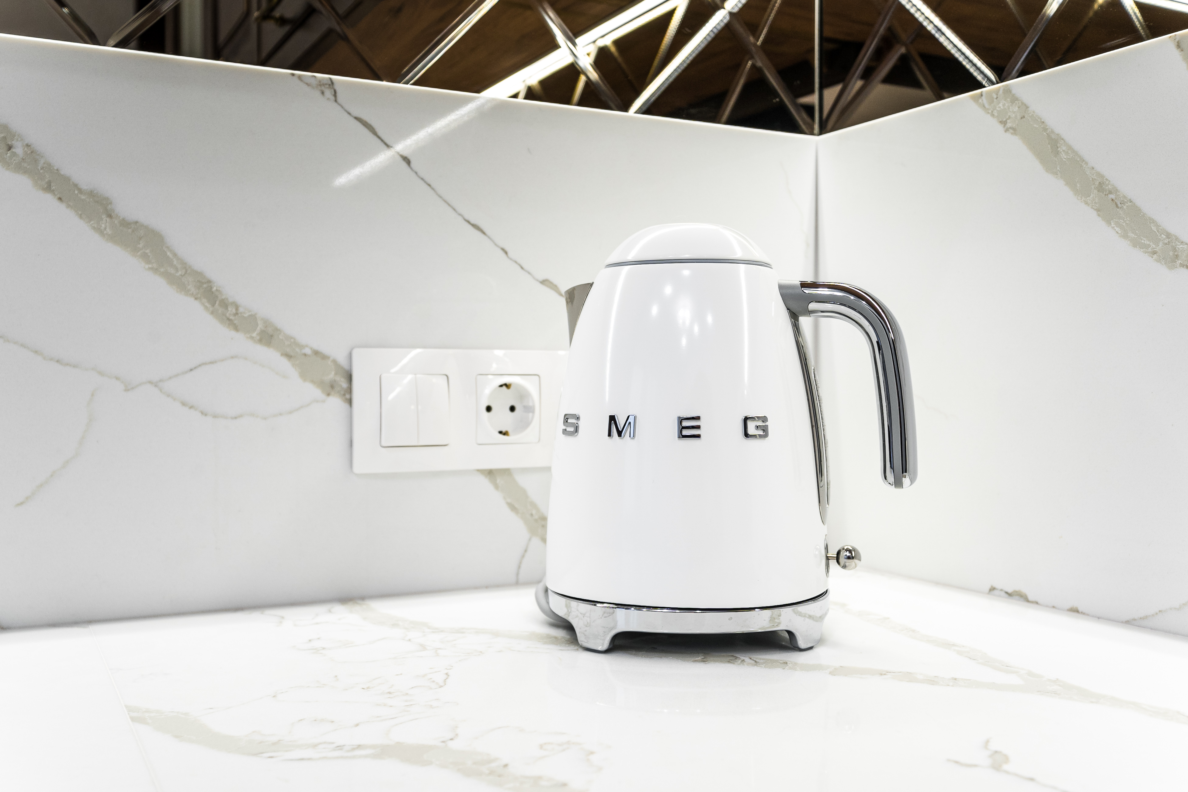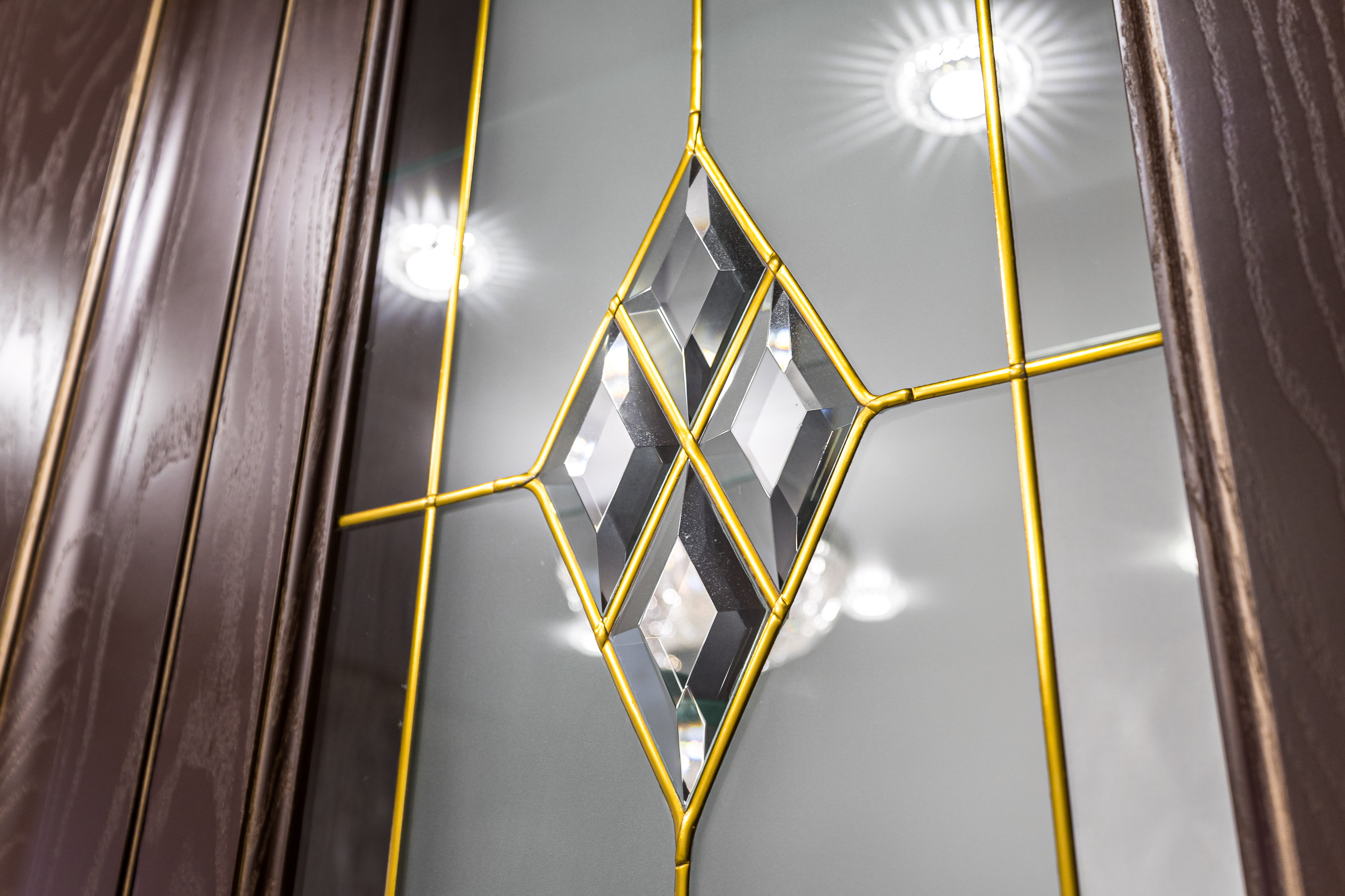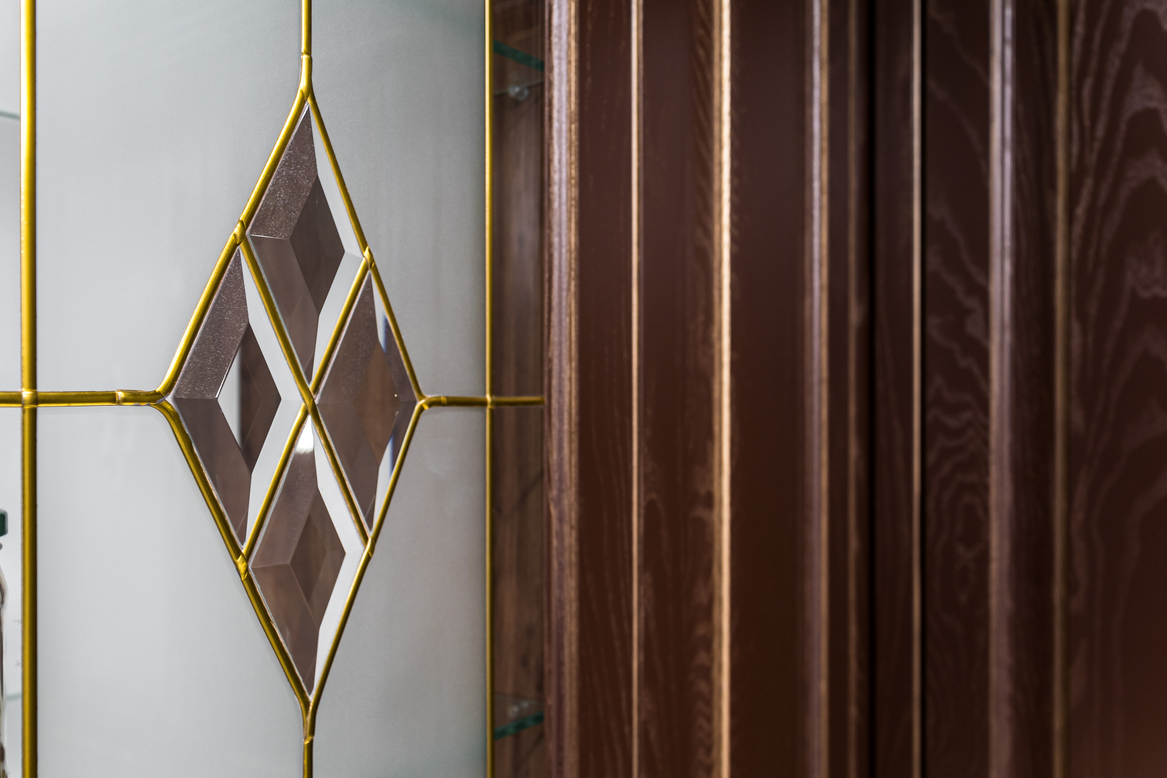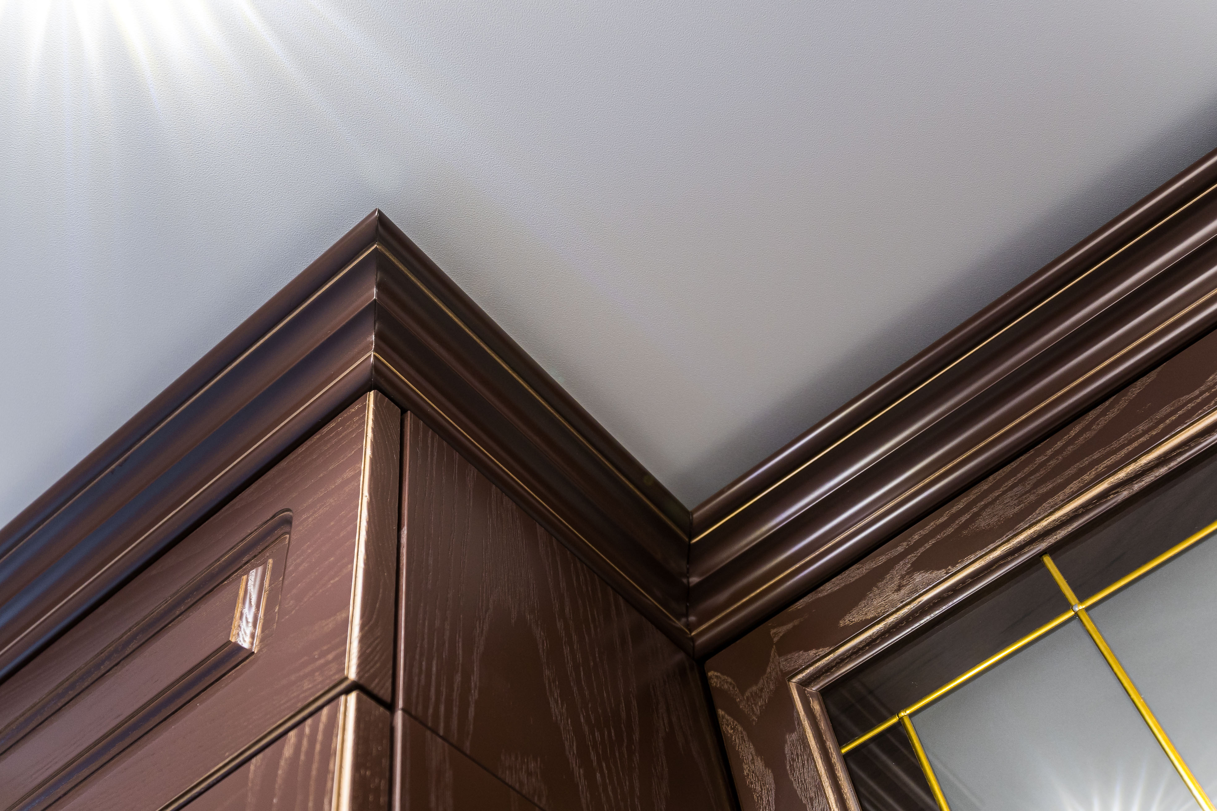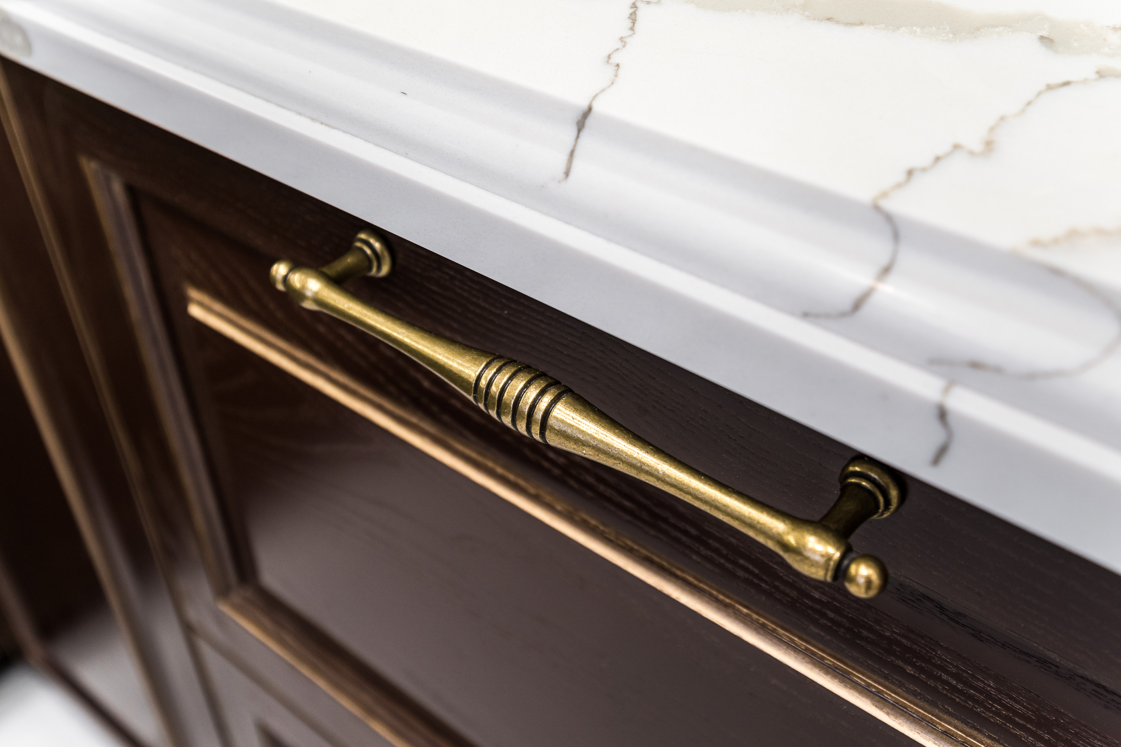 Фасад кухни выполнен из крашенного массива ясеня с нанесением золотой патины. Столешница из композита кварца Avant, скинали -композит кварца+фацетированное зеркало.