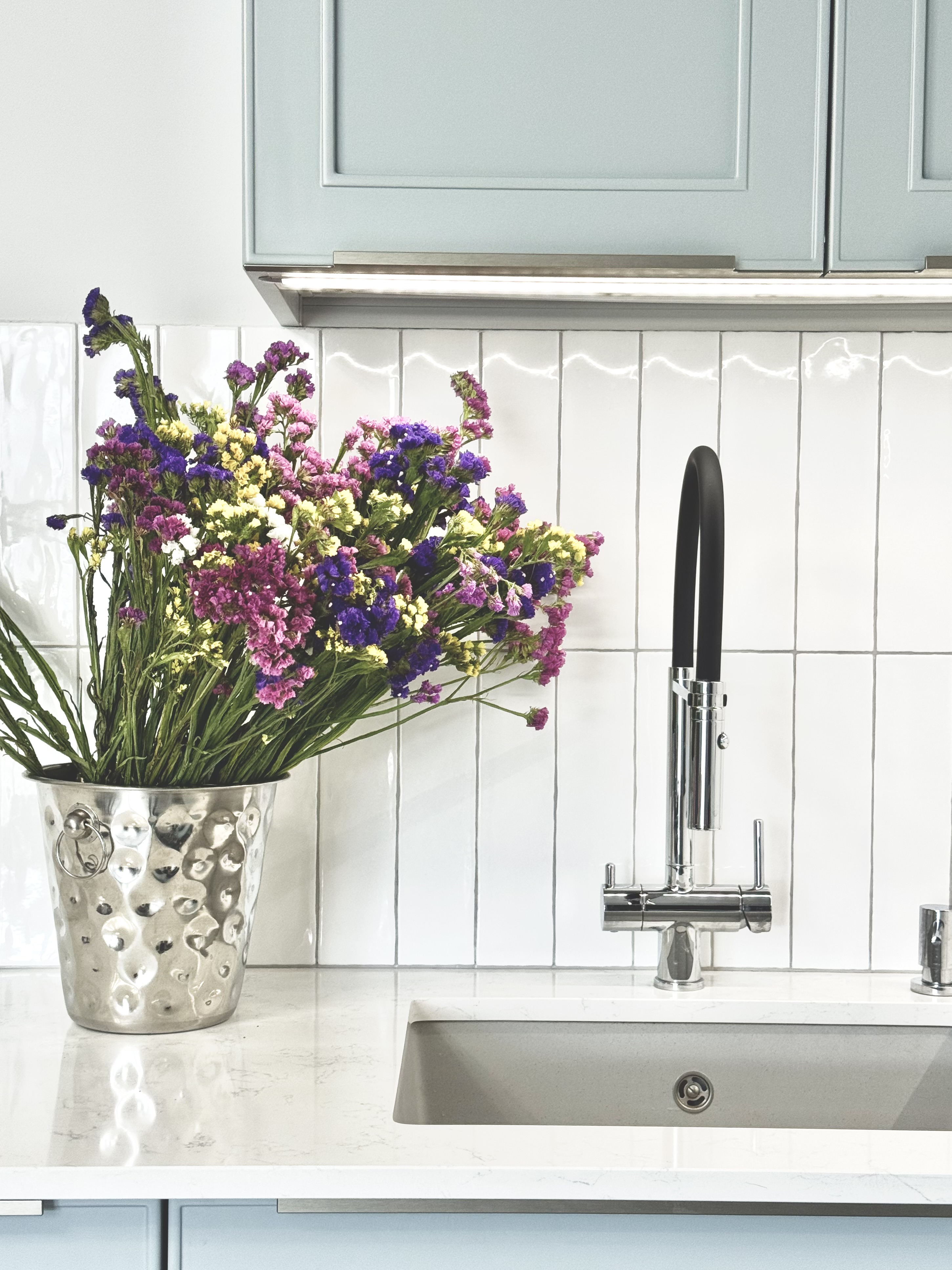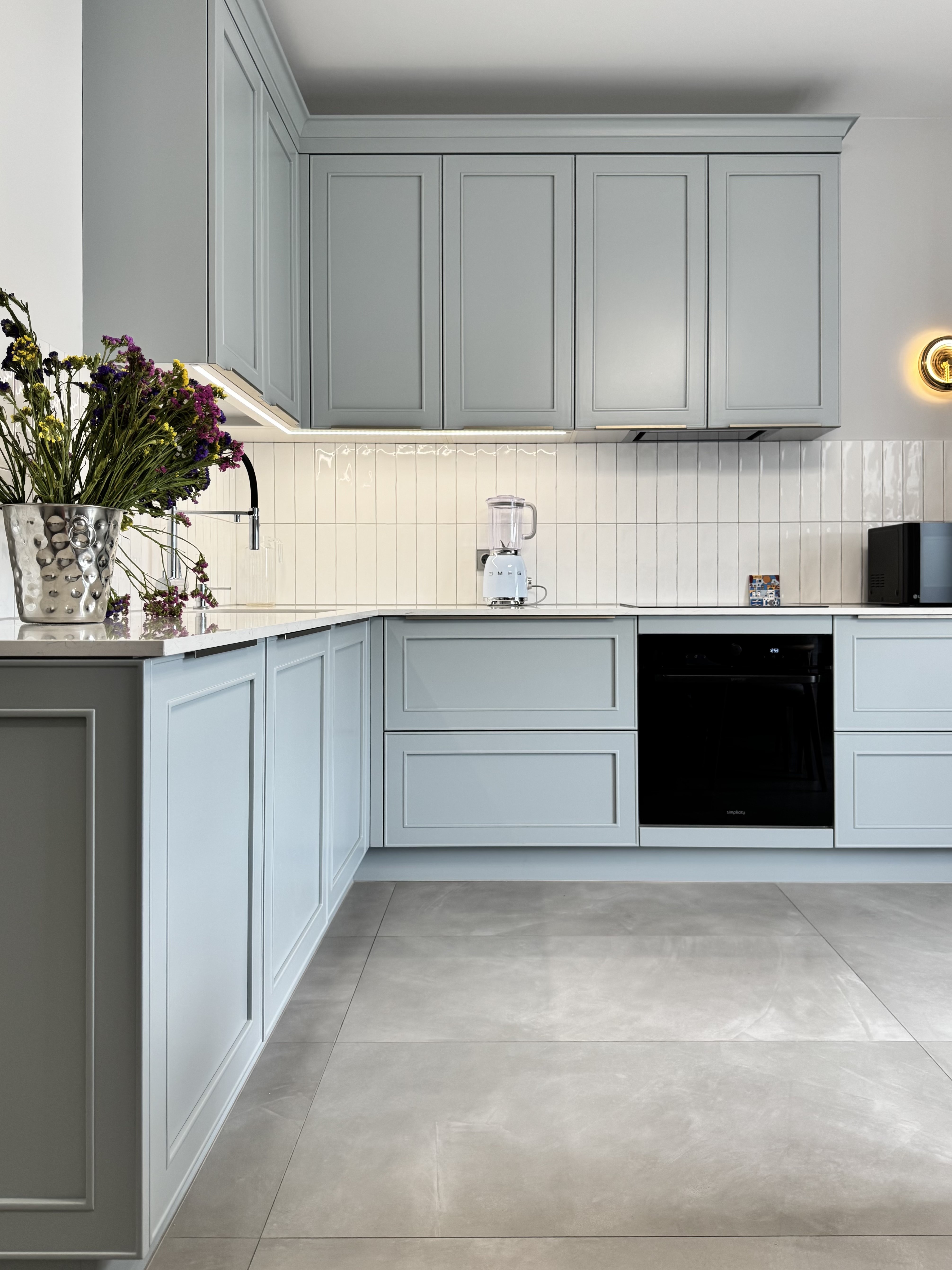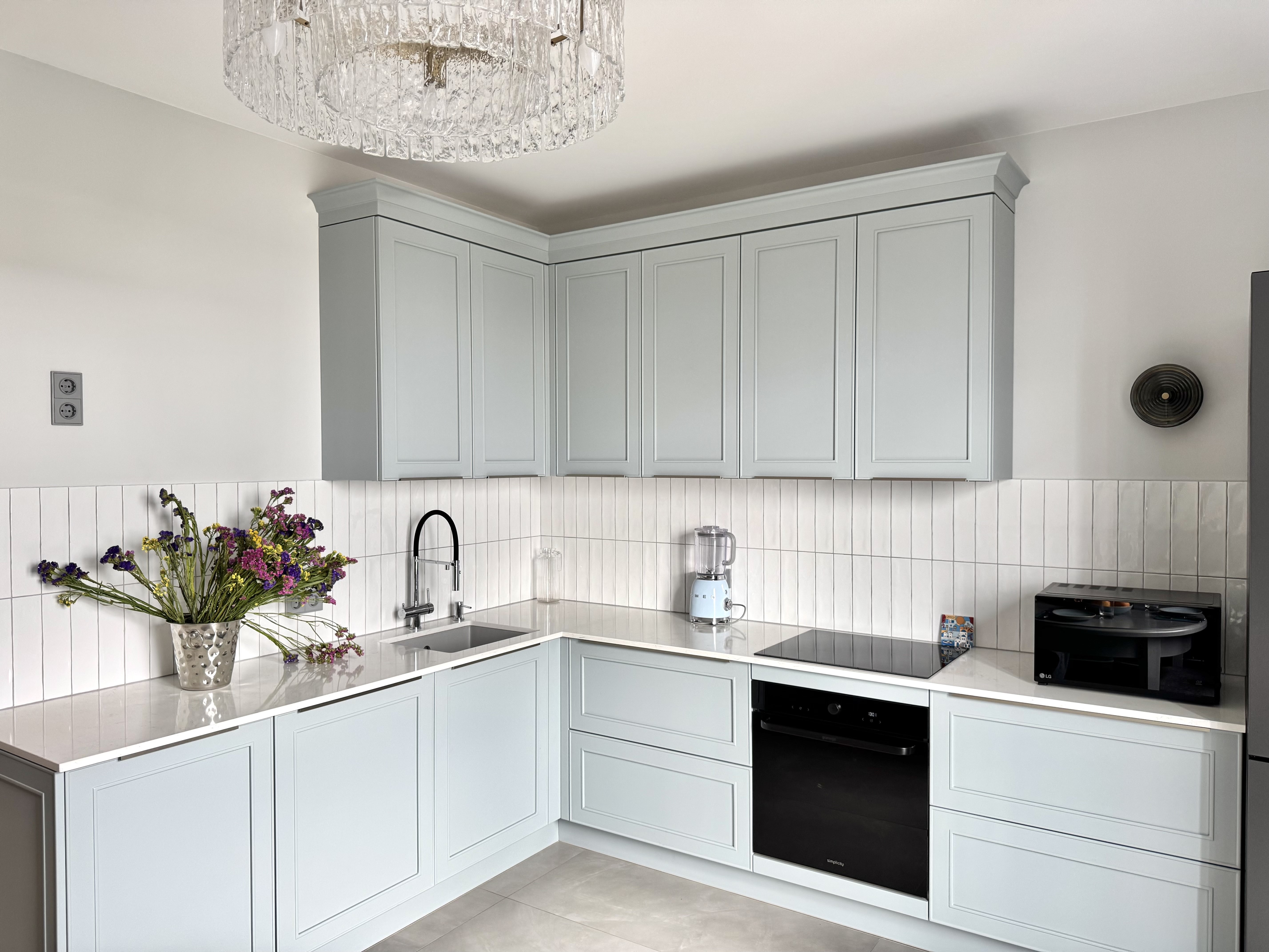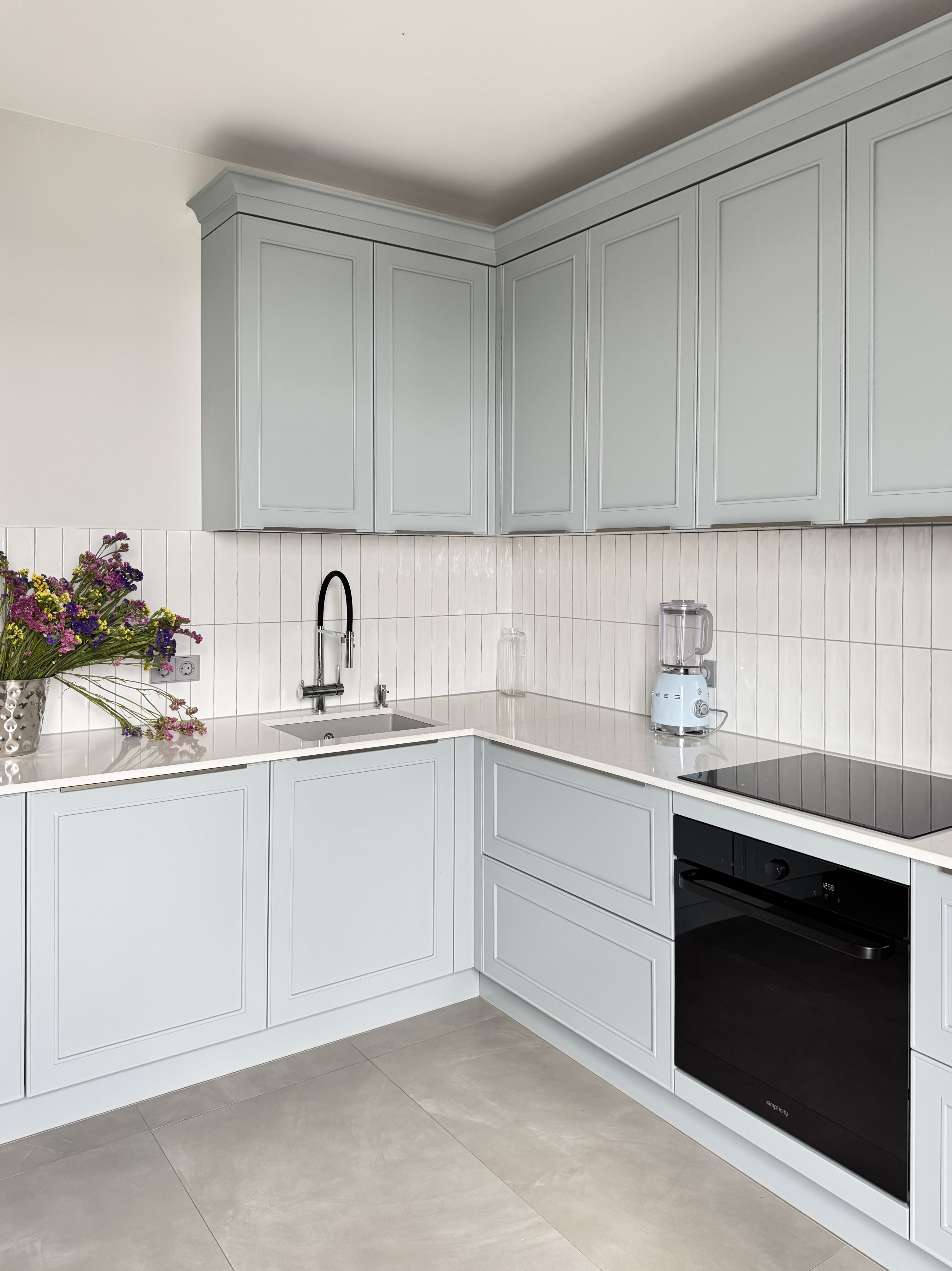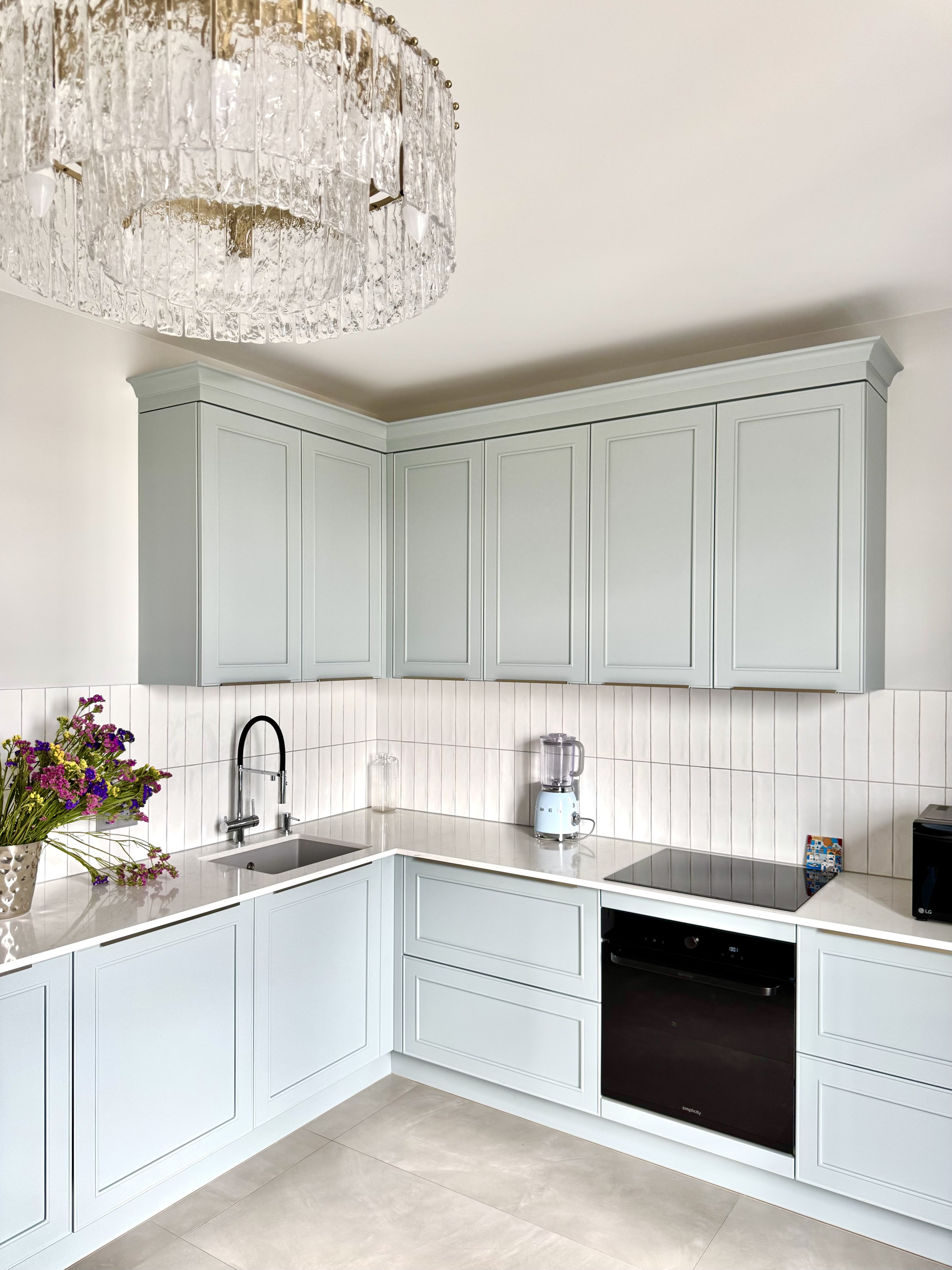 Угловая кухня исполнена не совсем в стандартном, облегченном, построении. Верхние шкафы здесь не до потолка вопреки современным стандартам, и верх совсем не повторяет длину нижних баз кухни, что смотрится очень свежо и воздушно.