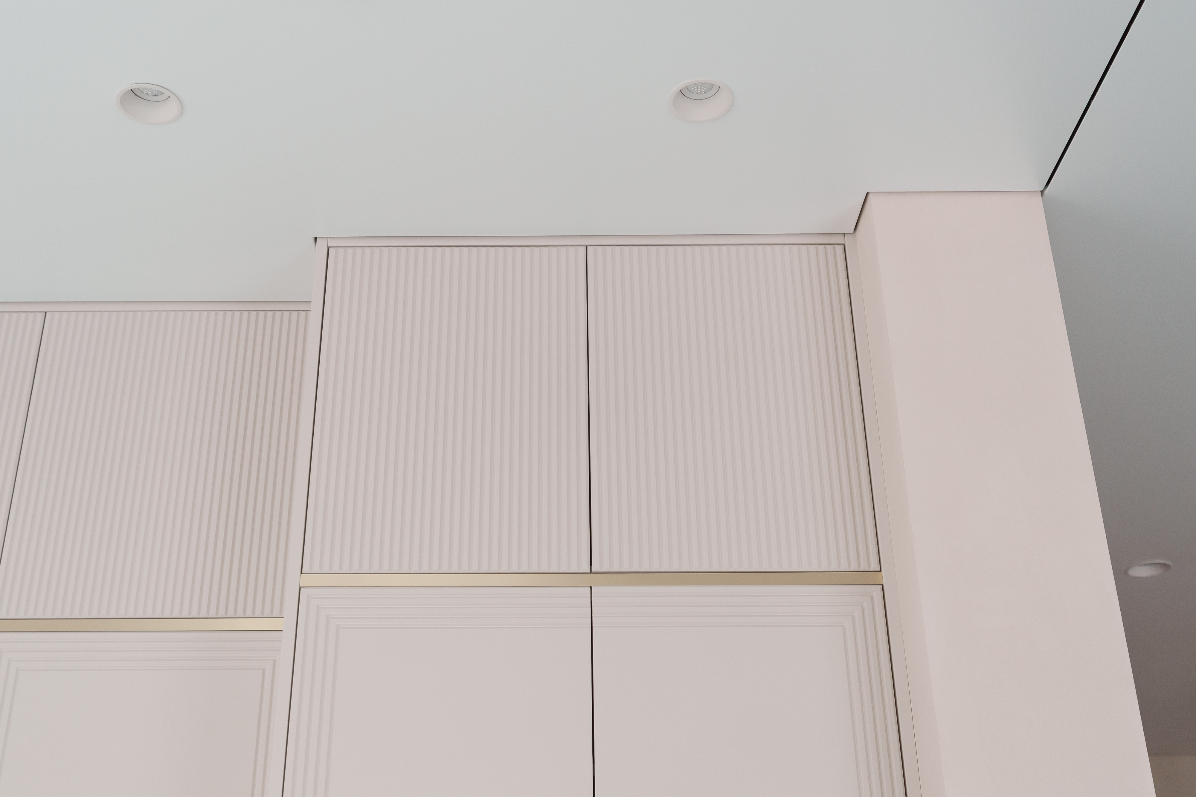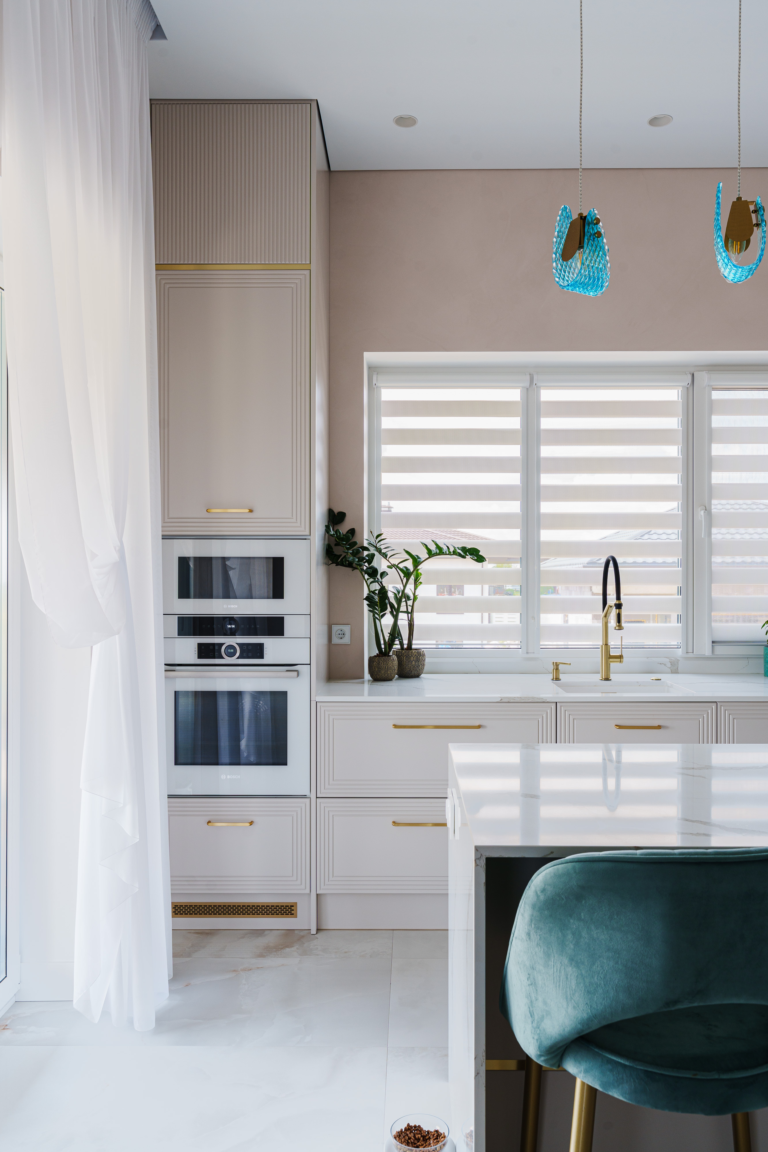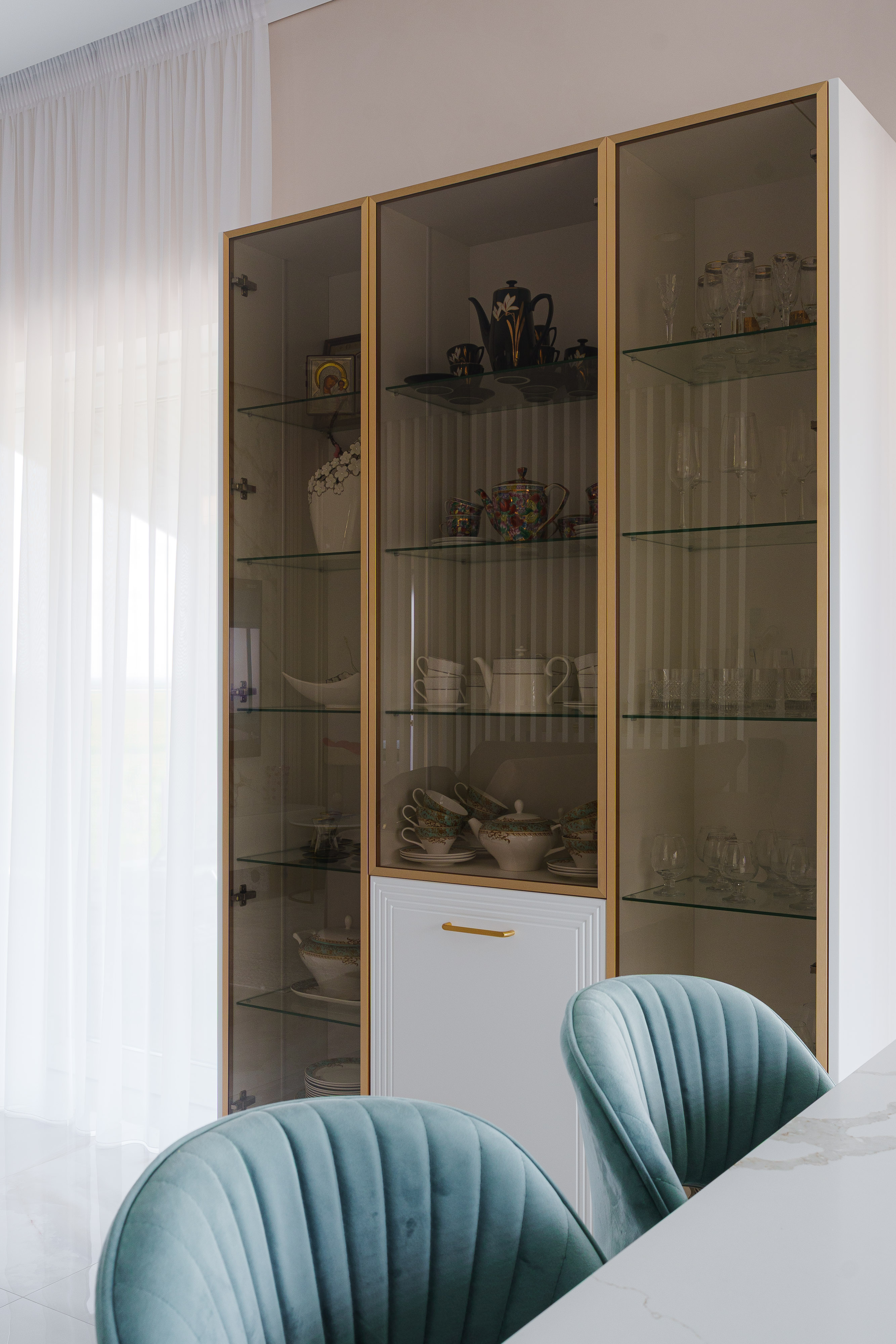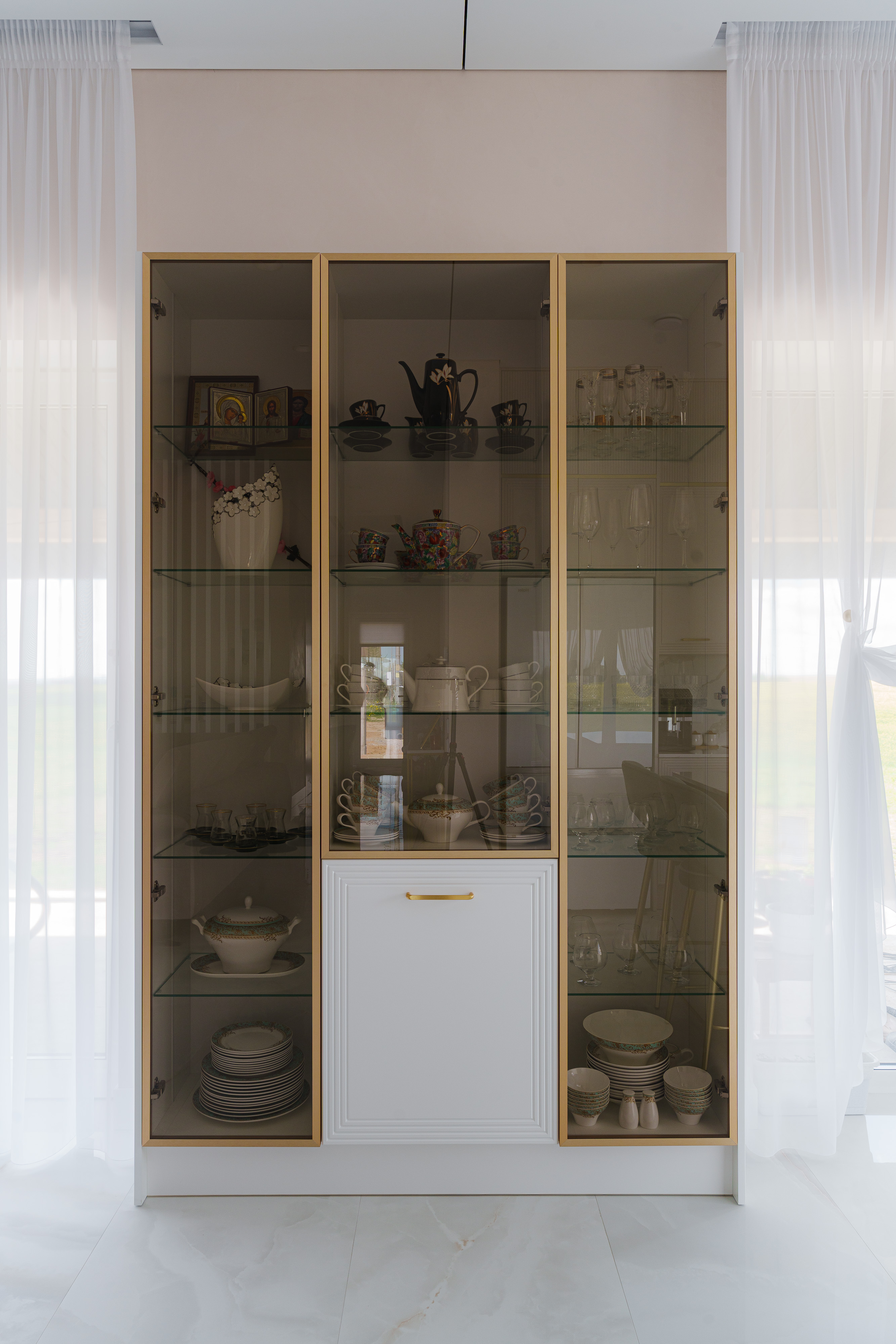 Модель Prizma, благодаря этому проекту, получила второе дыхание, раскрылась с самой привлекательной стороны. Изящная фрезеровка фасада ( которая может замыкать в один контур сразу несколько соседних фасадов) отлично сочетается по стилистике с другой моделью- Loki. Вертикальная и рамочная фрезеровка разбиты в проект латунными вставками. Вообще, в проекте много латунных элементов: от витражей буфета до ручек- все это прекрасным образом поддерживает общую стилистику дома.