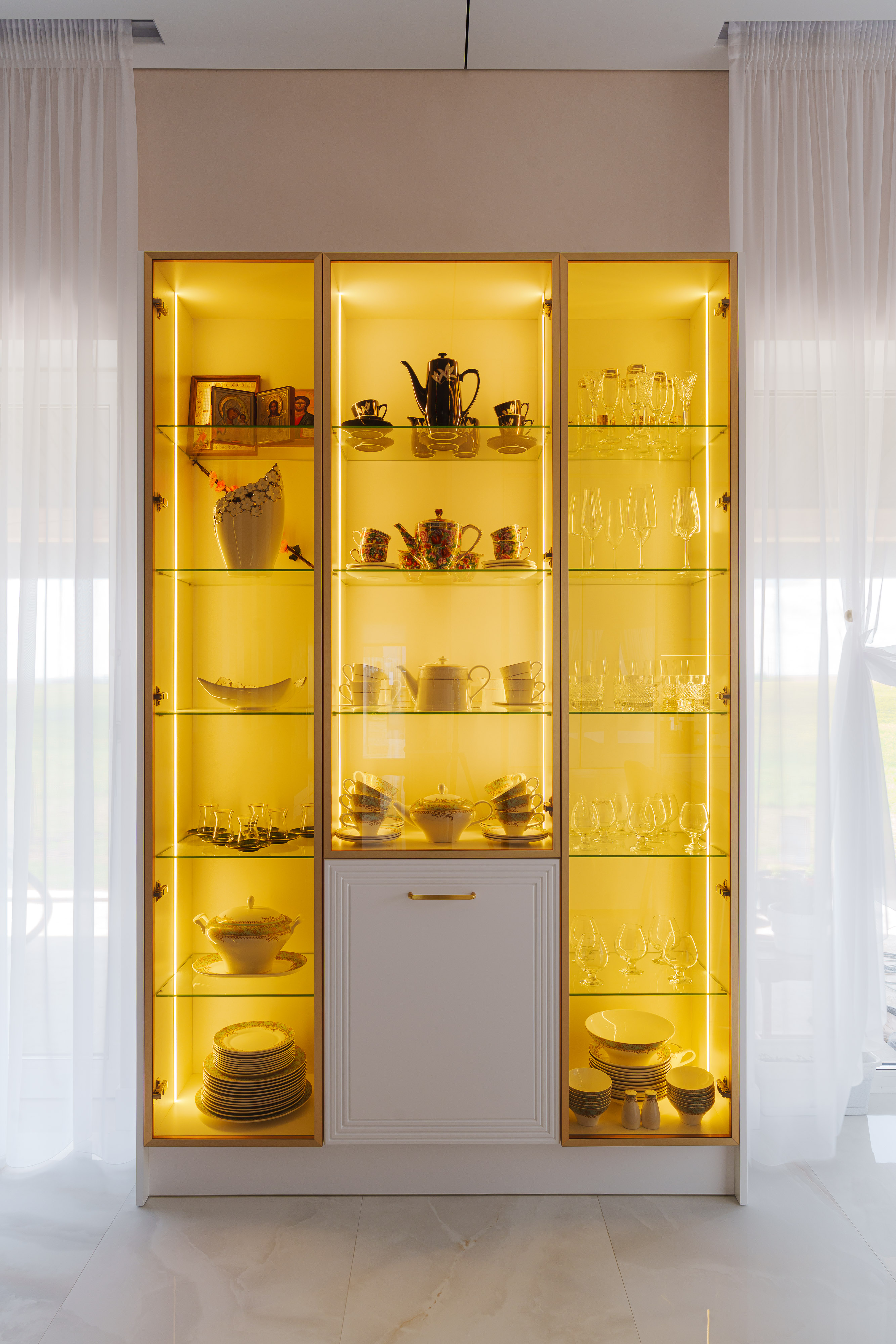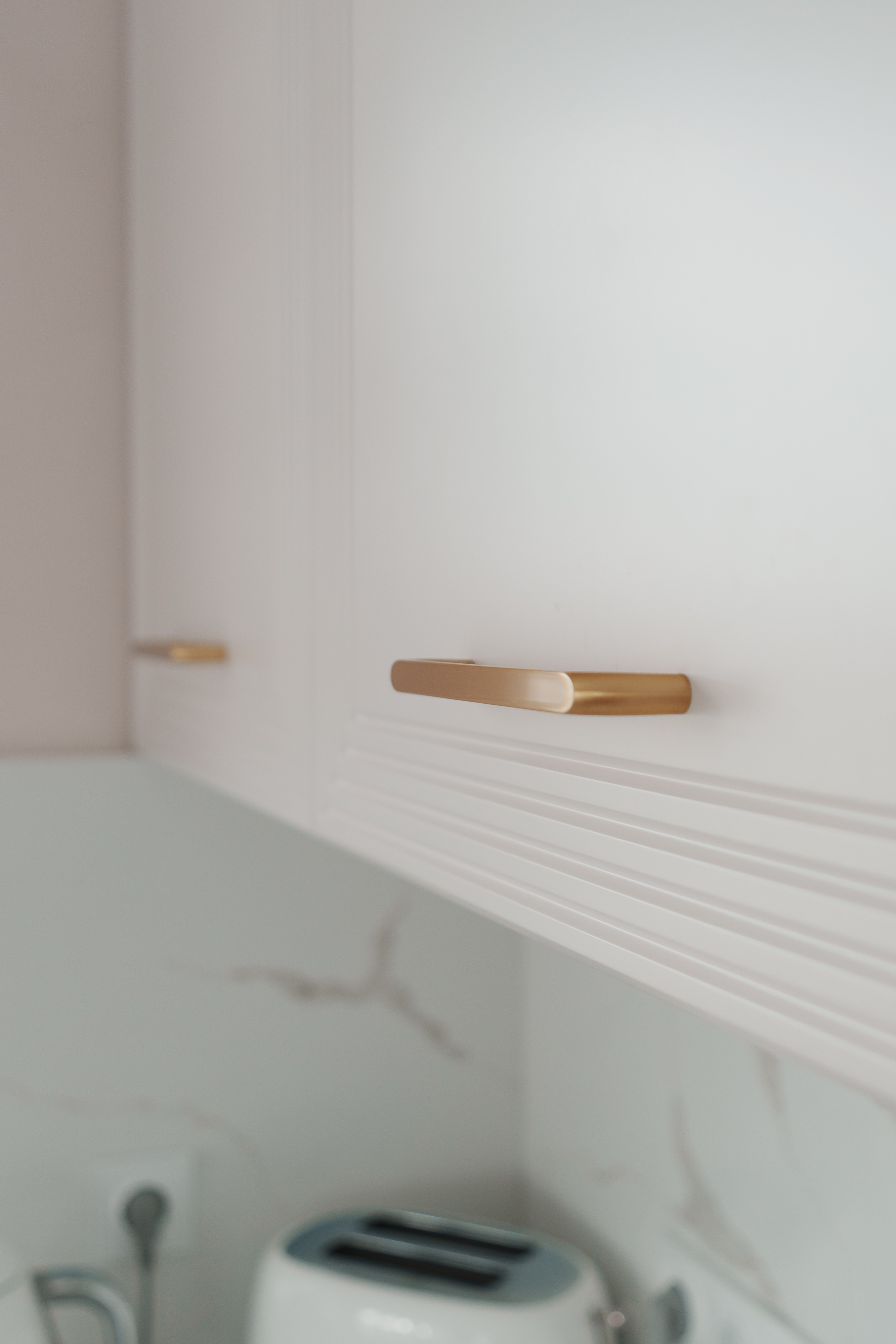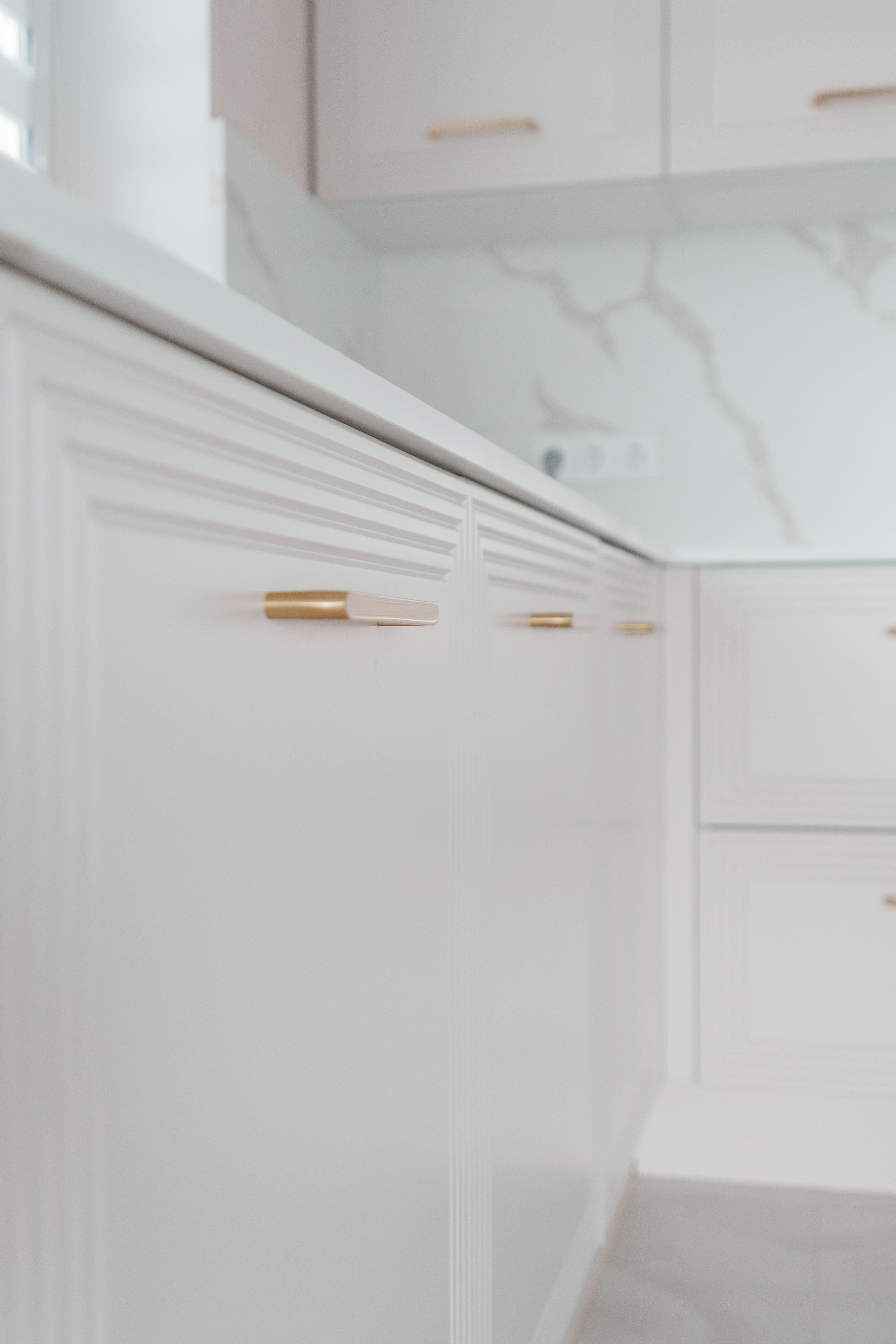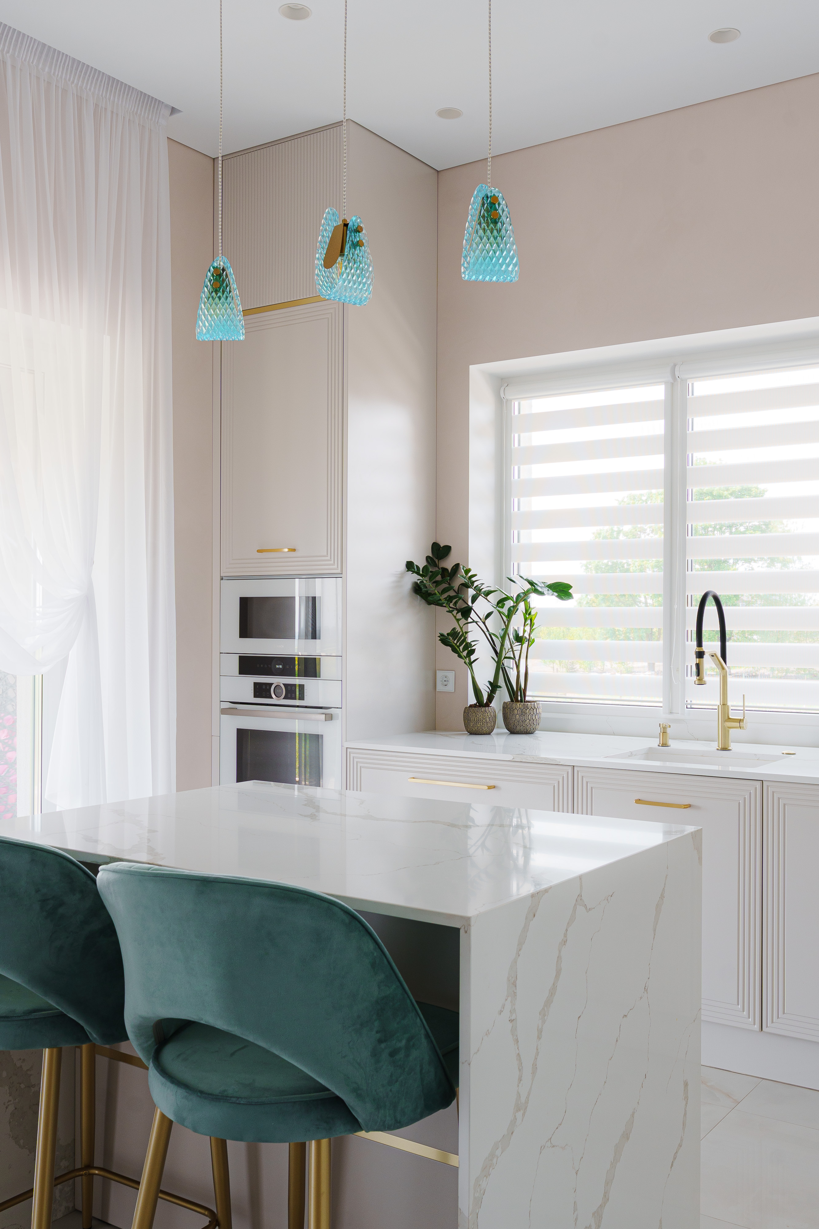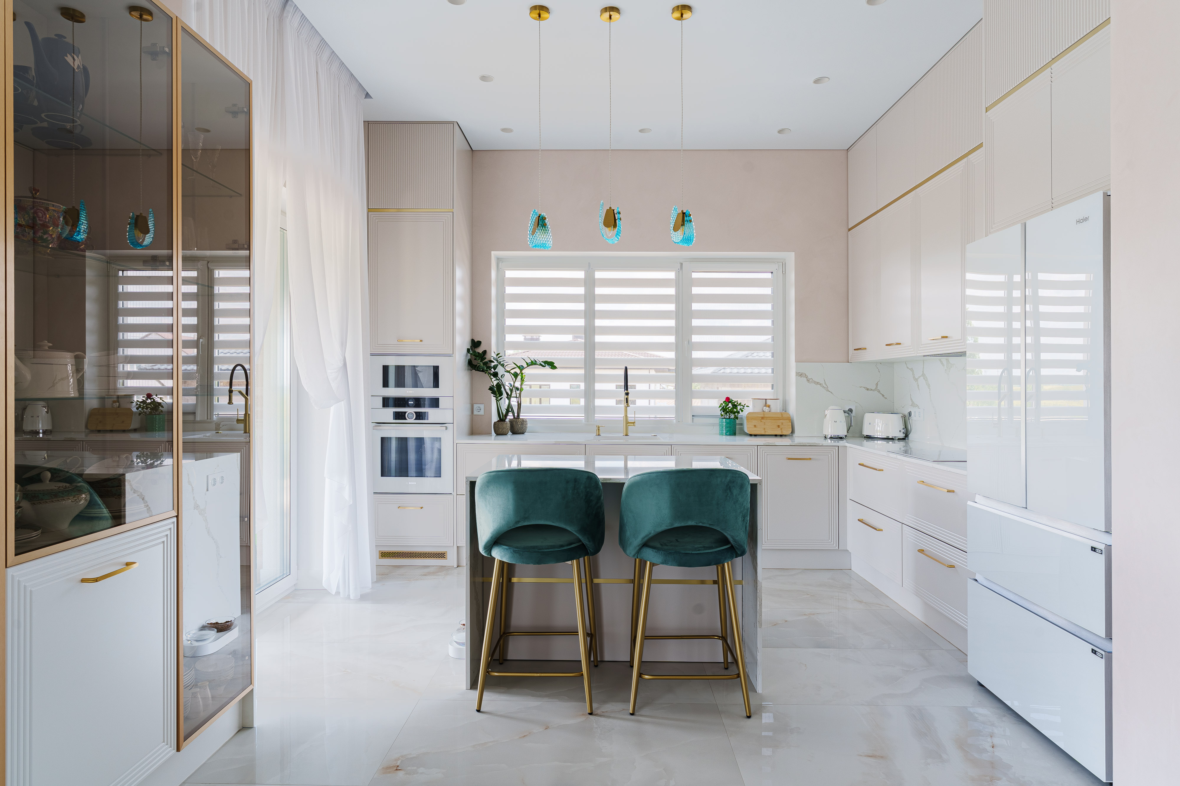 Модель Prizma, благодаря этому проекту, получила второе дыхание, раскрылась с самой привлекательной стороны. Изящная фрезеровка фасада ( которая может замыкать в один контур сразу несколько соседних фасадов) отлично сочетается по стилистике с другой моделью- Loki. Вертикальная и рамочная фрезеровка разбиты в проект латунными вставками. Вообще, в проекте много латунных элементов: от витражей буфета до ручек- все это прекрасным образом поддерживает общую стилистику дома.
