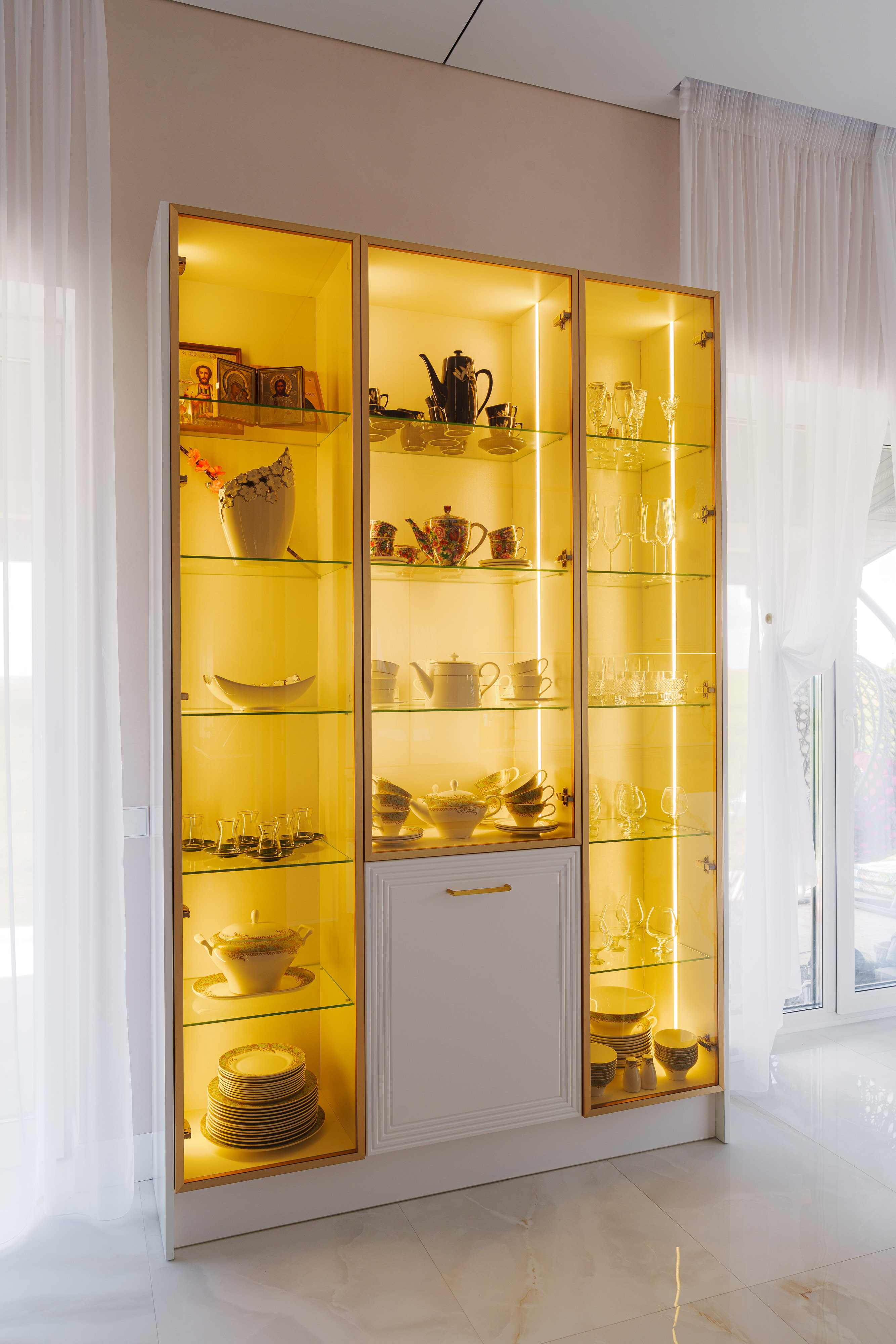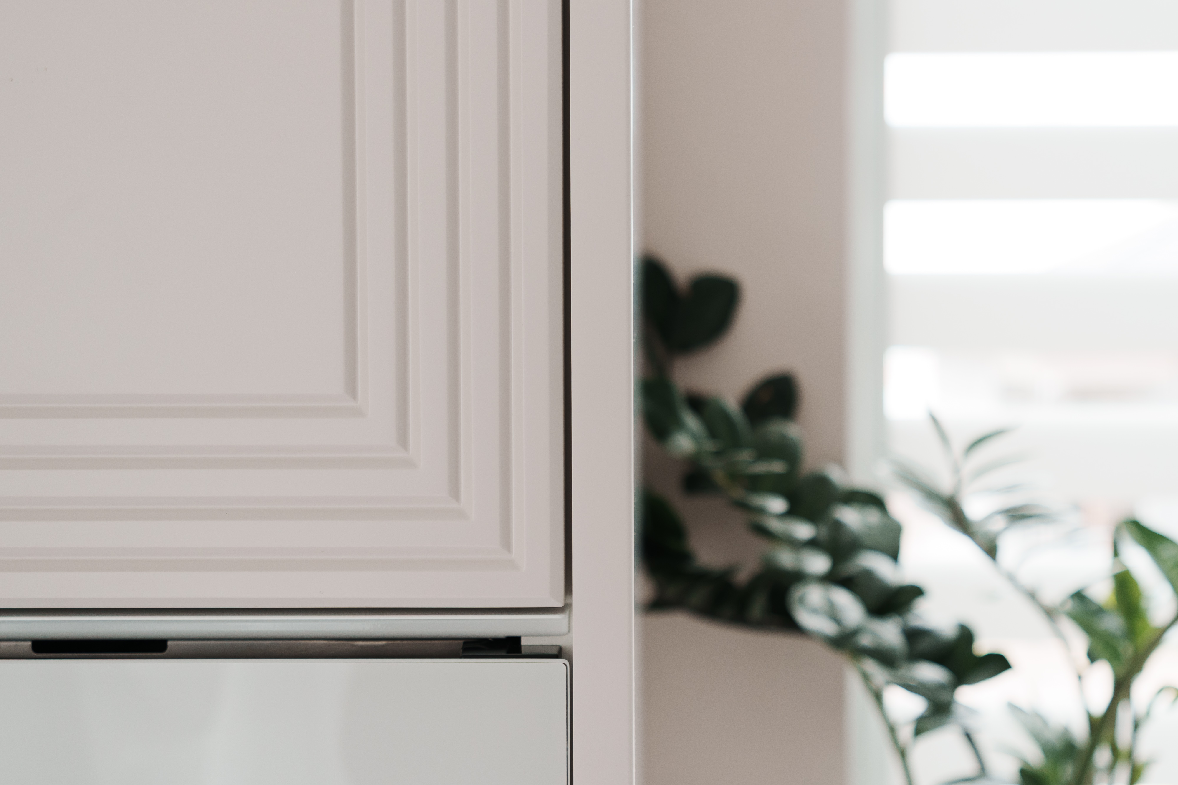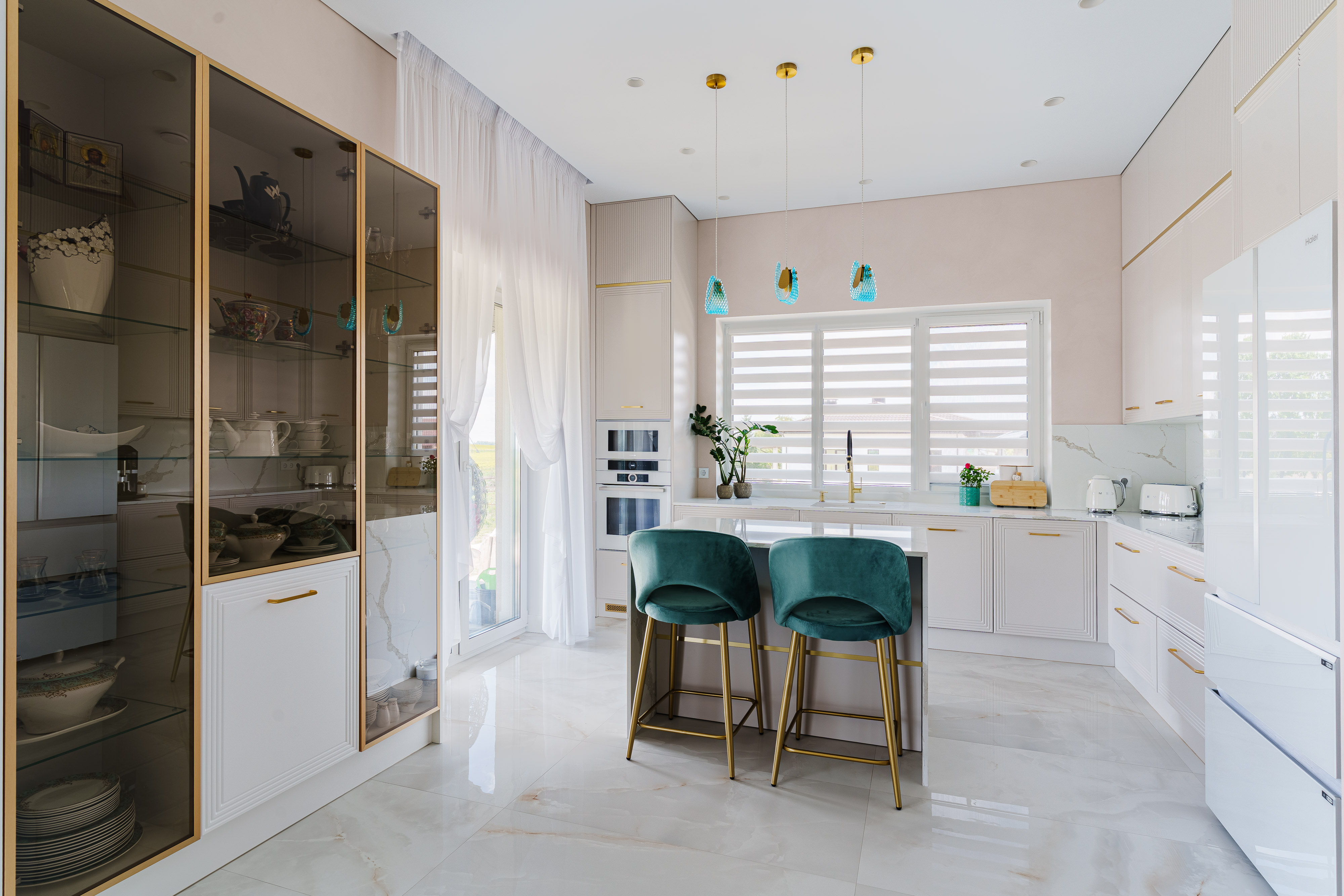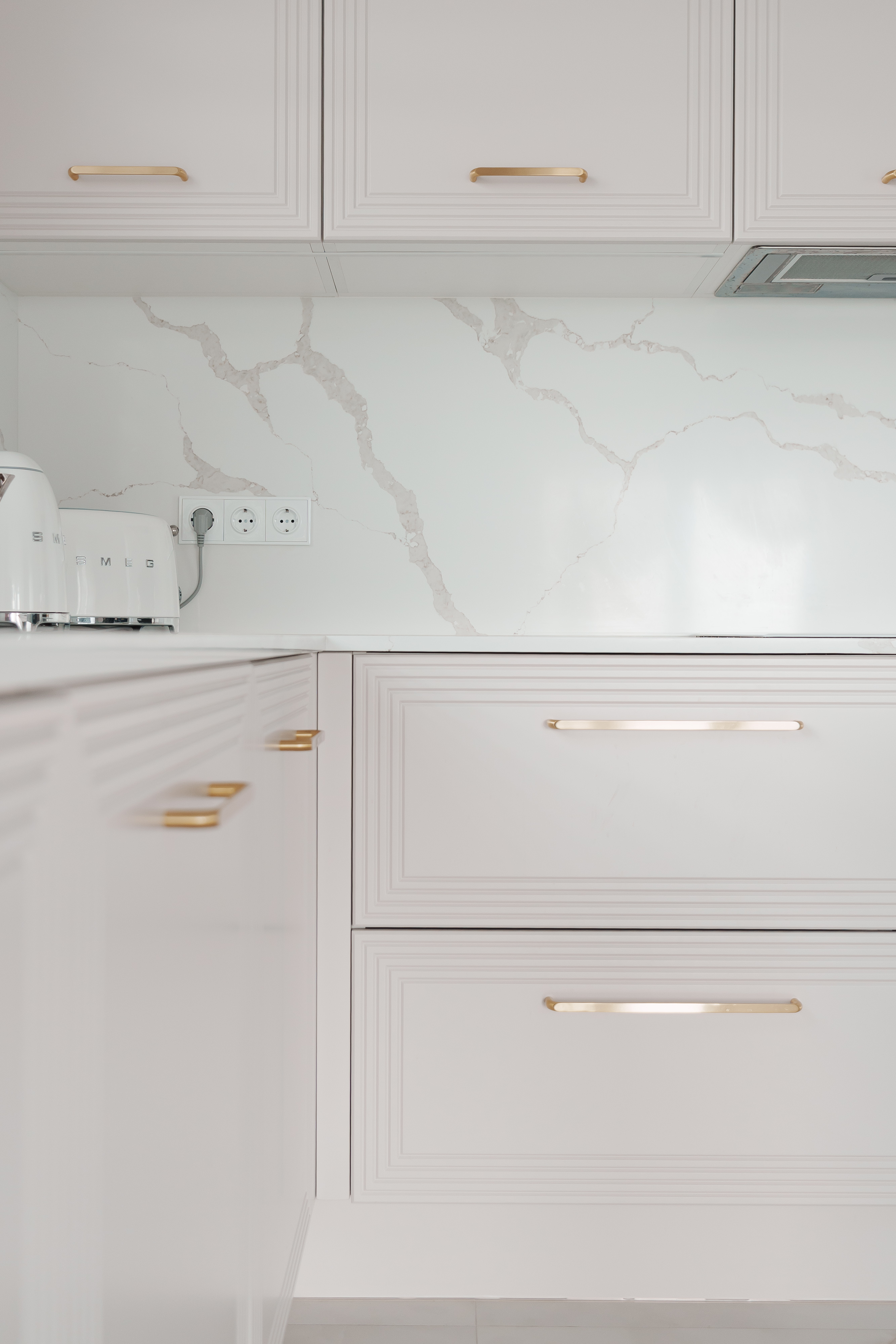 Модель Prizma, благодаря этому проекту, получила второе дыхание, раскрылась с самой привлекательной стороны. Изящная фрезеровка фасада ( которая может замыкать в один контур сразу несколько соседних фасадов) отлично сочетается по стилистике с другой моделью- Loki. Вертикальная и рамочная фрезеровка разбиты в проект латунными вставками. Вообще, в проекте много латунных элементов: от витражей буфета до ручек- все это прекрасным образом поддерживает общую стилистику дома.