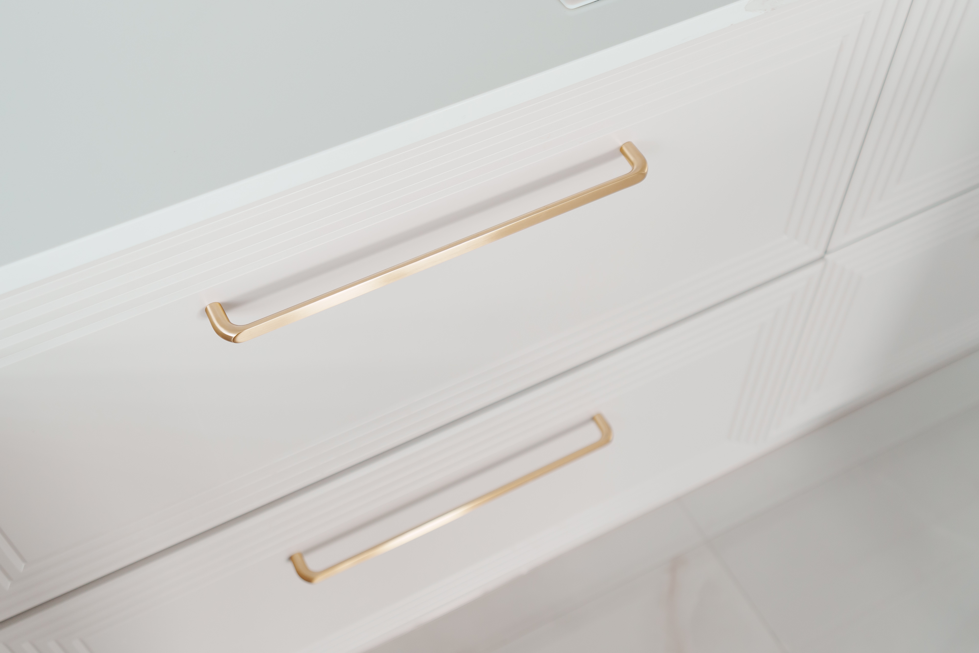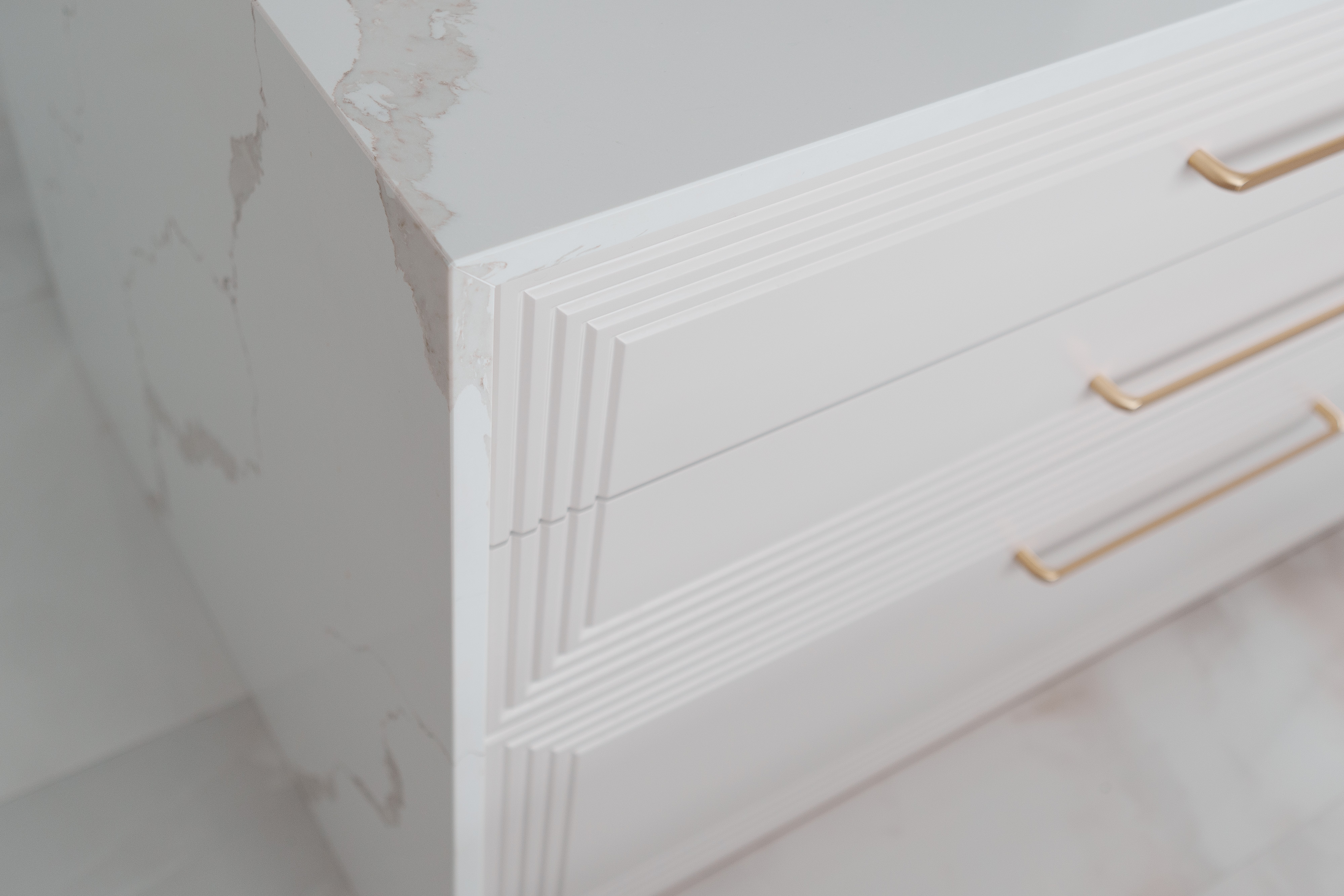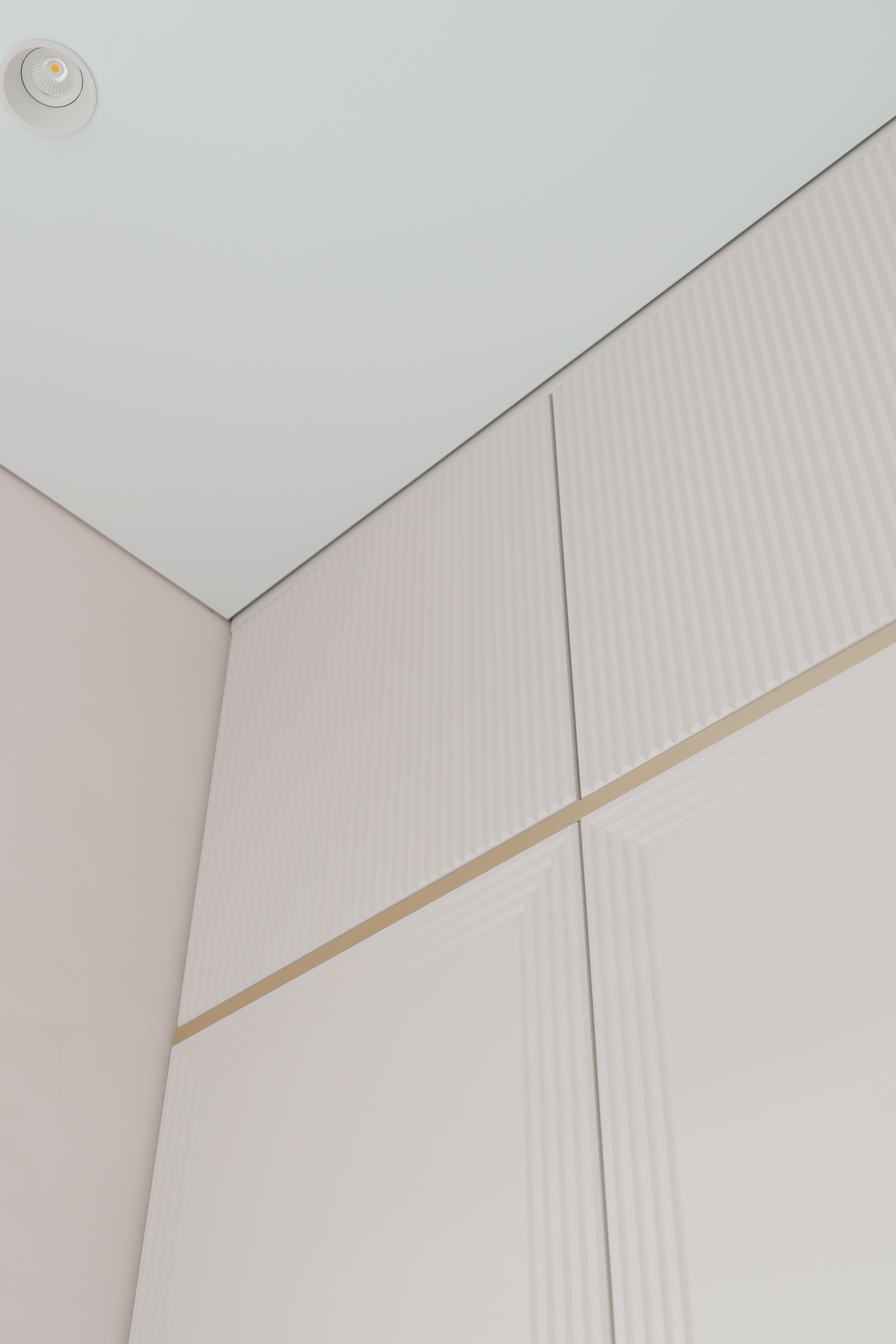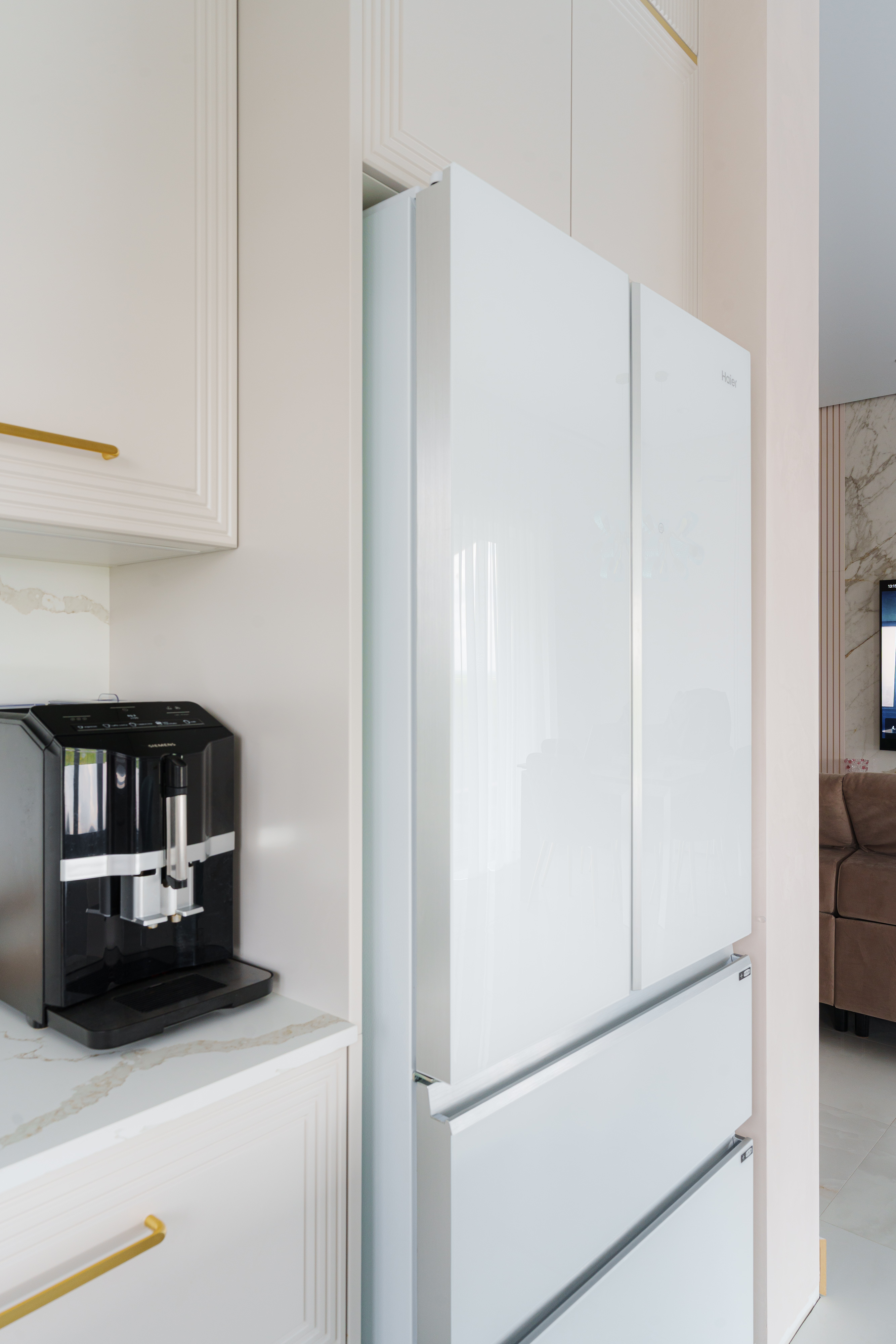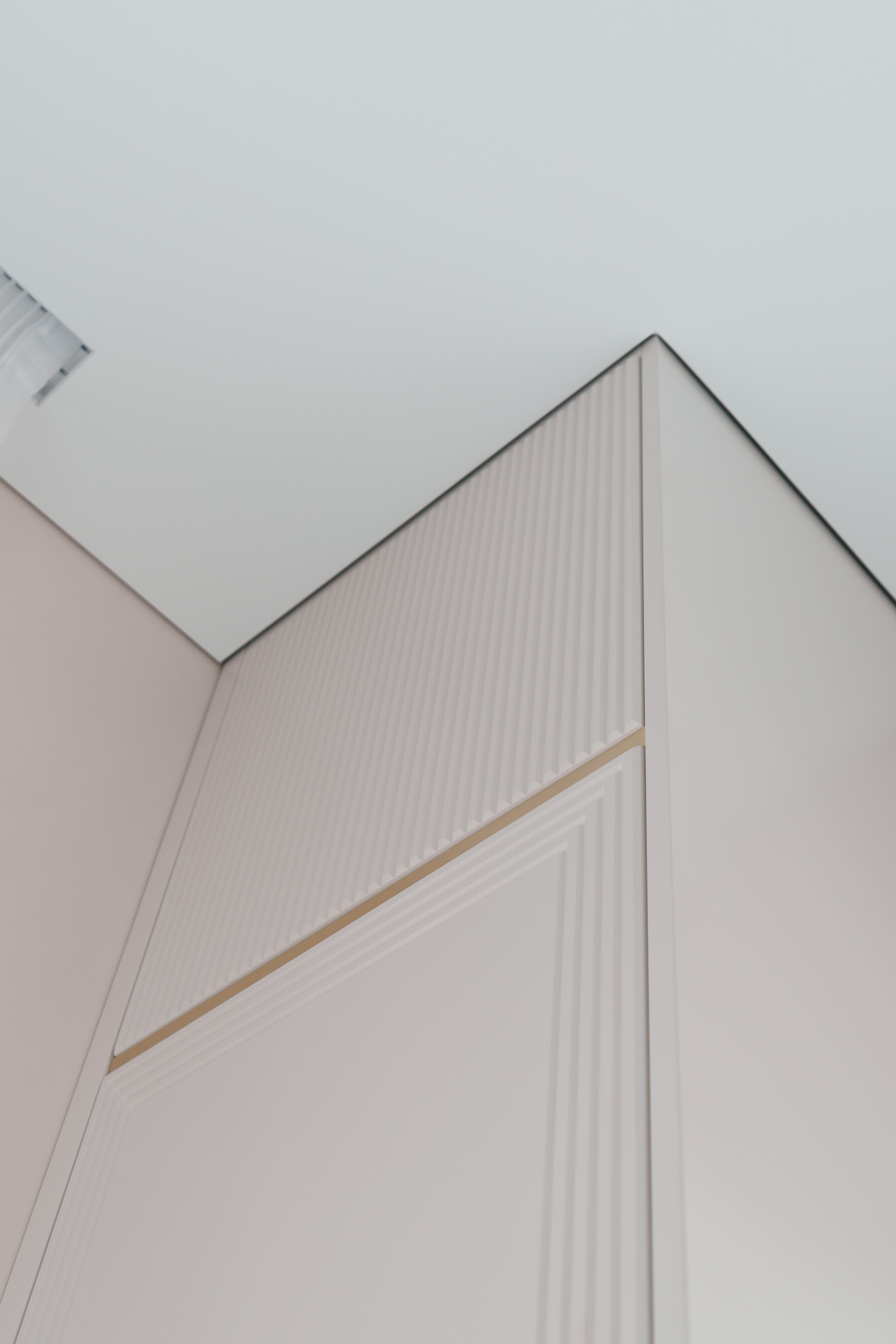 Модель Prizma, благодаря этому проекту, получила второе дыхание, раскрылась с самой привлекательной стороны. Изящная фрезеровка фасада ( которая может замыкать в один контур сразу несколько соседних фасадов) отлично сочетается по стилистике с другой моделью- Loki. Вертикальная и рамочная фрезеровка разбиты в проект латунными вставками. Вообще, в проекте много латунных элементов: от витражей буфета до ручек- все это прекрасным образом поддерживает общую стилистику дома.