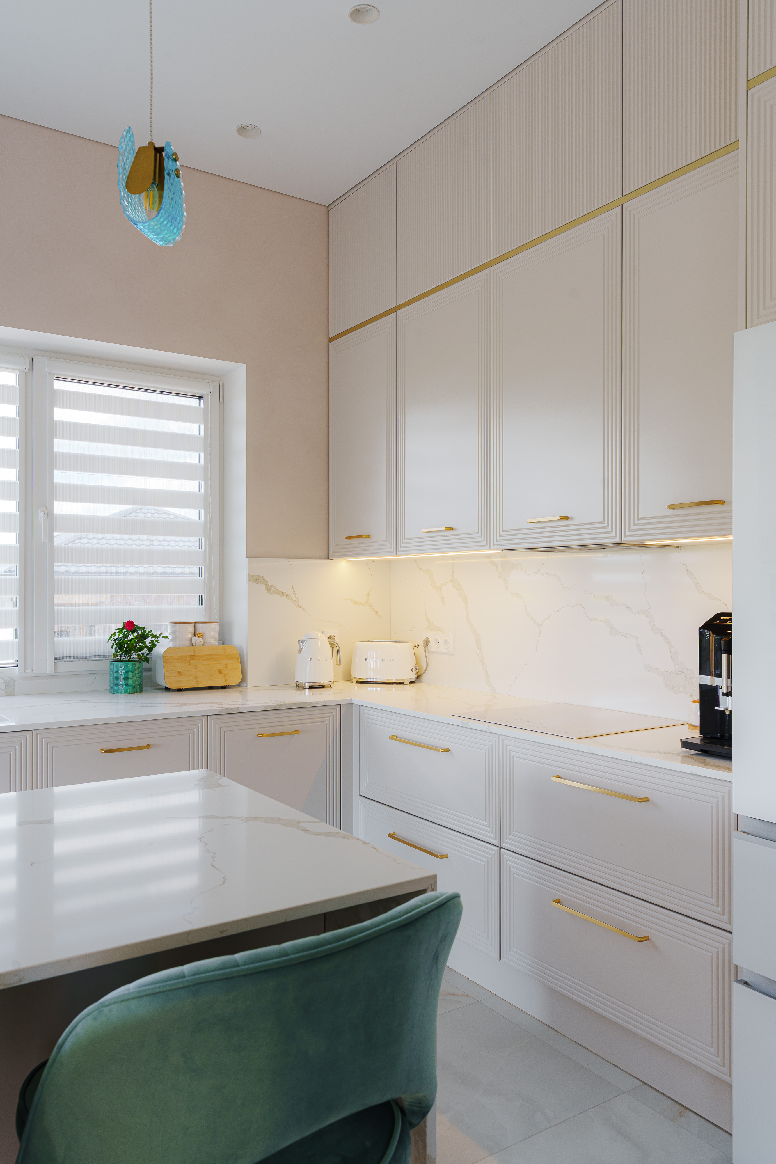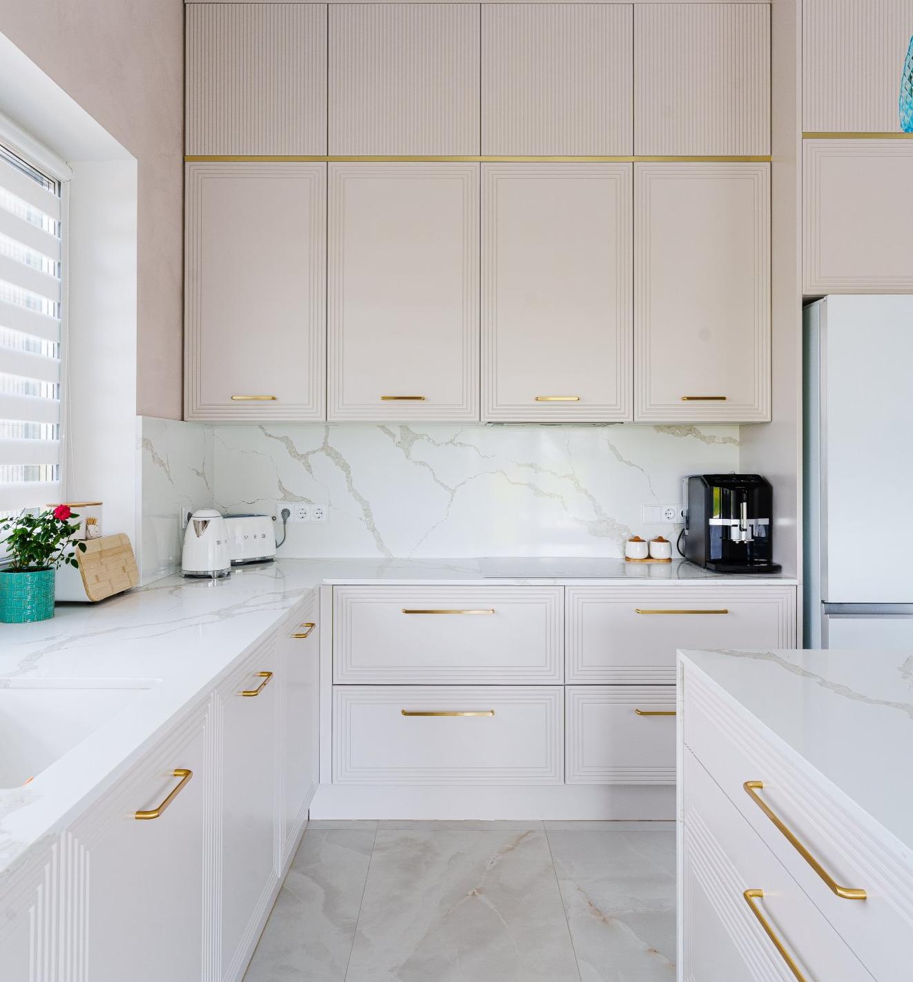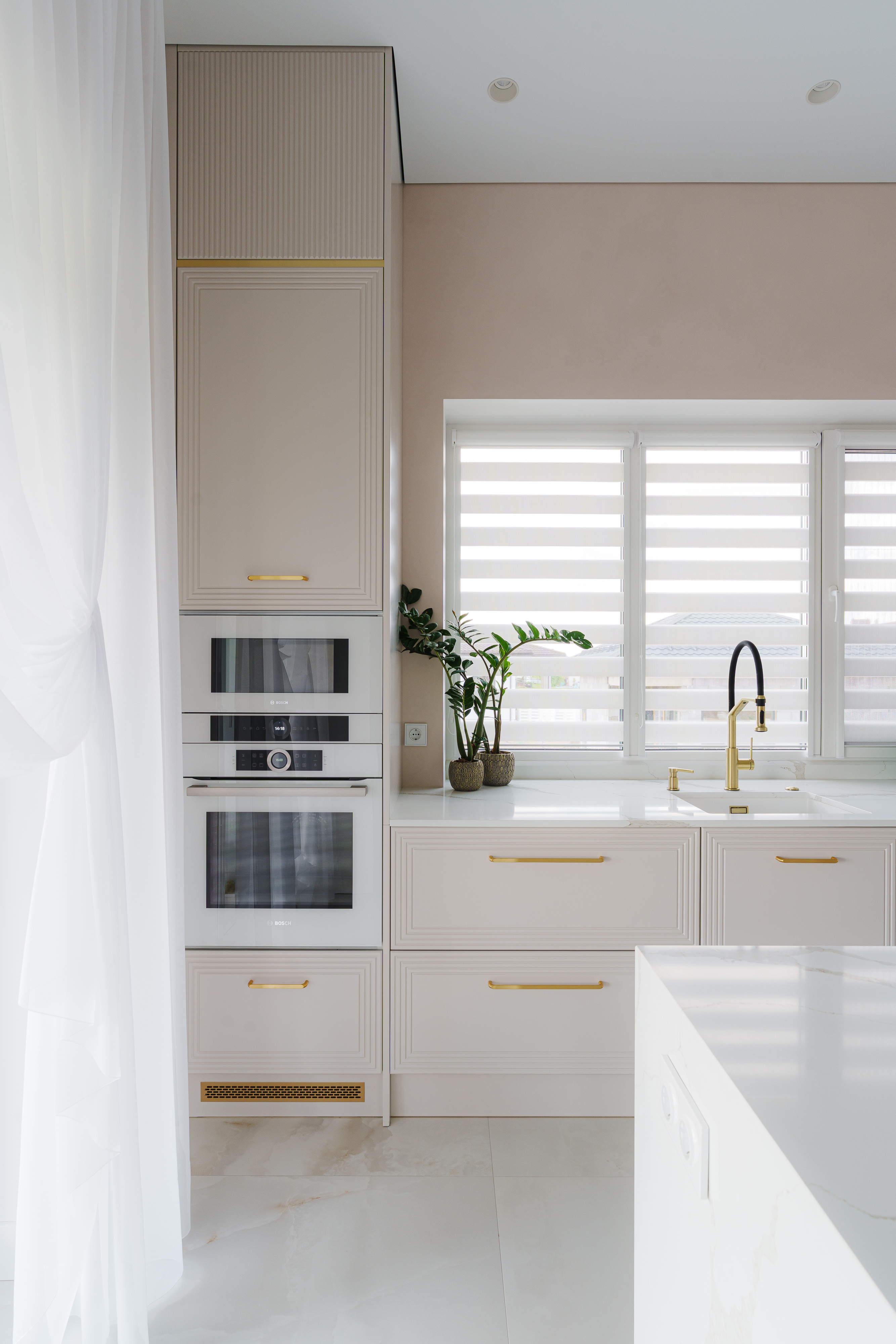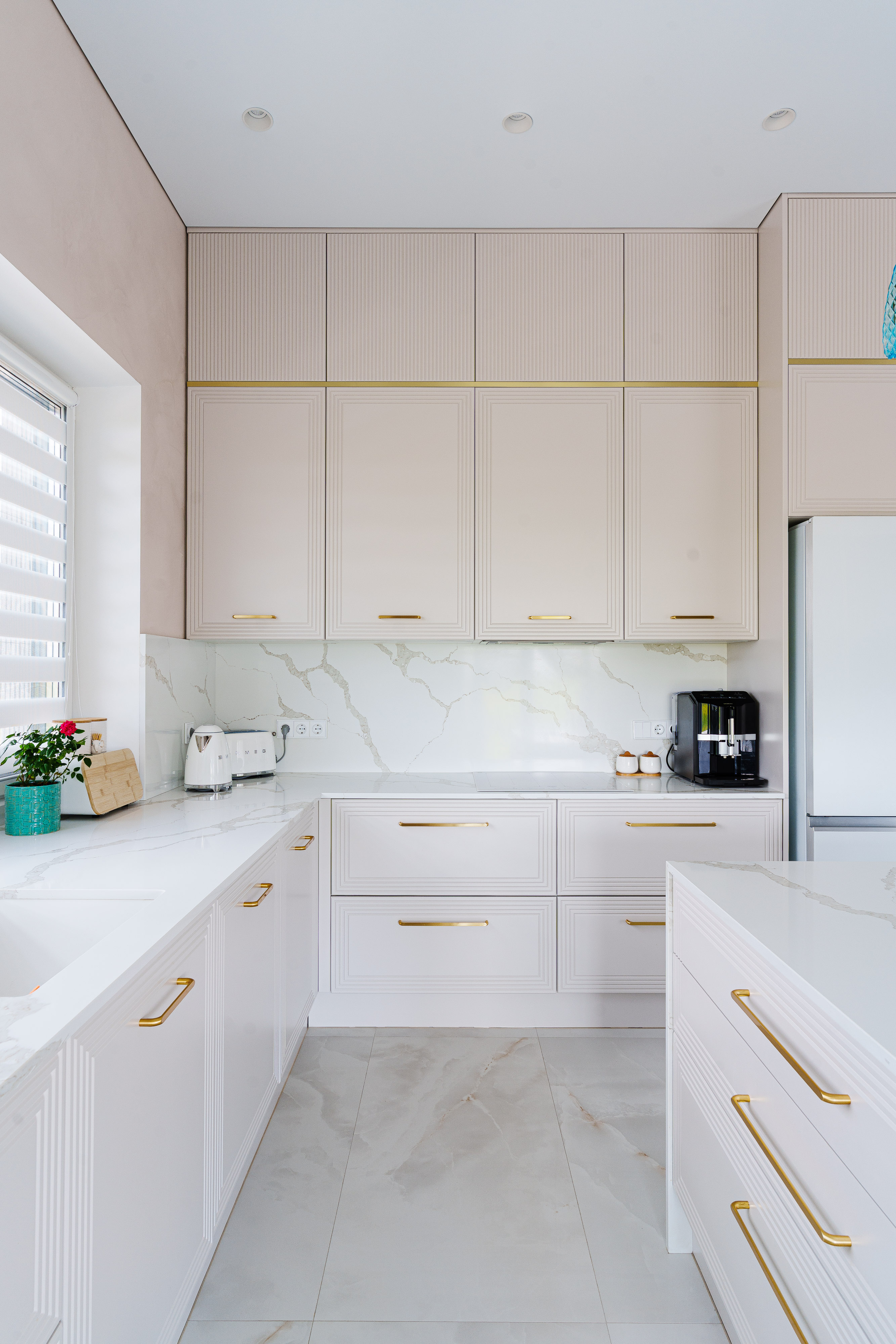 Легкая пудровая кухня Prizma с золотистыми элементами