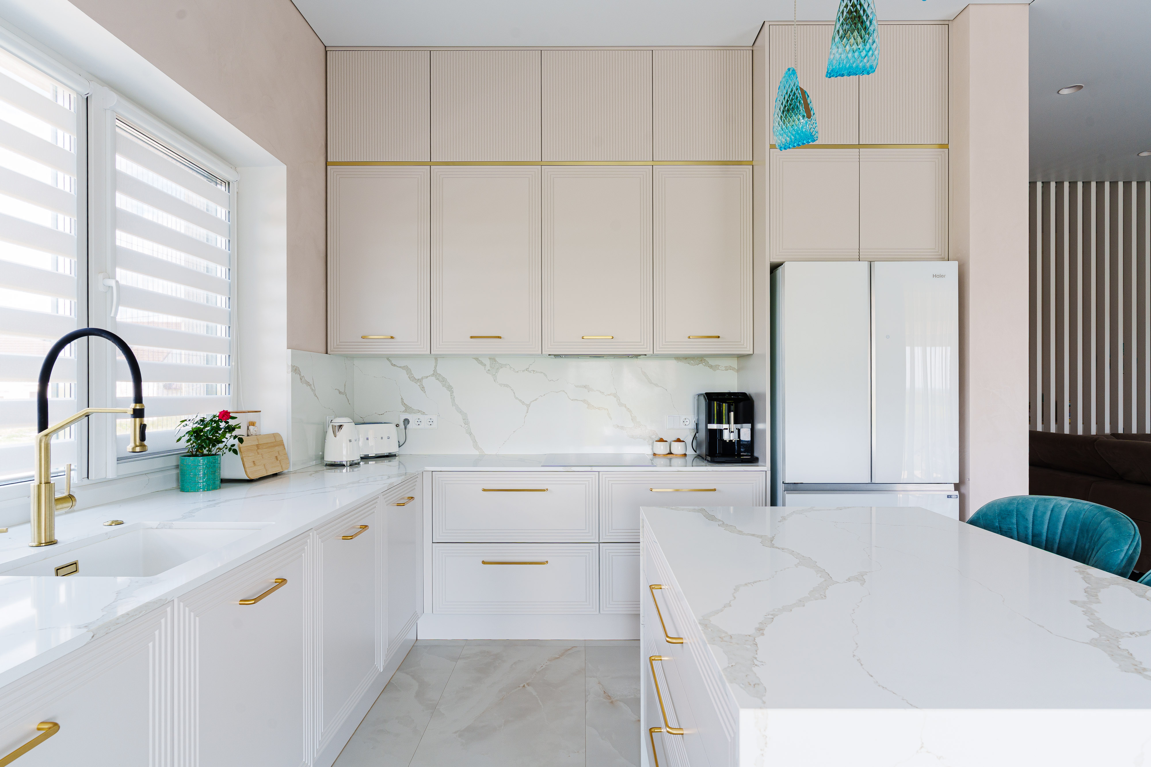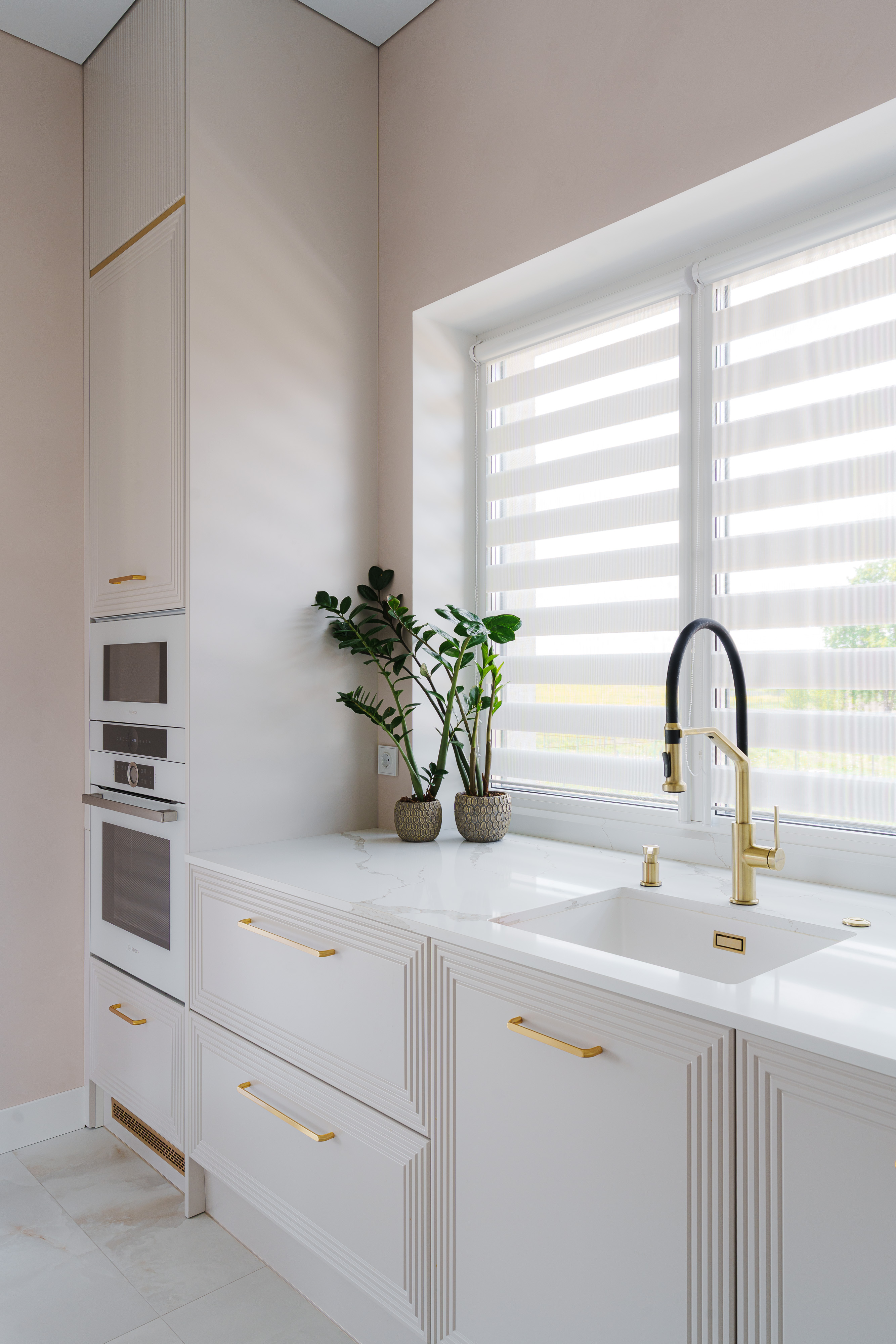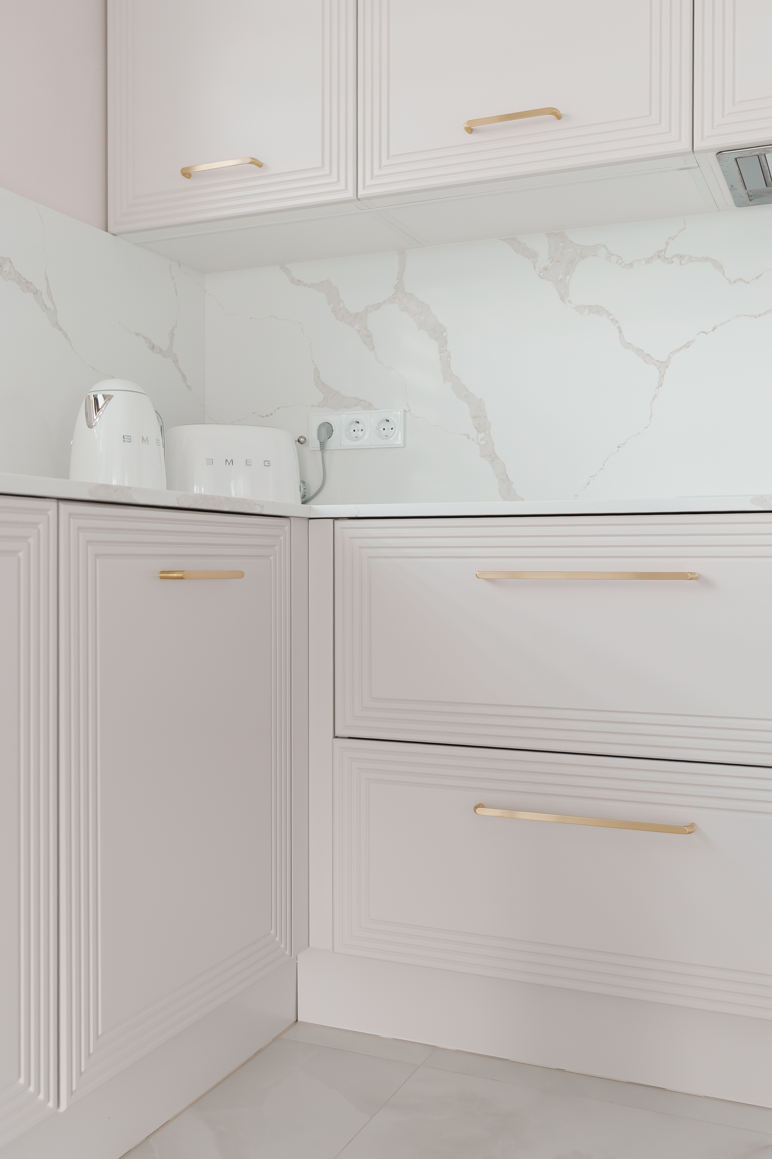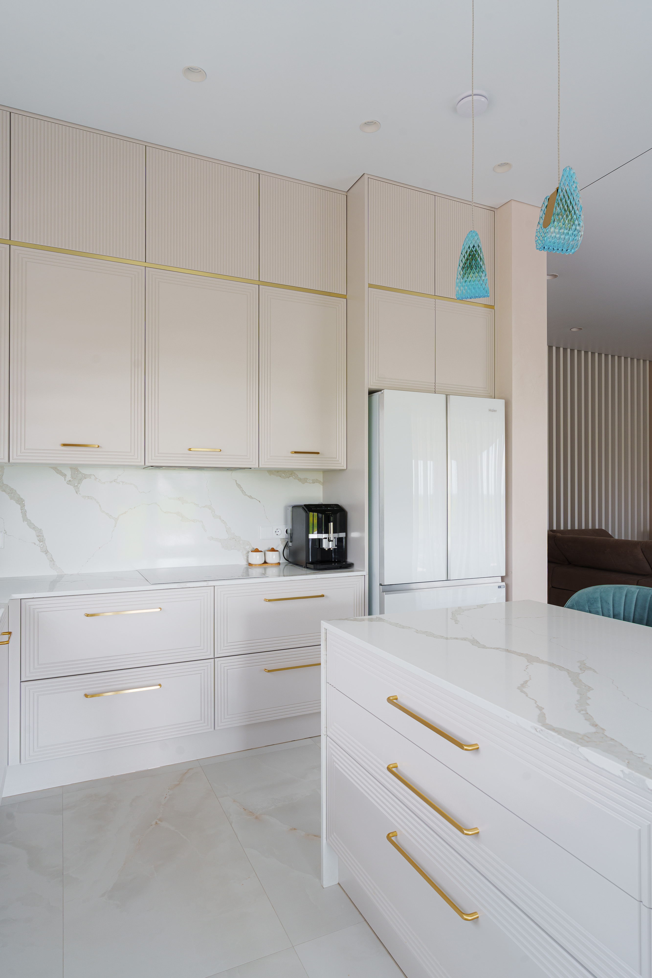 Легкая пудровая кухня Prizma с золотистыми элементами