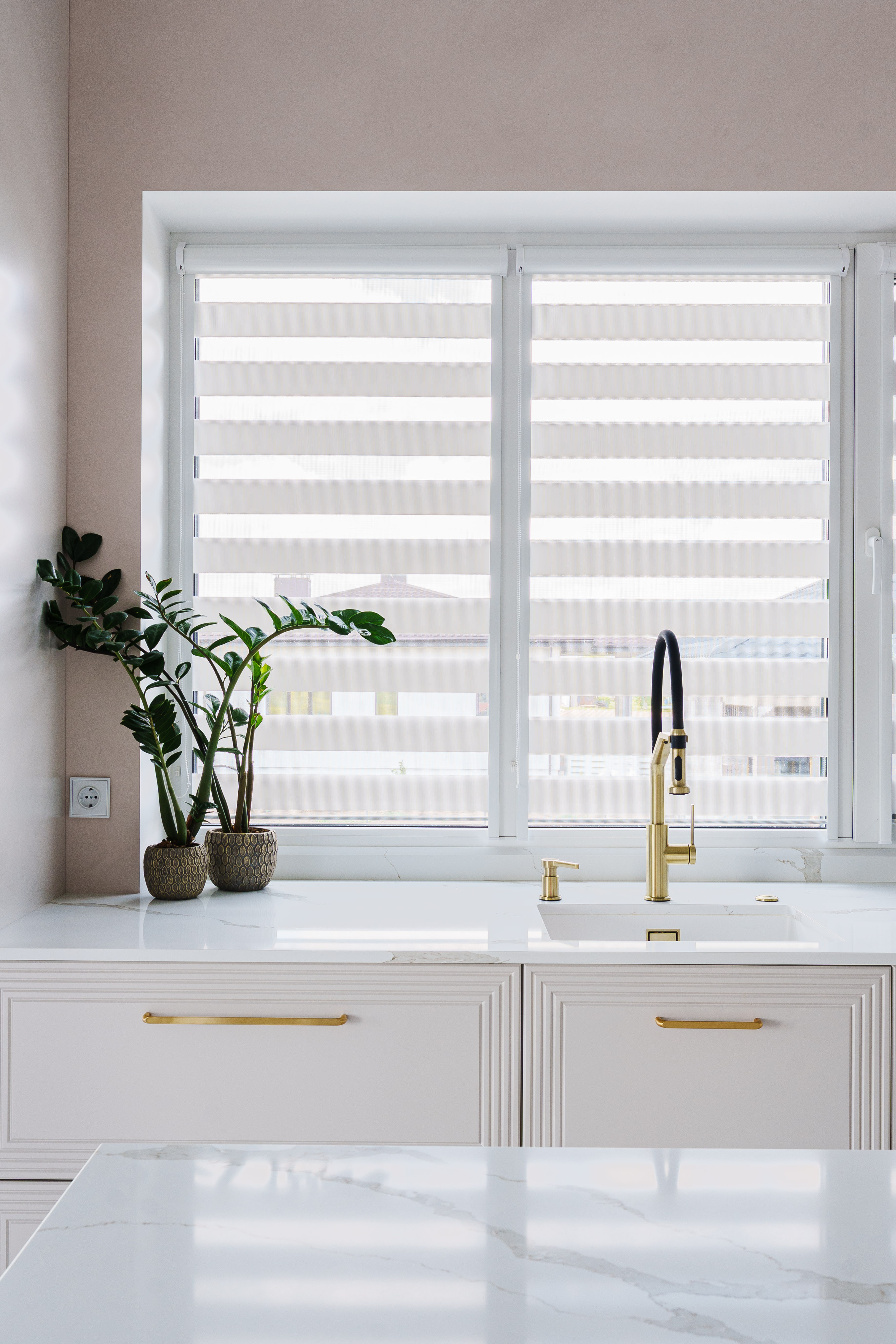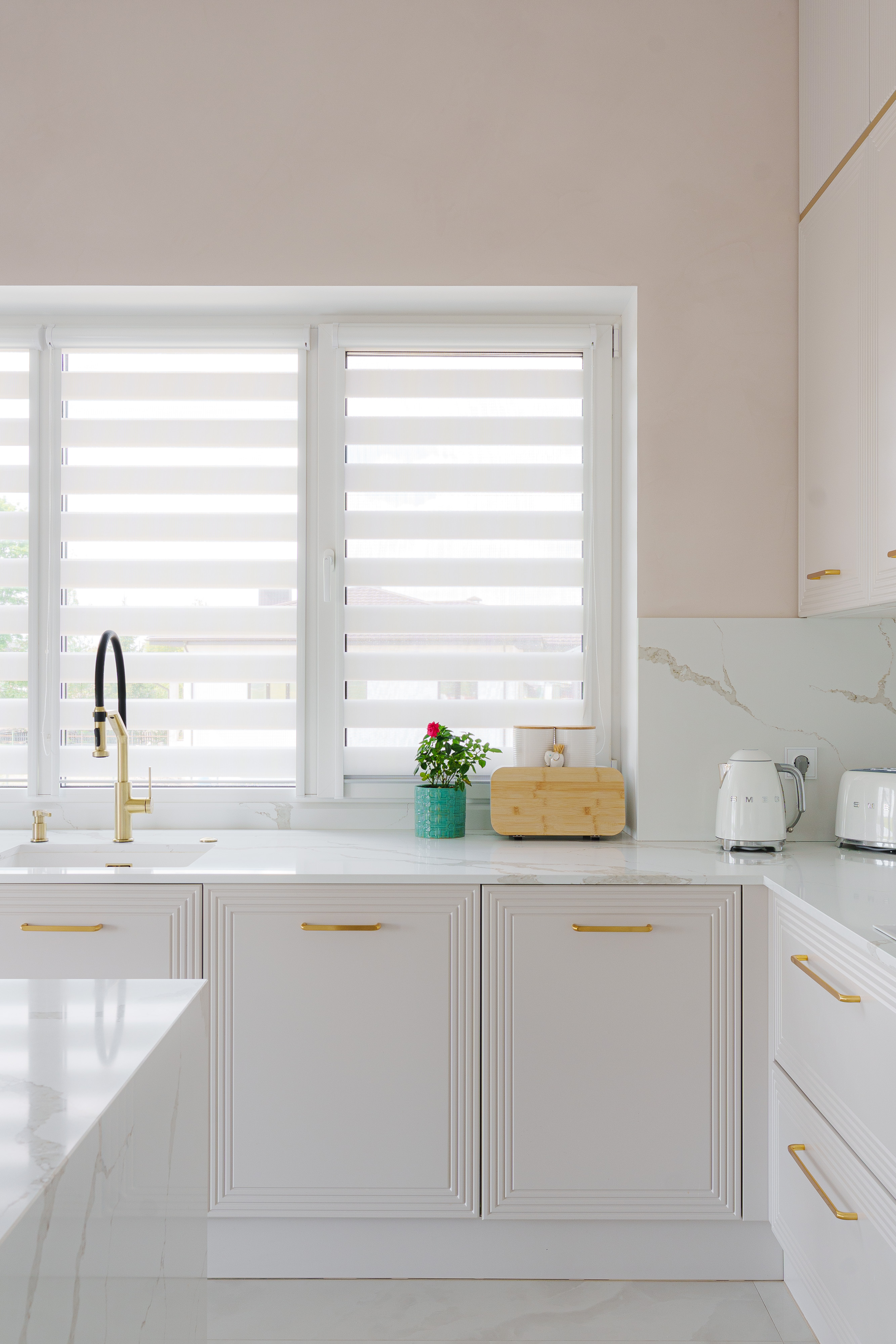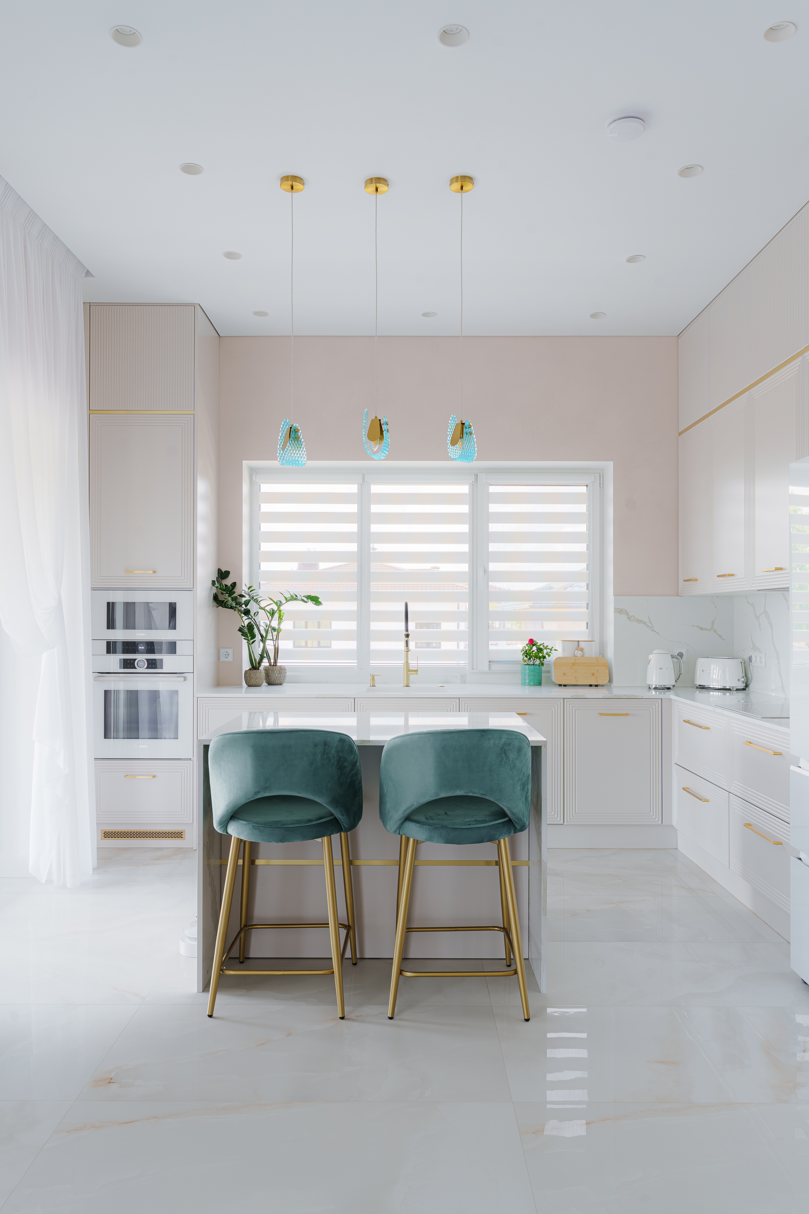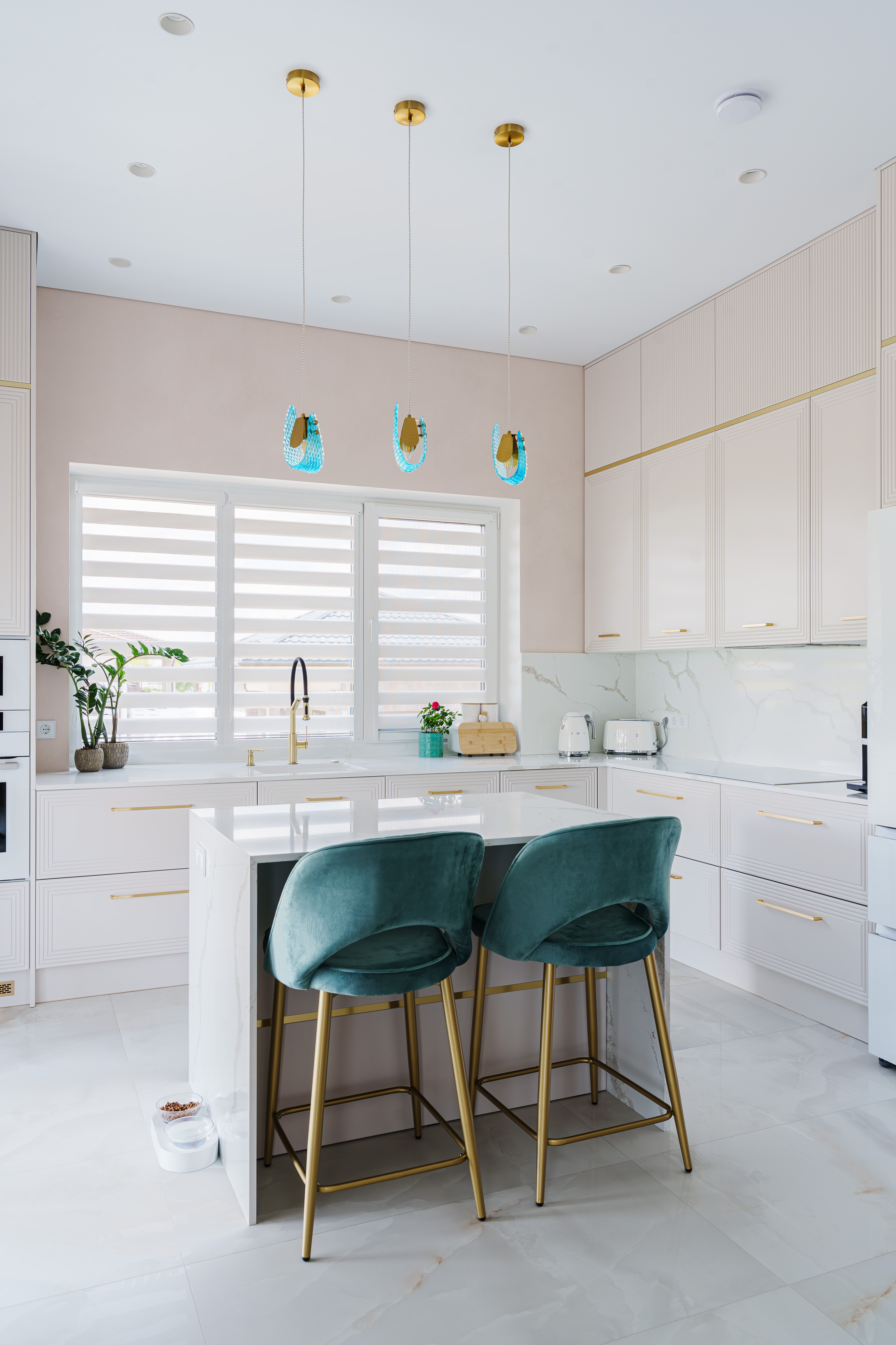 Легкая пудровая кухня Prizma с золотистыми элементами
