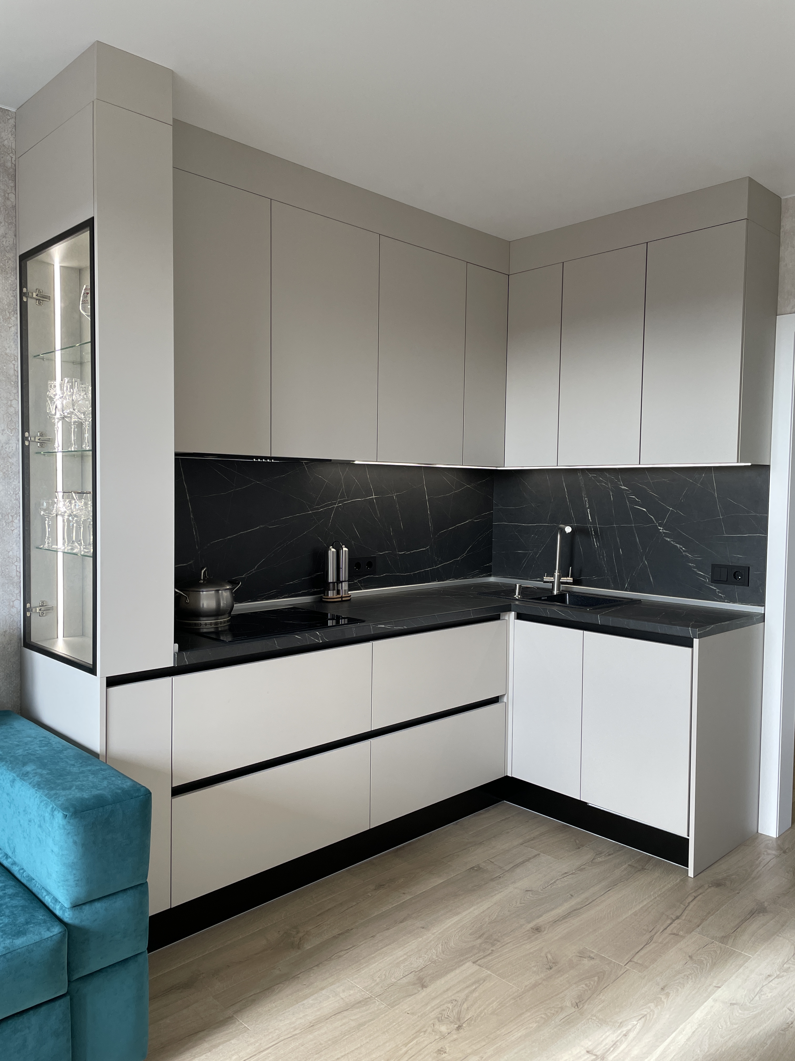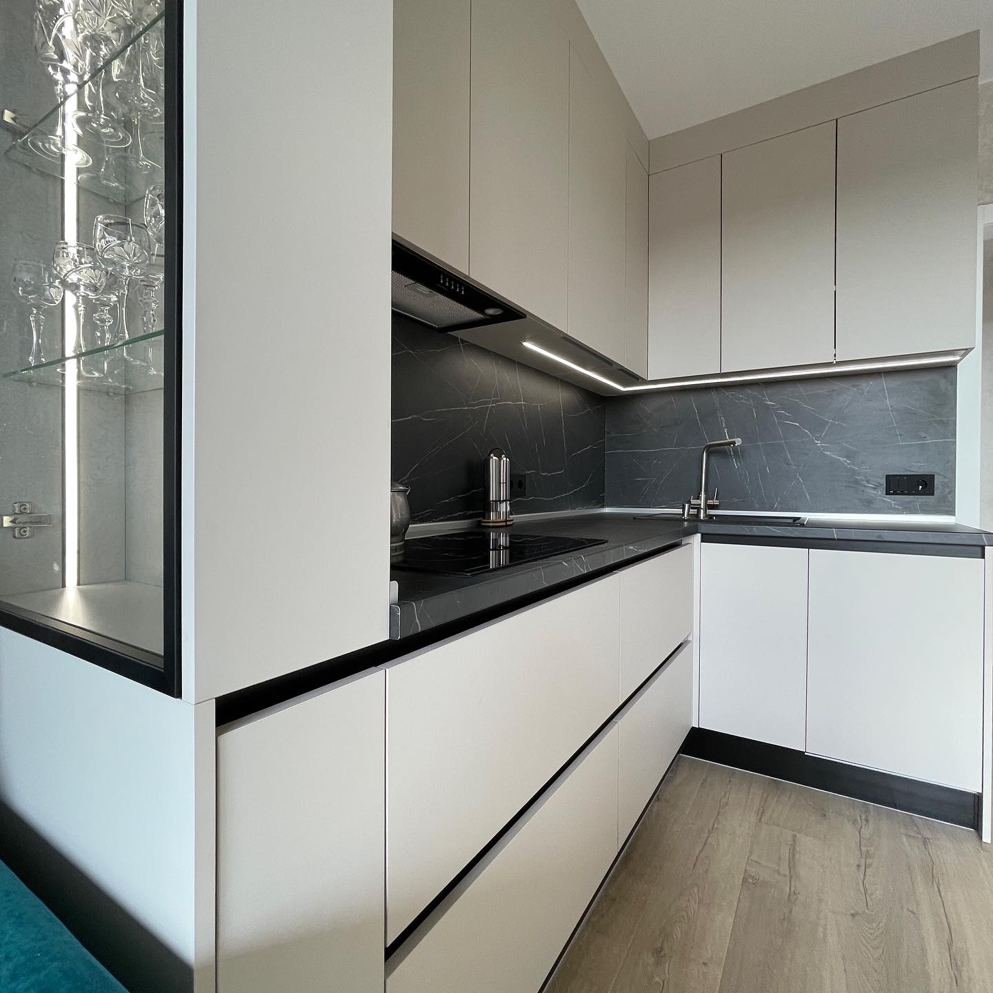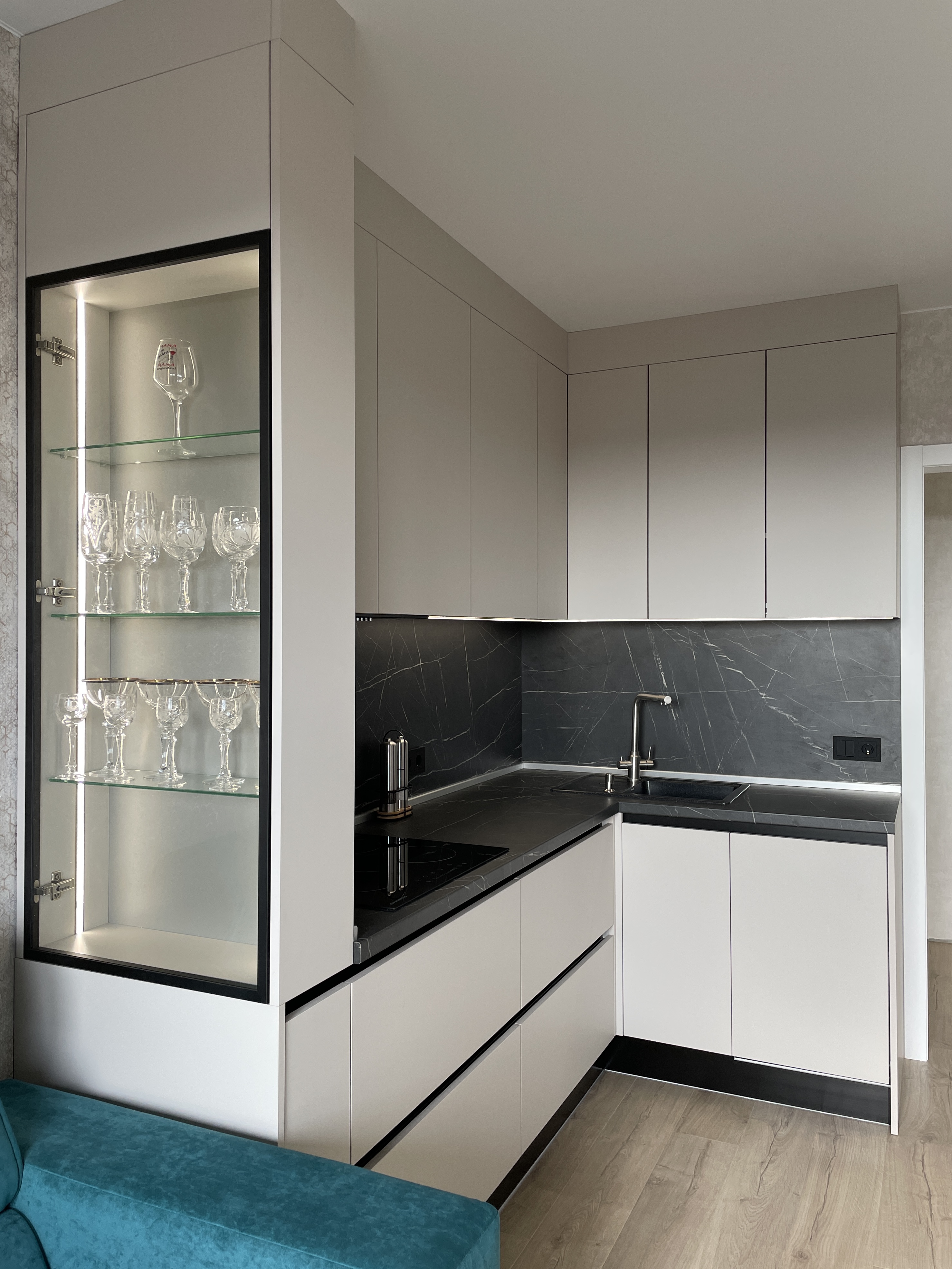 Фасады кухни выполнены из суперматового пластика AGT, торцевая витрина, зонирующая пространство на кухню и гостиную, выполнена из тонкого алюминиевого профиля. Вся рабочая зона и витрина хорошо освещены Led-подсветкой.