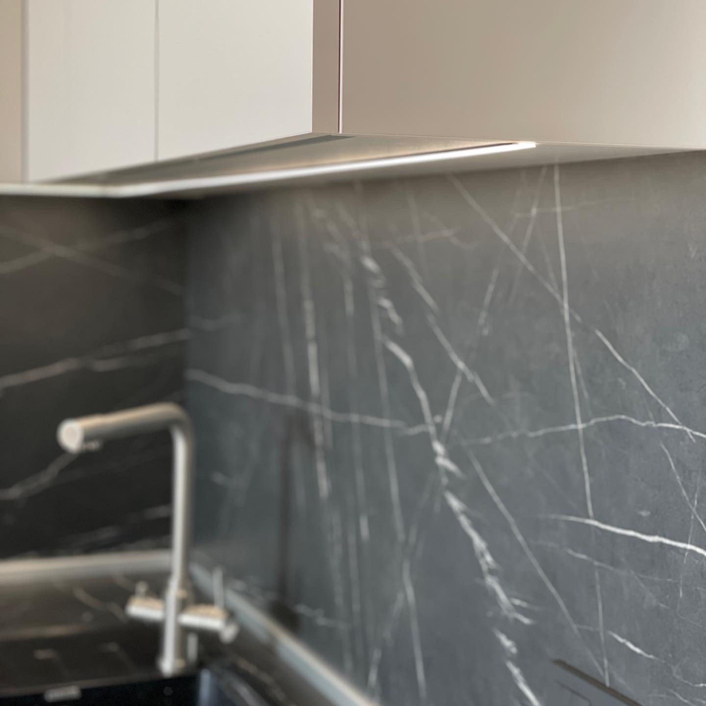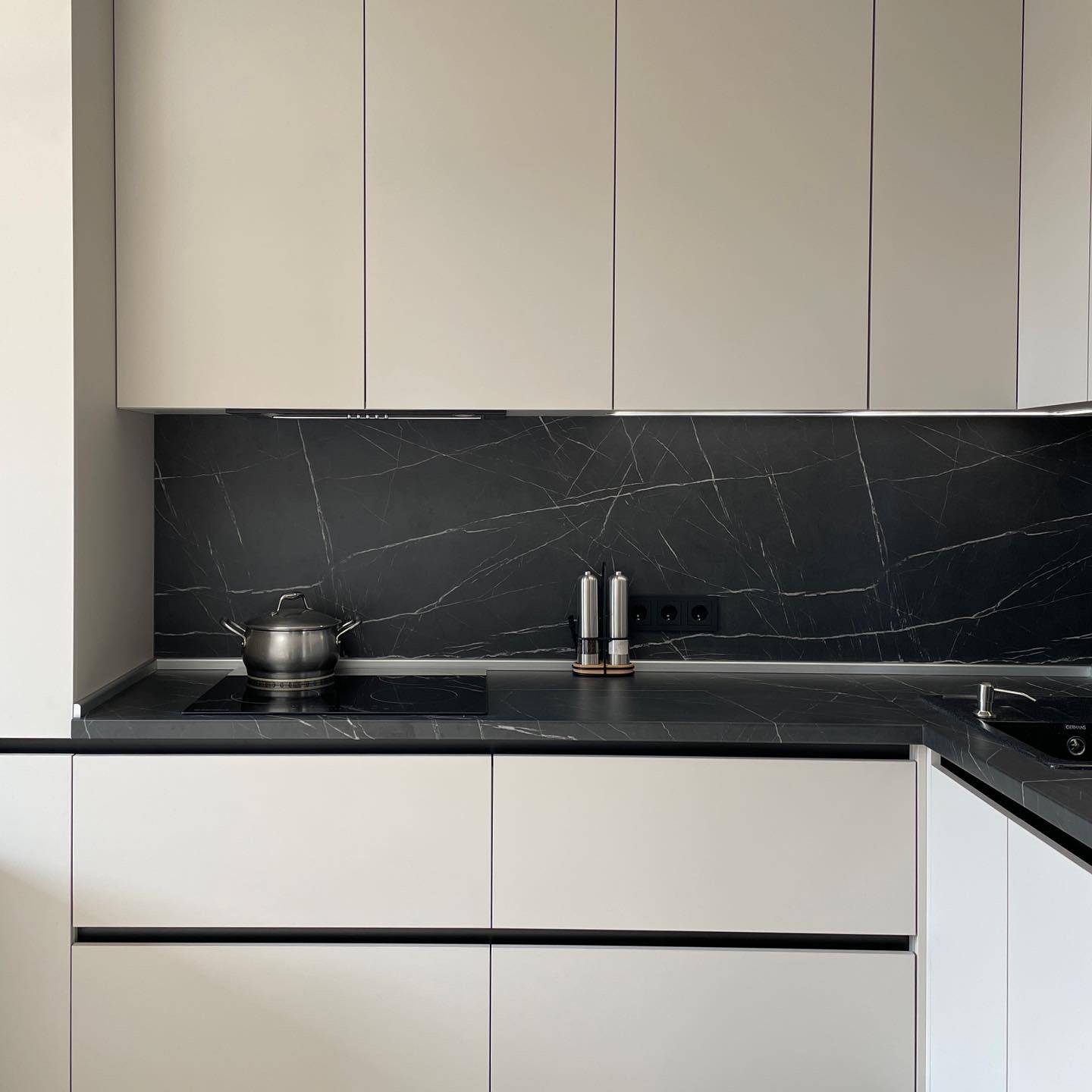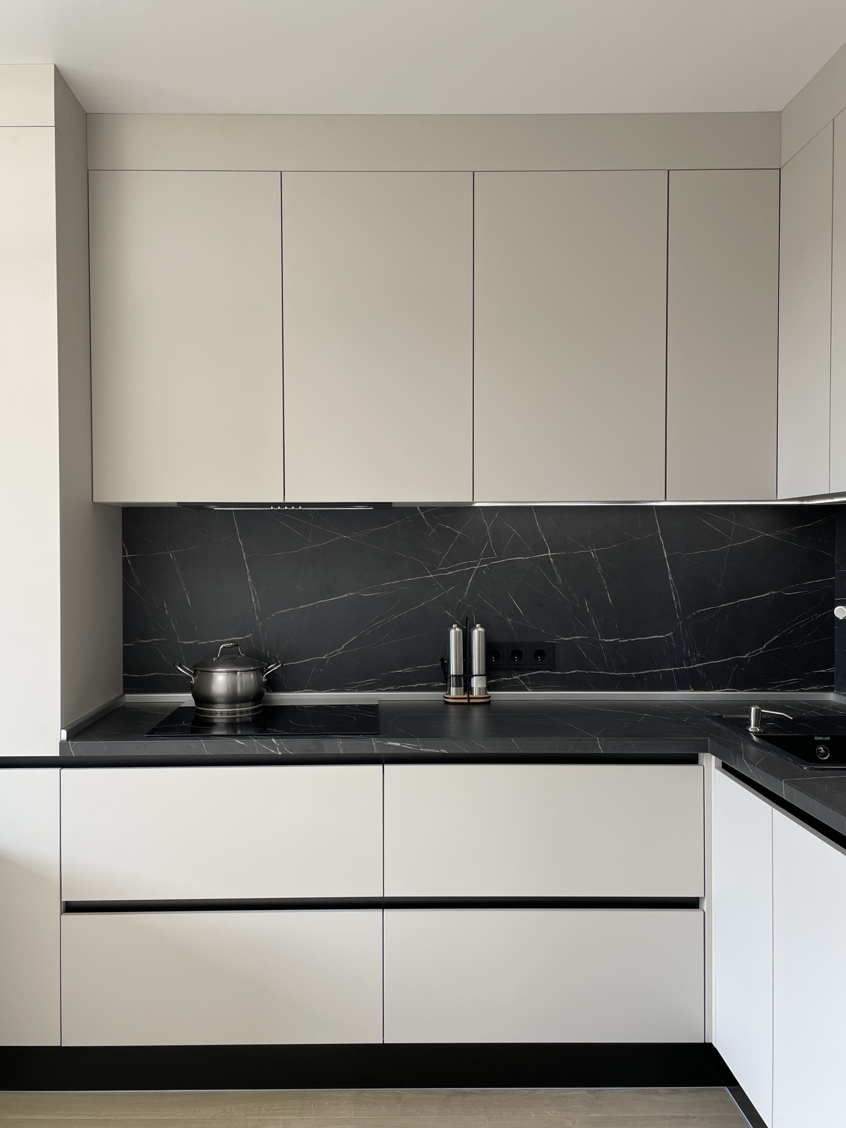 Фасады кухни выполнены из суперматового пластика AGT, торцевая витрина, зонирующая пространство на кухню и гостиную, выполнена из тонкого алюминиевого профиля. Вся рабочая зона и витрина хорошо освещены Led-подсветкой.